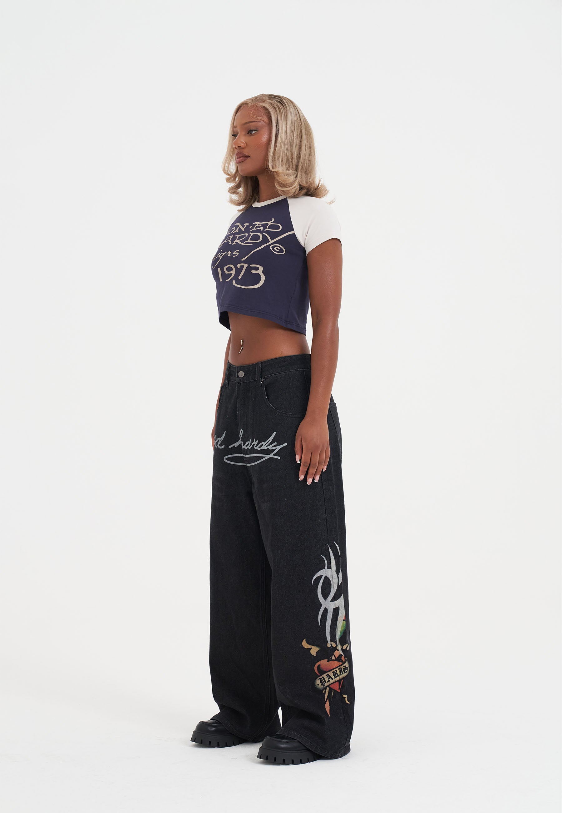 Womens Crystal Skull Straight Leg Denim Trousers Jeans - Black