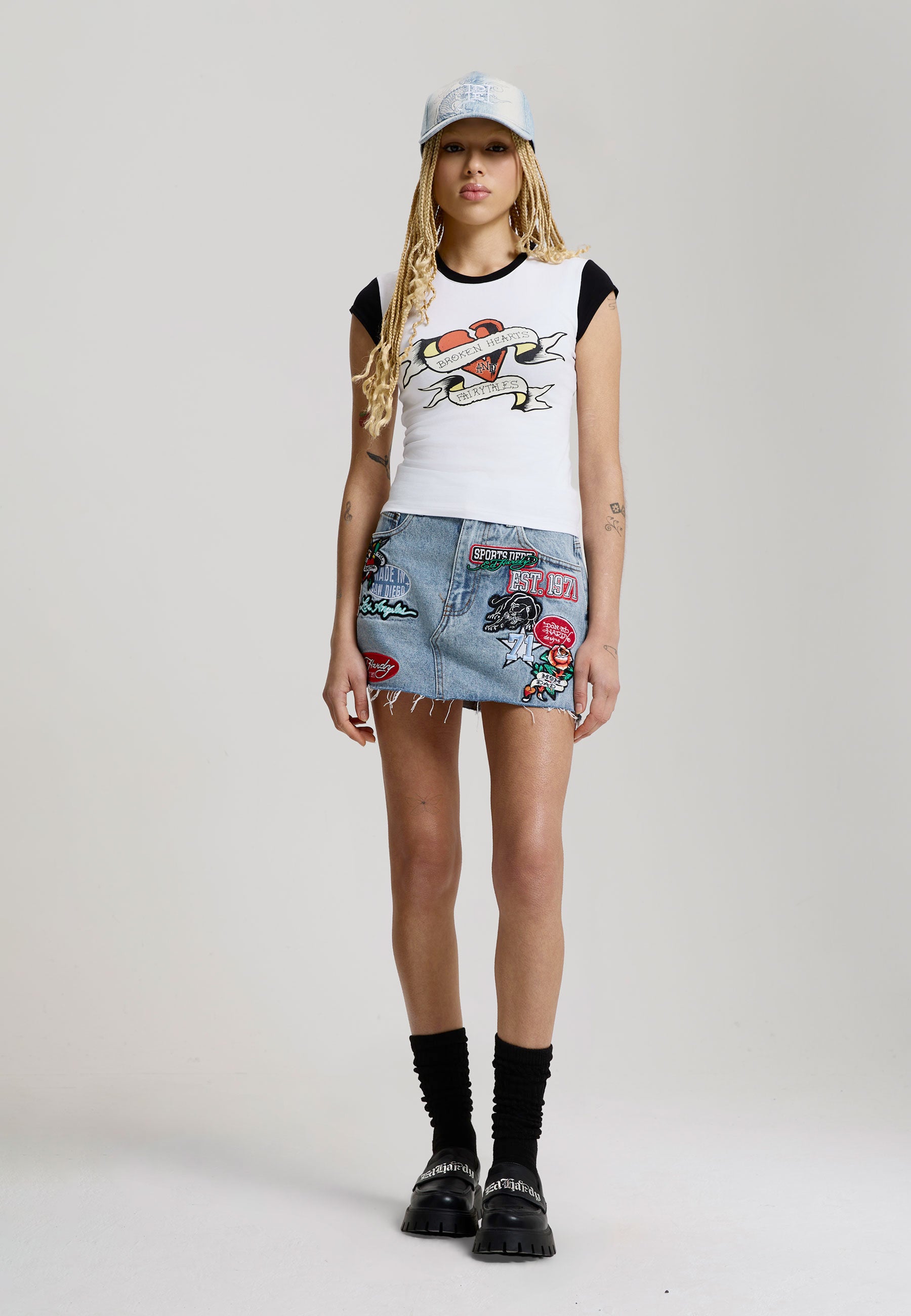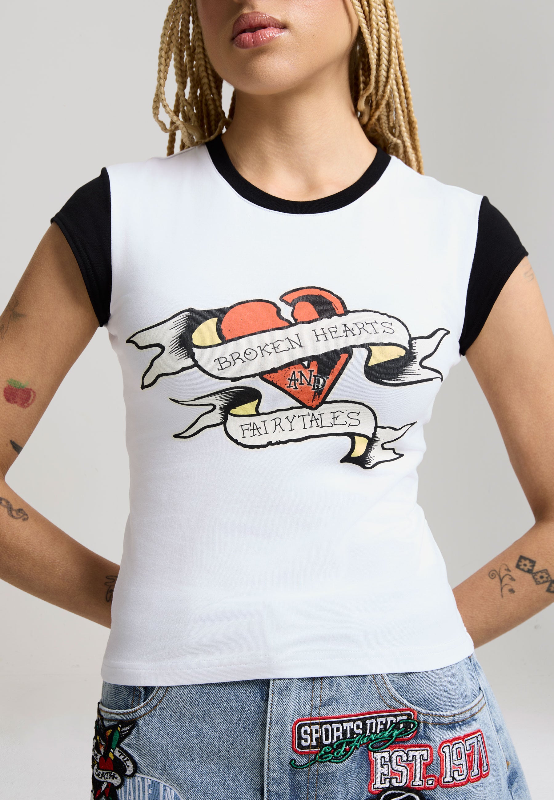 Womens Broken Hearts Contrast Fitted Baby Tee - White