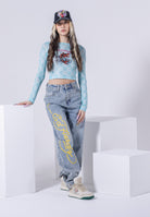 Jeans United: Erinnert an die klassischen Y2K-Denim-Silhouetten, die man von Ed erwarten würde. Mit einem hochauflösenden Druck der Wolfsgrafik „Born To Be Wild“ an der Basis der Wade.