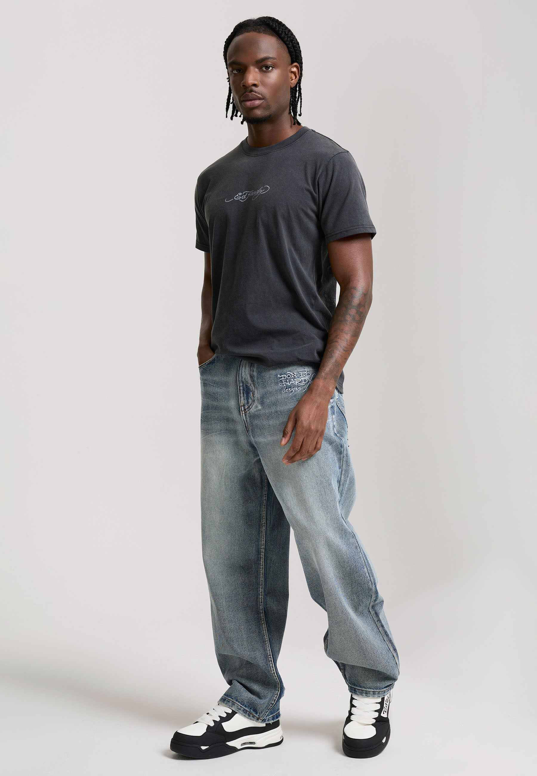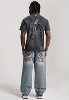 Mens Embroidered Panther Relaxed Jeans in Blue Blasted Wash
