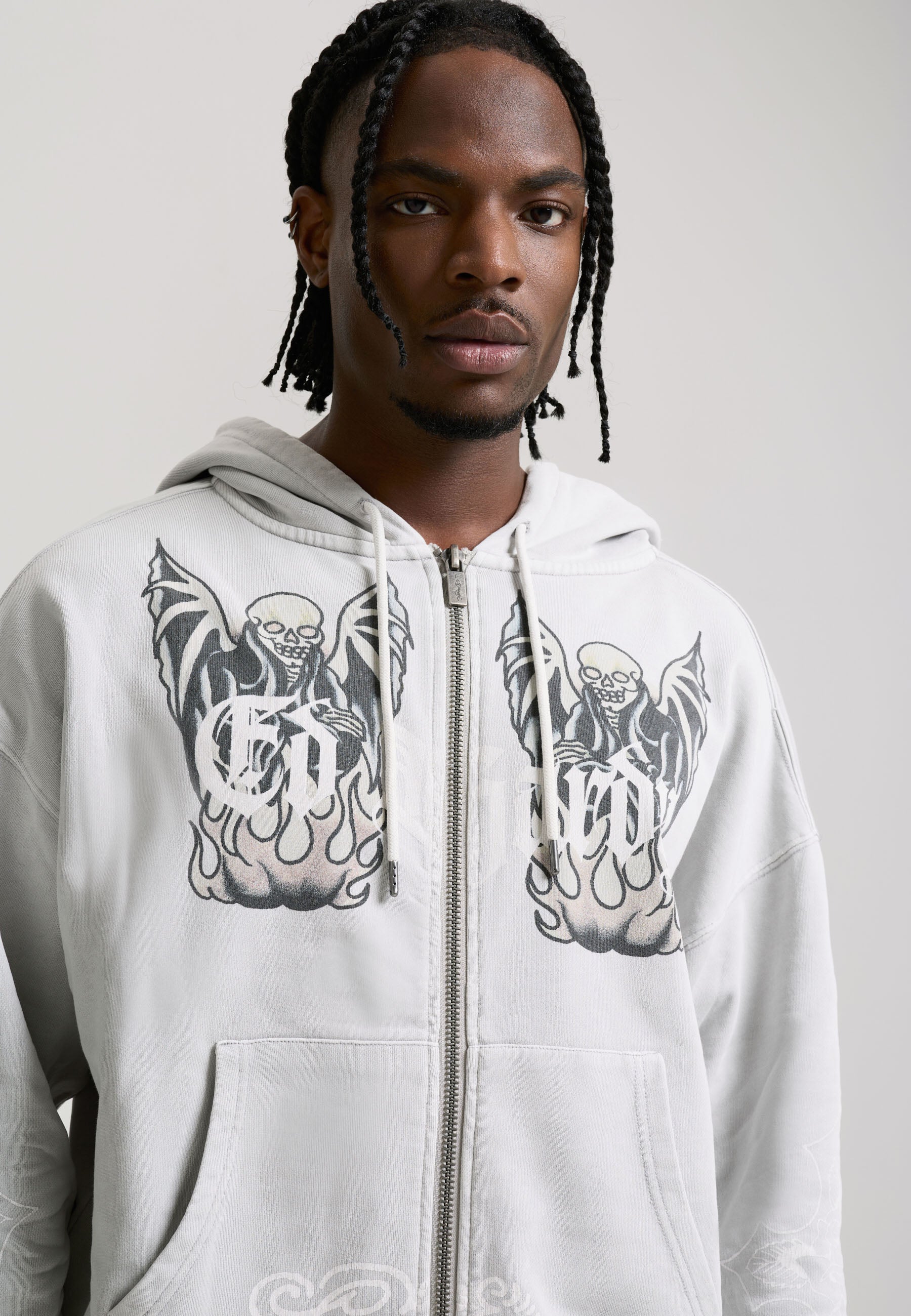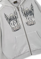 Mens Gothic Skull Boxy Zip Thru Hoodie - Grey