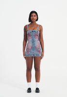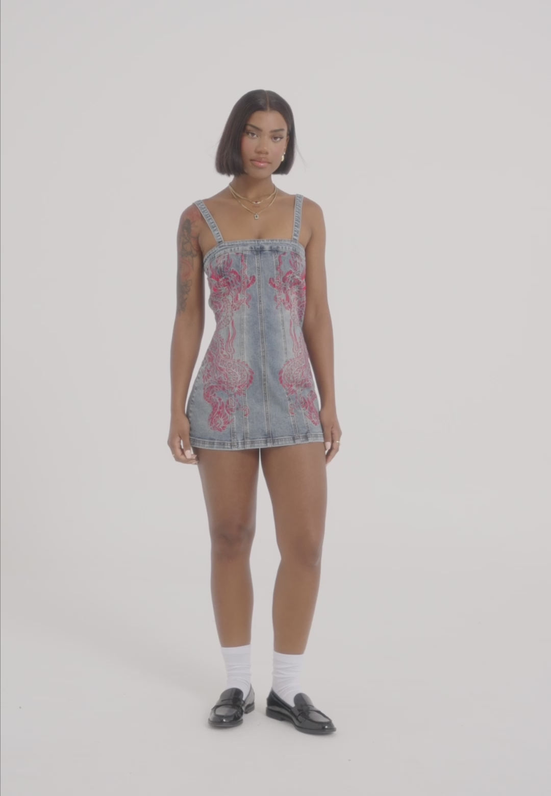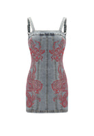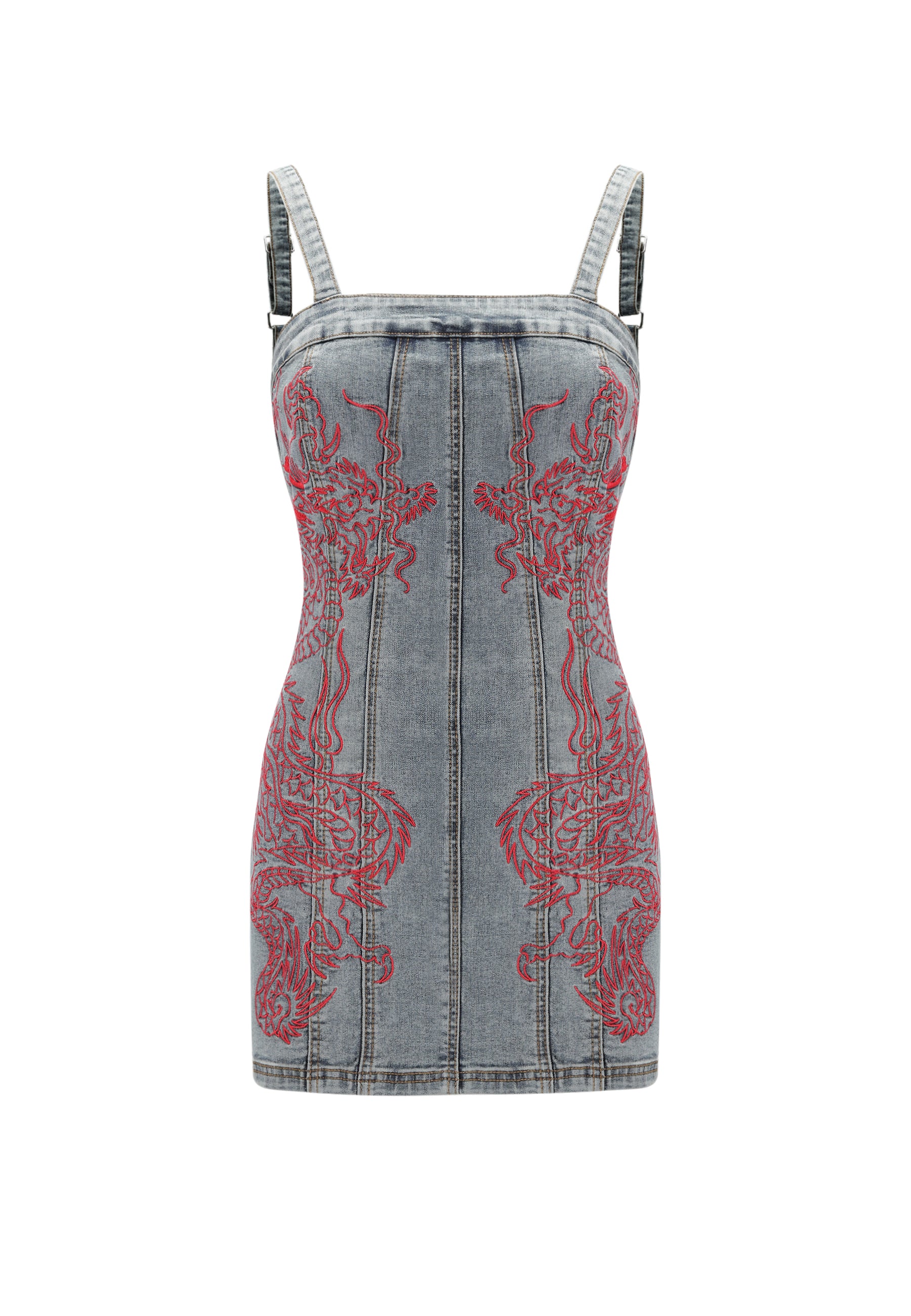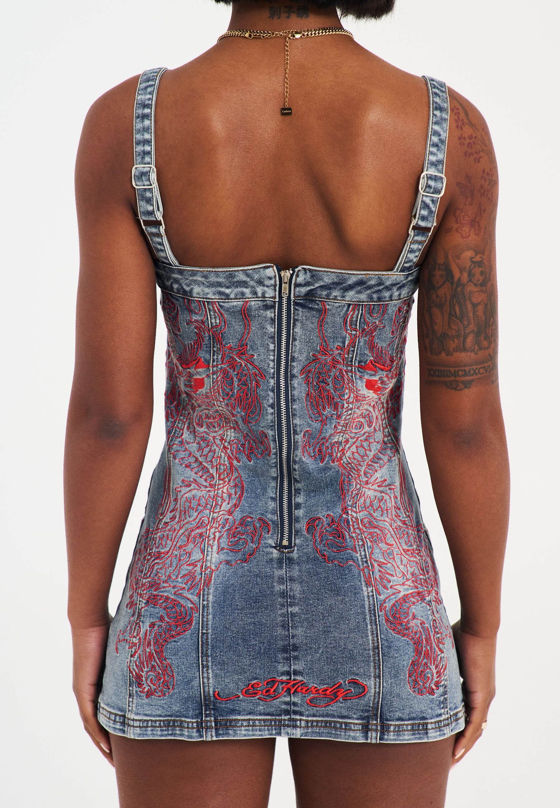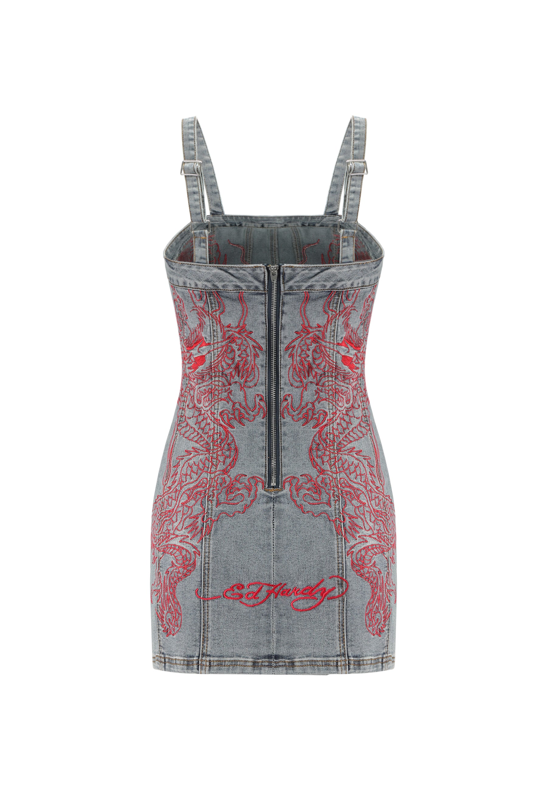 This ultra-mini dress in mid-blue washed denim features striking mirrored dragon flame embroidery from the Ed Hardy tattoo archive, featured on both the front and back. Designed for a tight fit, it includes adjustable straps for a customized look and a center-back zip closure for easy wear. Finished with Ed Hardy's signature logo on the back hem, this dress is bold and iconic.