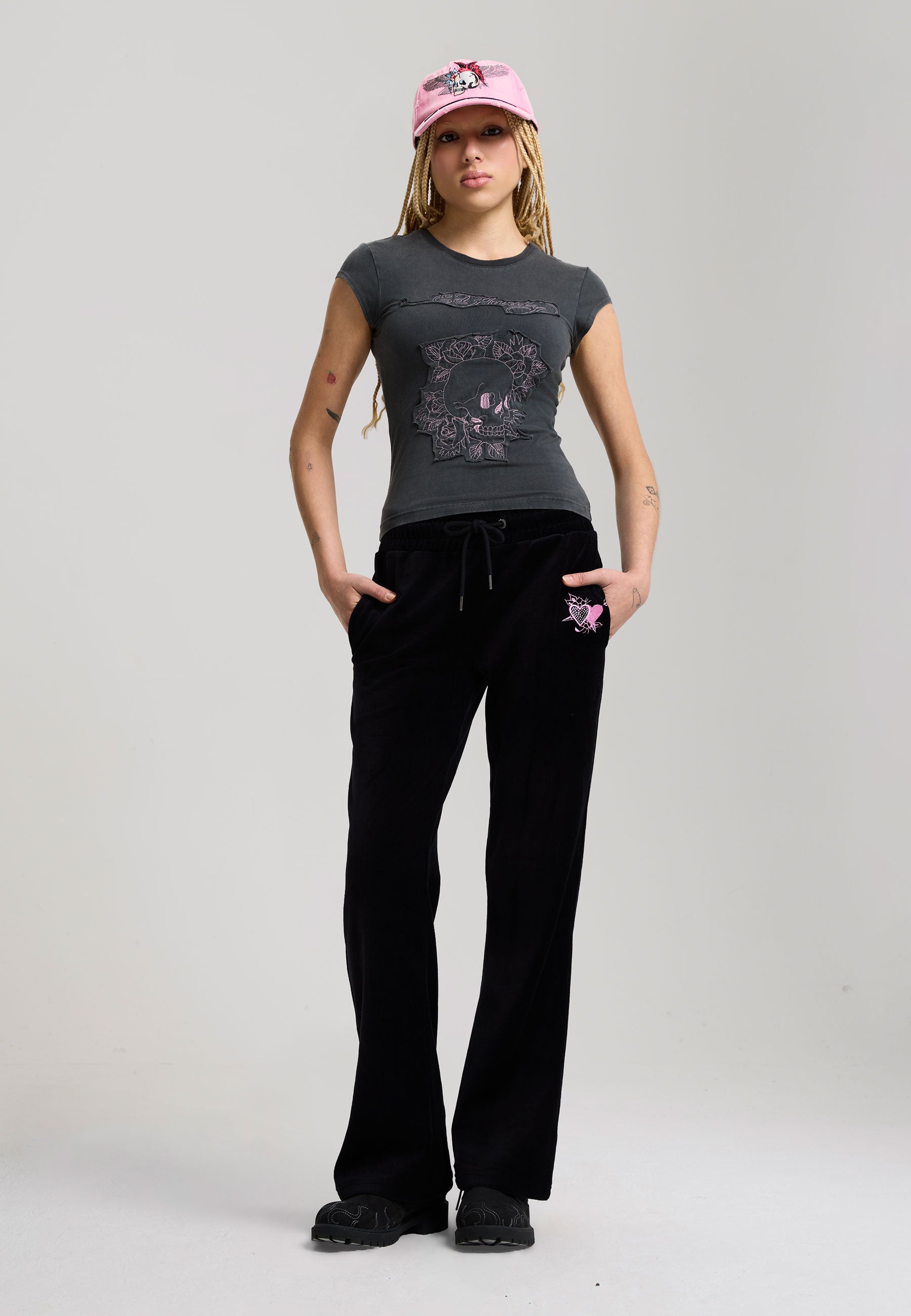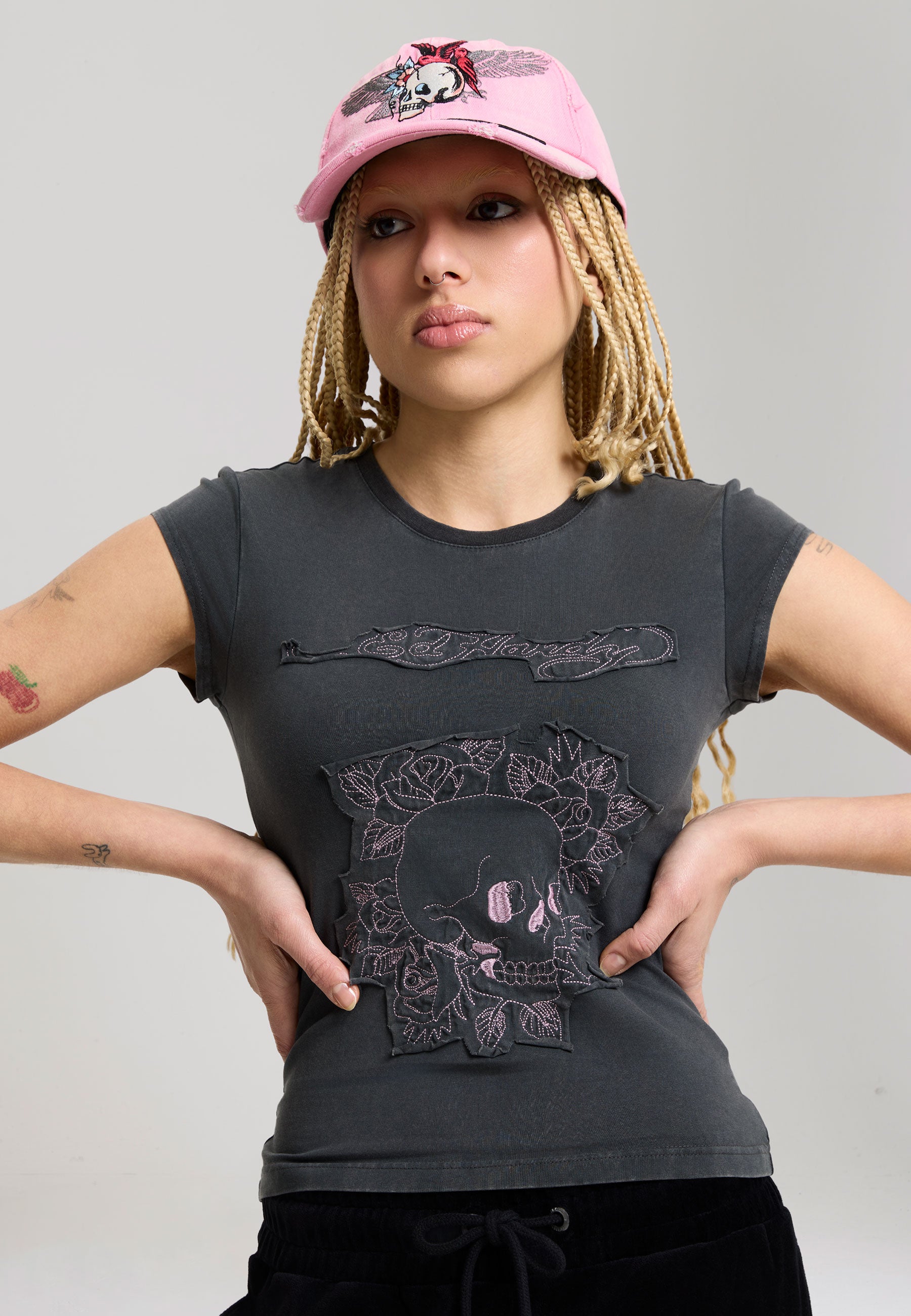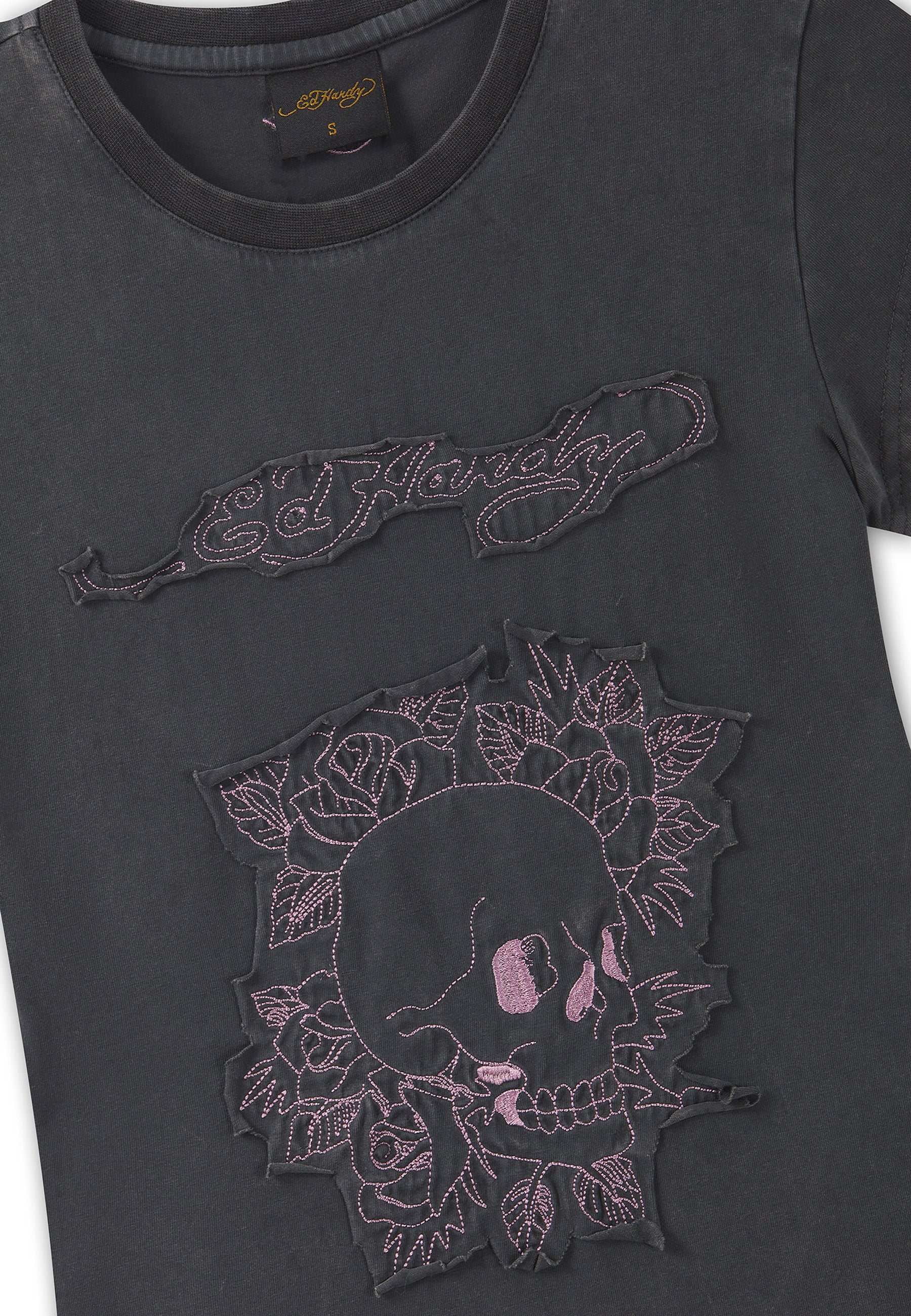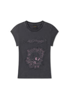 Womens Floral Skull Self Applique Cap Sleeve - Charcoal