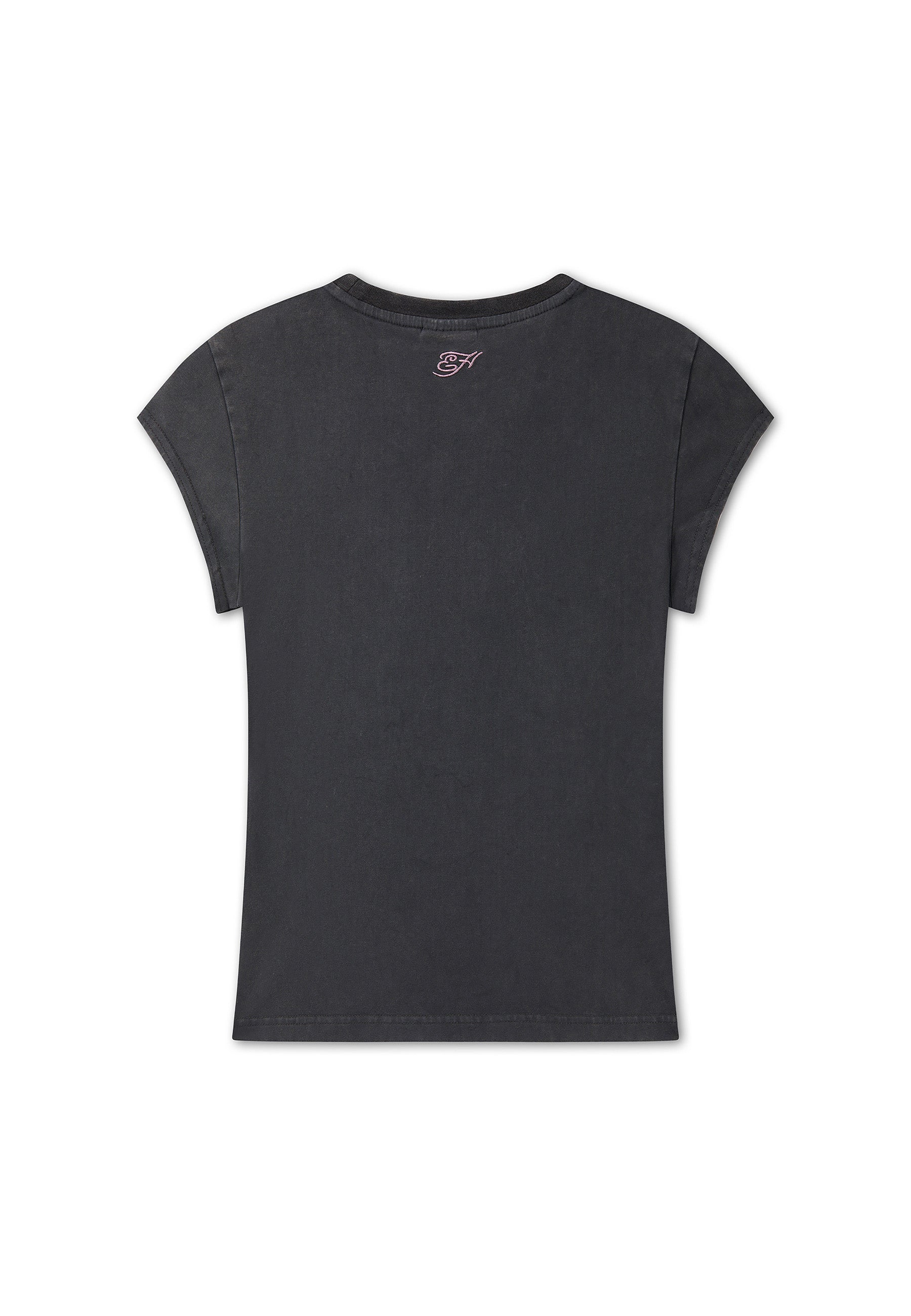 CAP SLEEVE SELF FABRIC APPLIQUE AND STITCH TO FRONT EG LOGO EMBROIDERY TO BACK NECK COTTON ELASTANE MIX