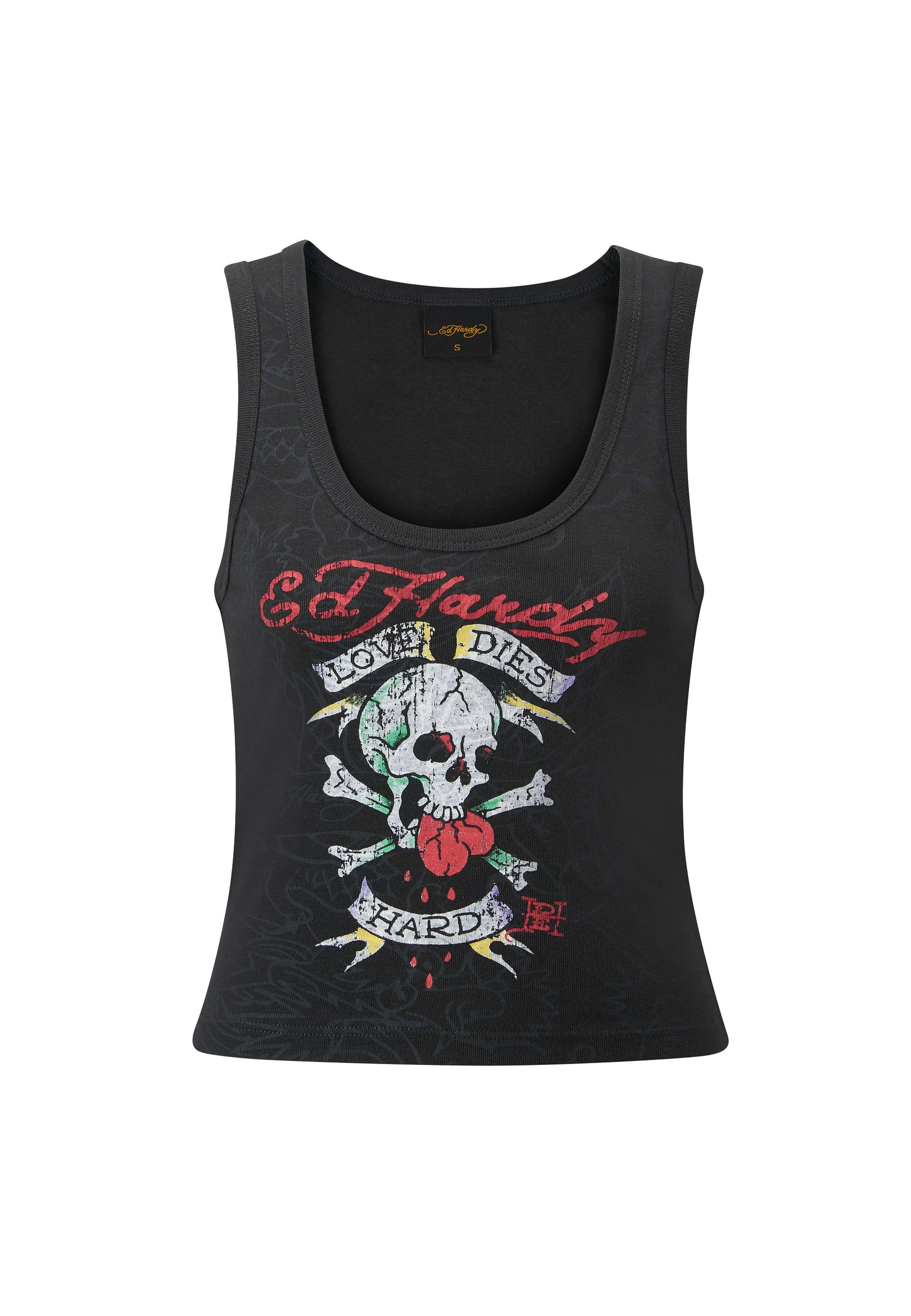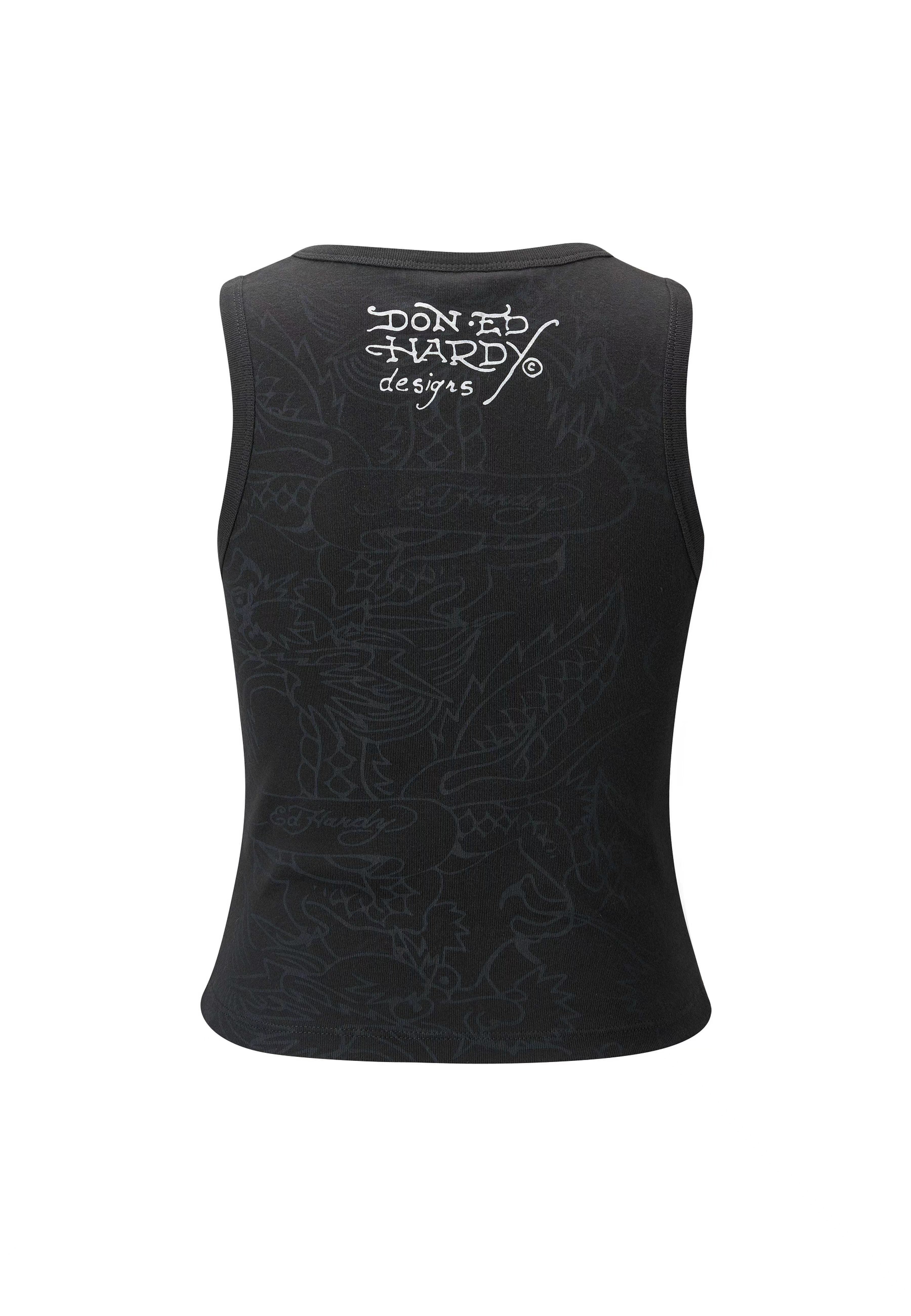 A classic charcoal vest gets the Ed Hardy treatment: a tattoo-inspired “Love Dies Hard” skull and bleeding heart graphic, light grey shadow print all over, and the Don’s signature in logo in blood red across the chest and upper back.