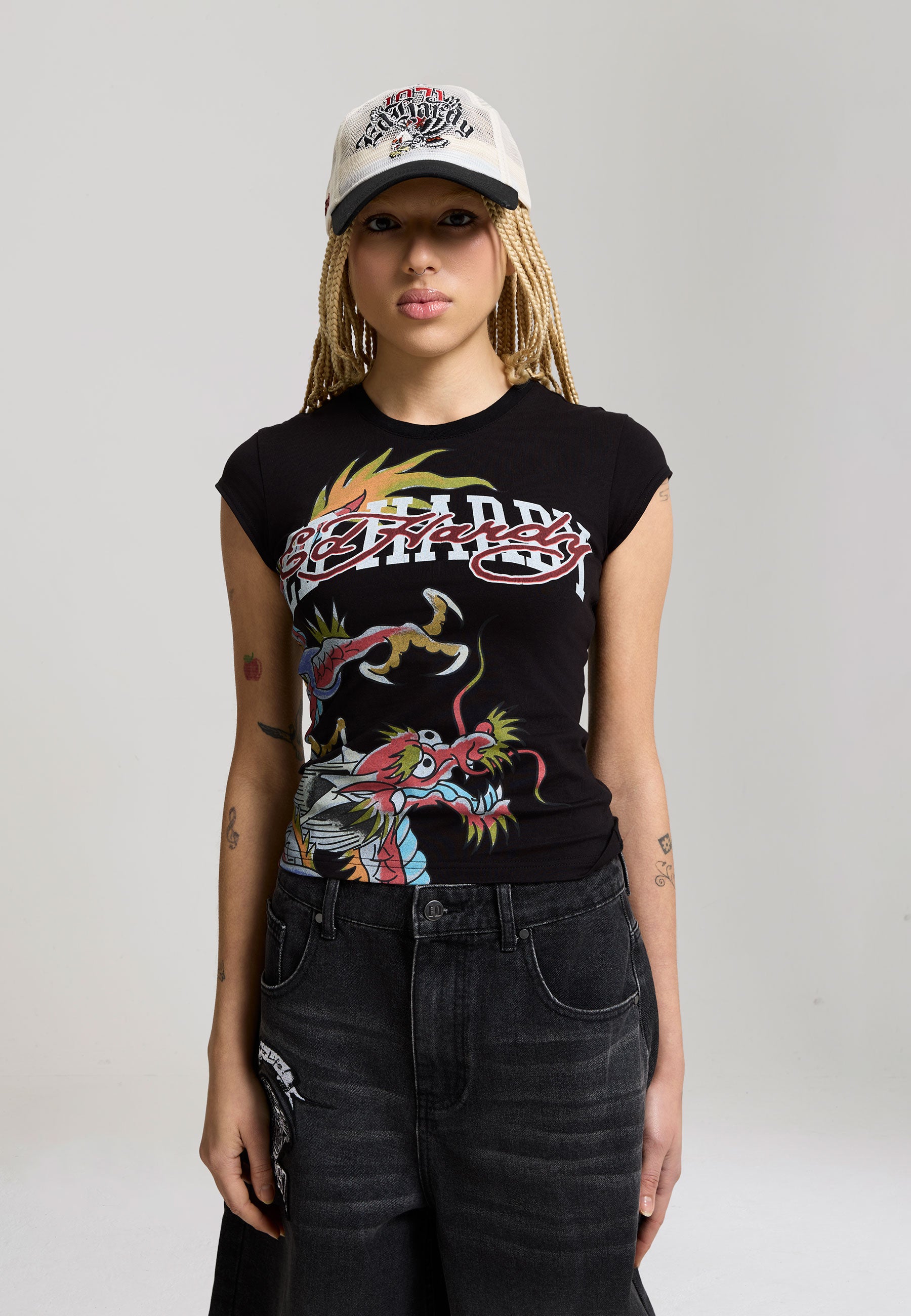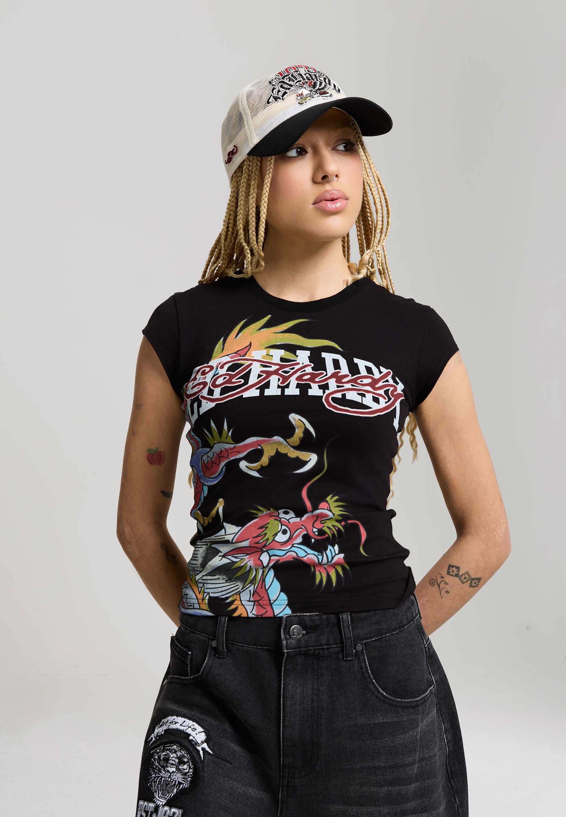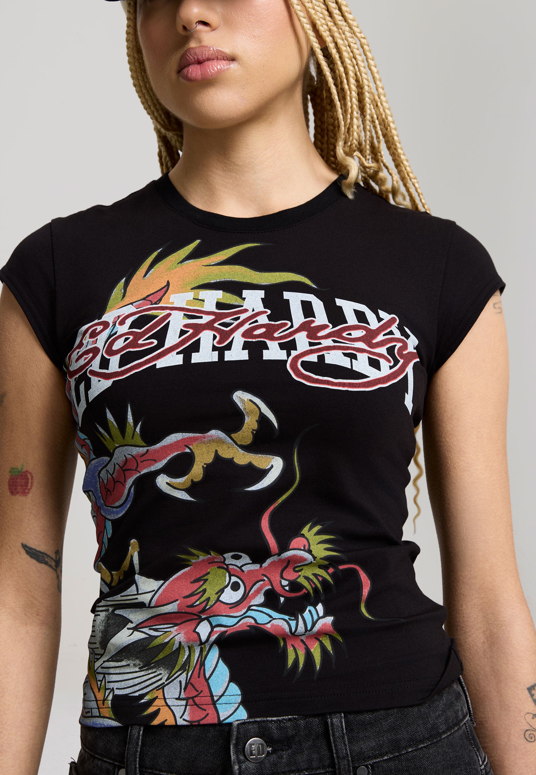 Womens Varsity Dragon Cap Sleeve Tee - Black