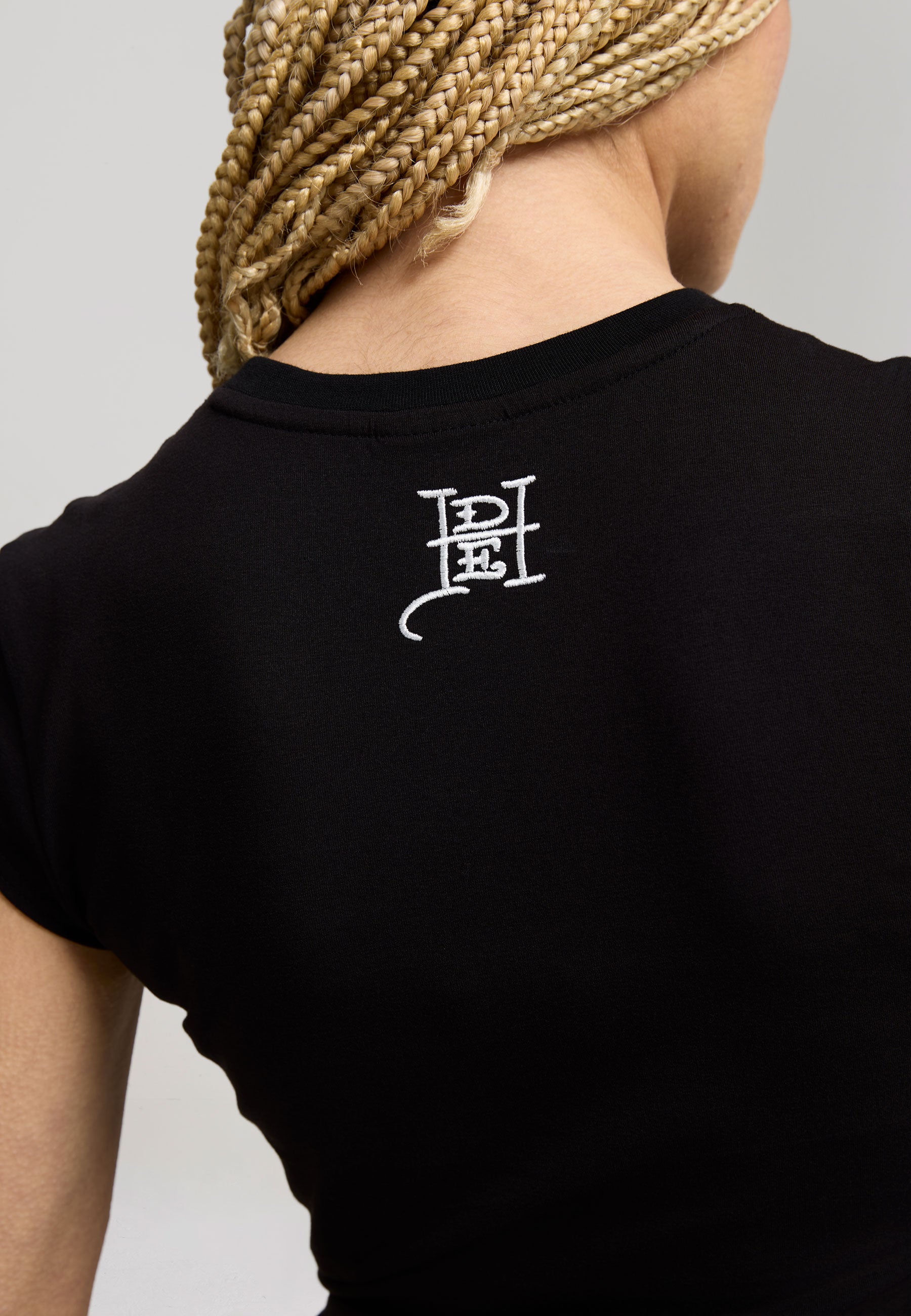 CAP SLEEVE PRINTED GRAPHIC AND LOGO TO FRONT EDH EMBROIDERY TO NACK NECK COTTON ELASTANE MIX