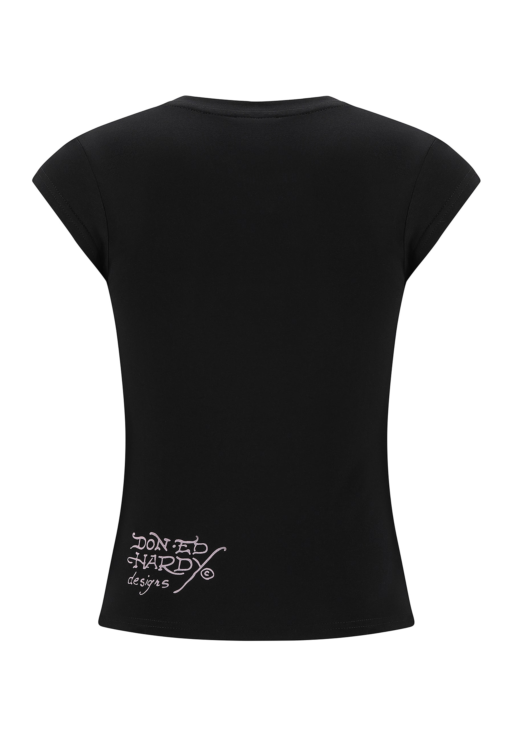 Womens Koi Fish Diamante Cap Sleeve T-Shirt Top - Black
