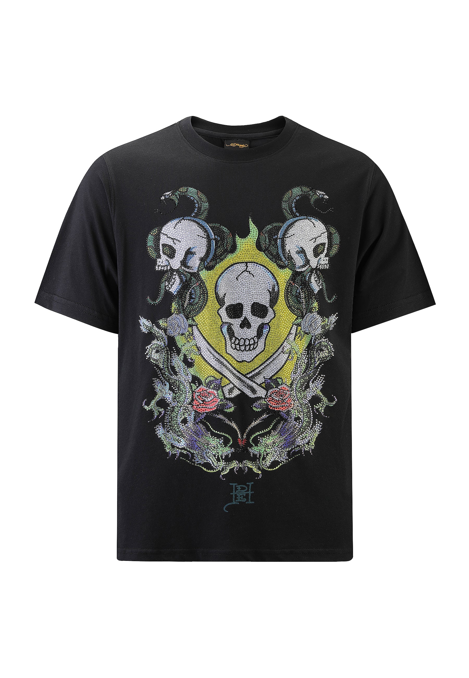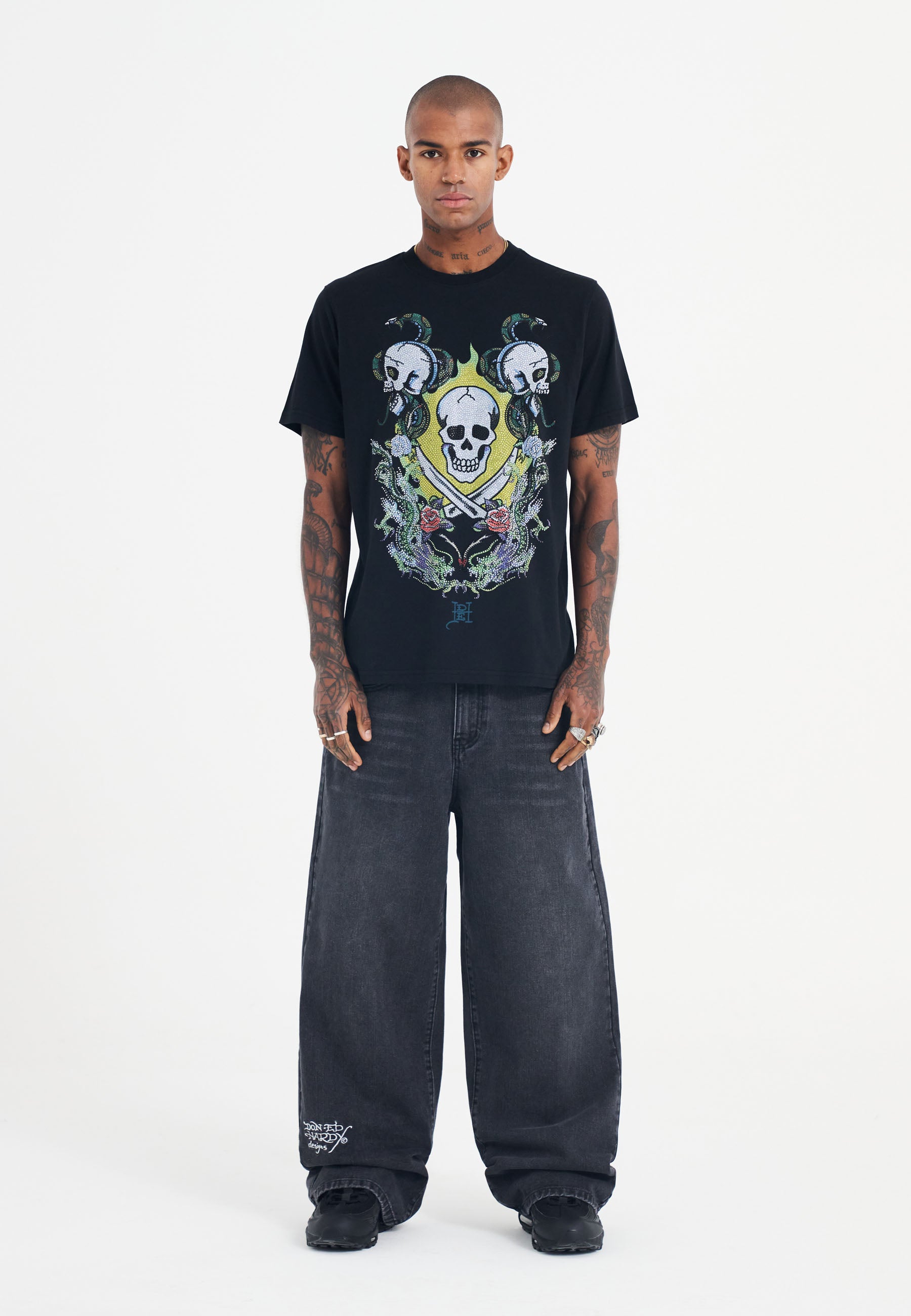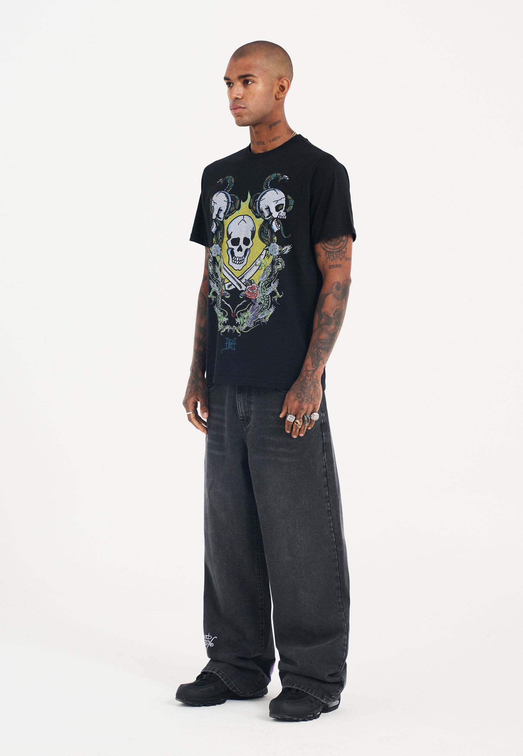 The Skull and Dragon Battle T-Shirt features Ed's iconic illustrations, reimagined with vibrant full-colour diamante patches and layered graphics.