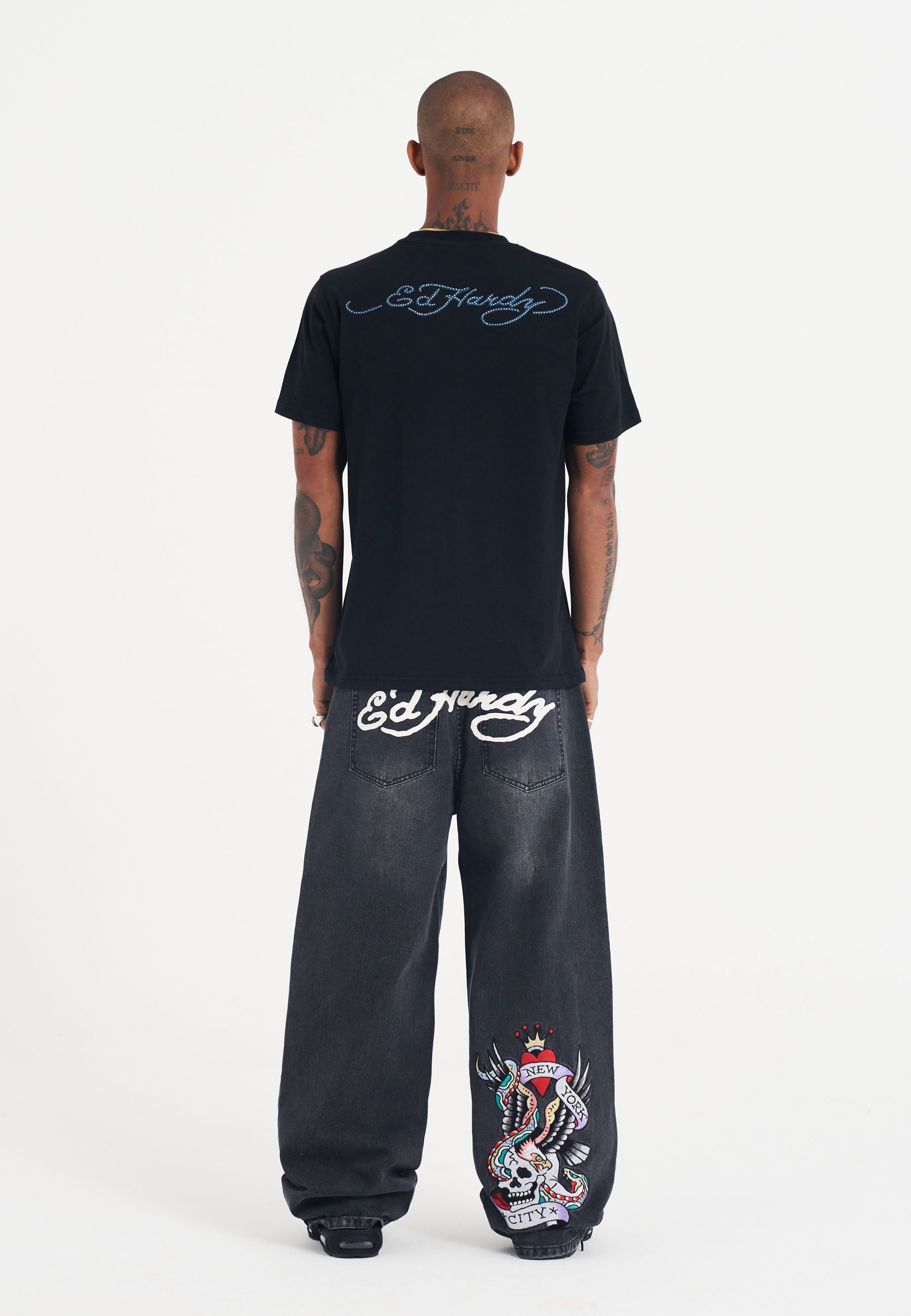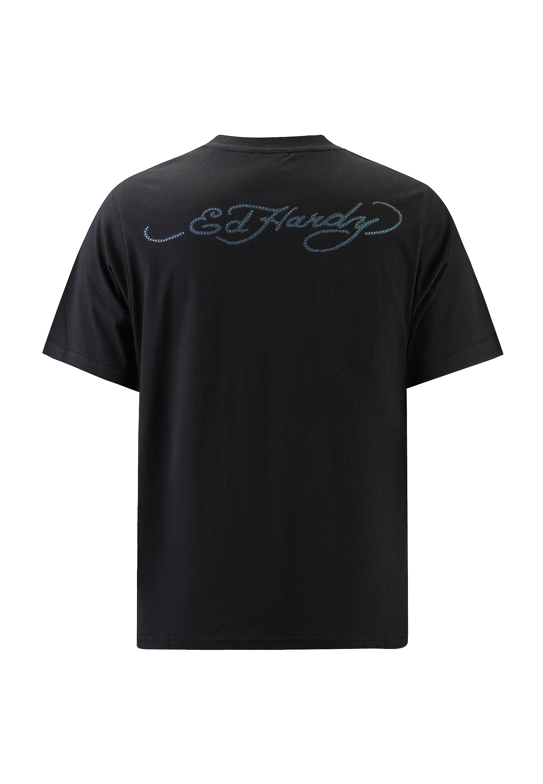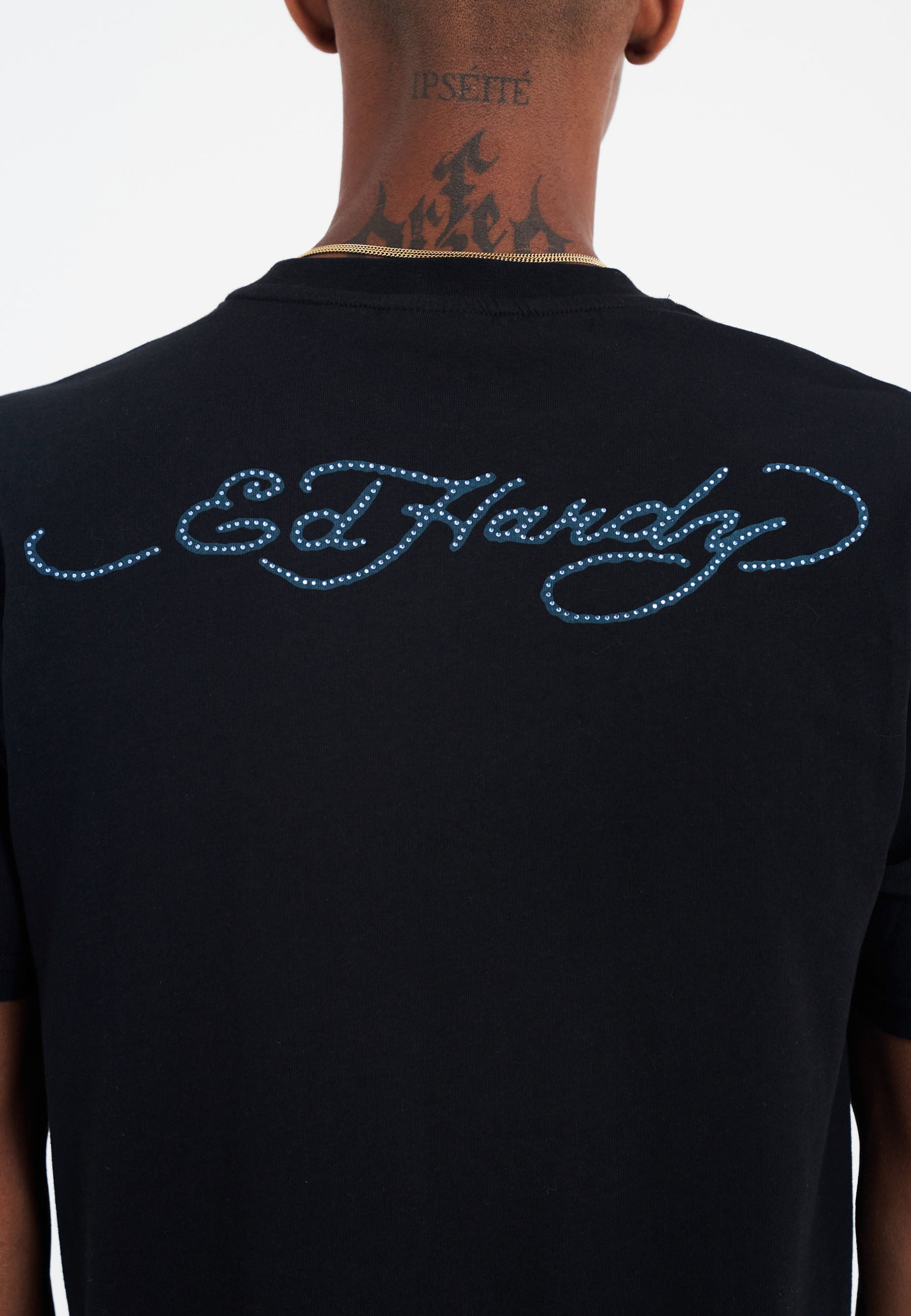 The Skull and Dragon Battle T-Shirt features Ed's iconic illustrations, reimagined with vibrant full-colour diamante patches and layered graphics.