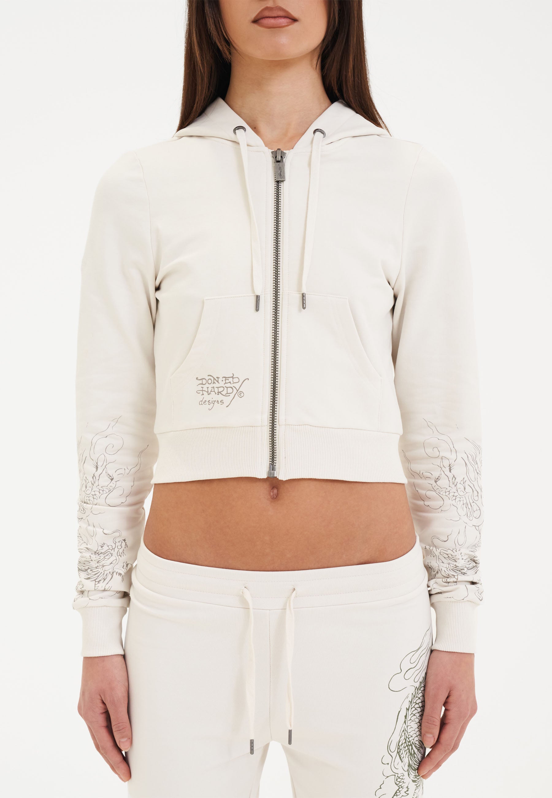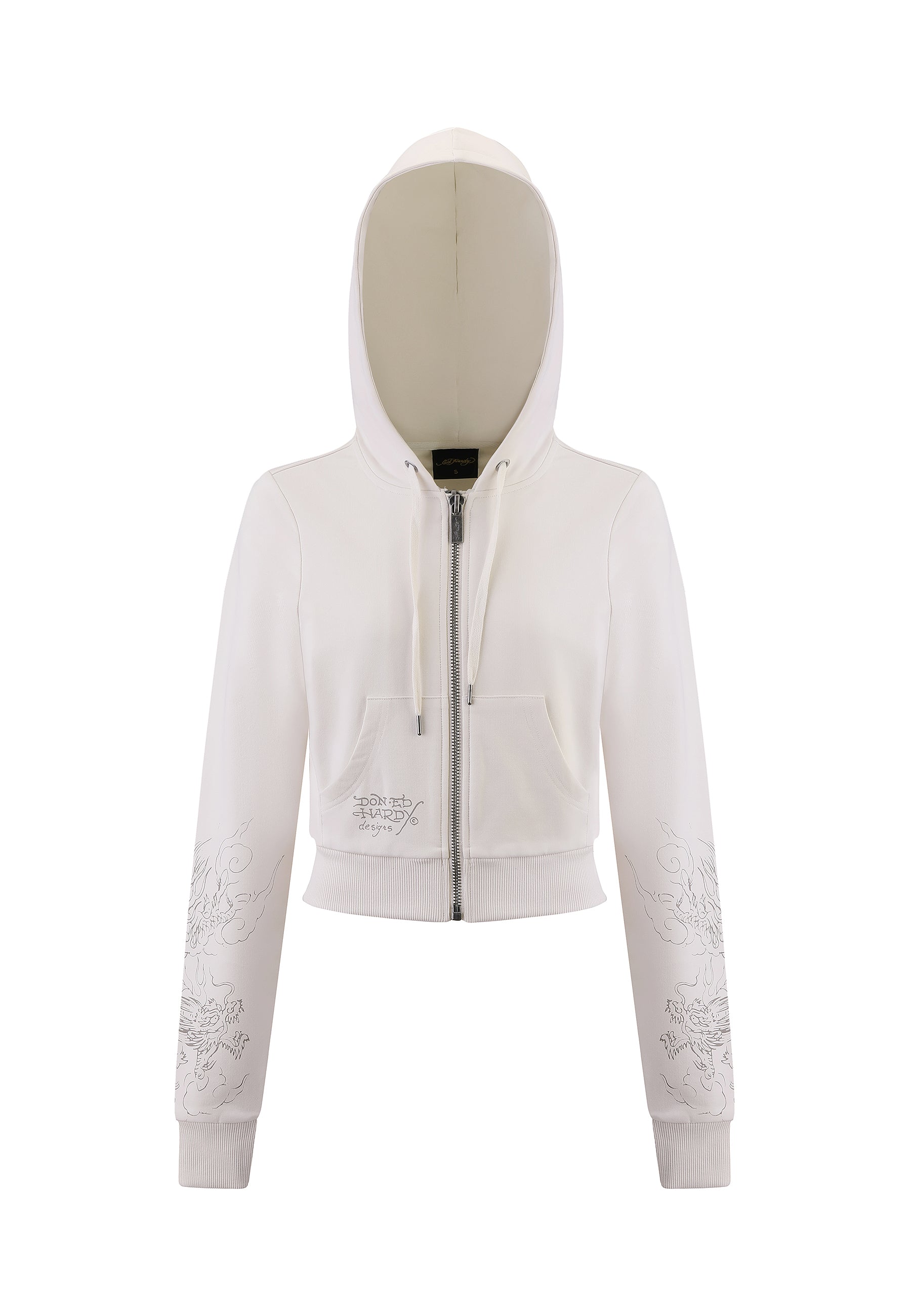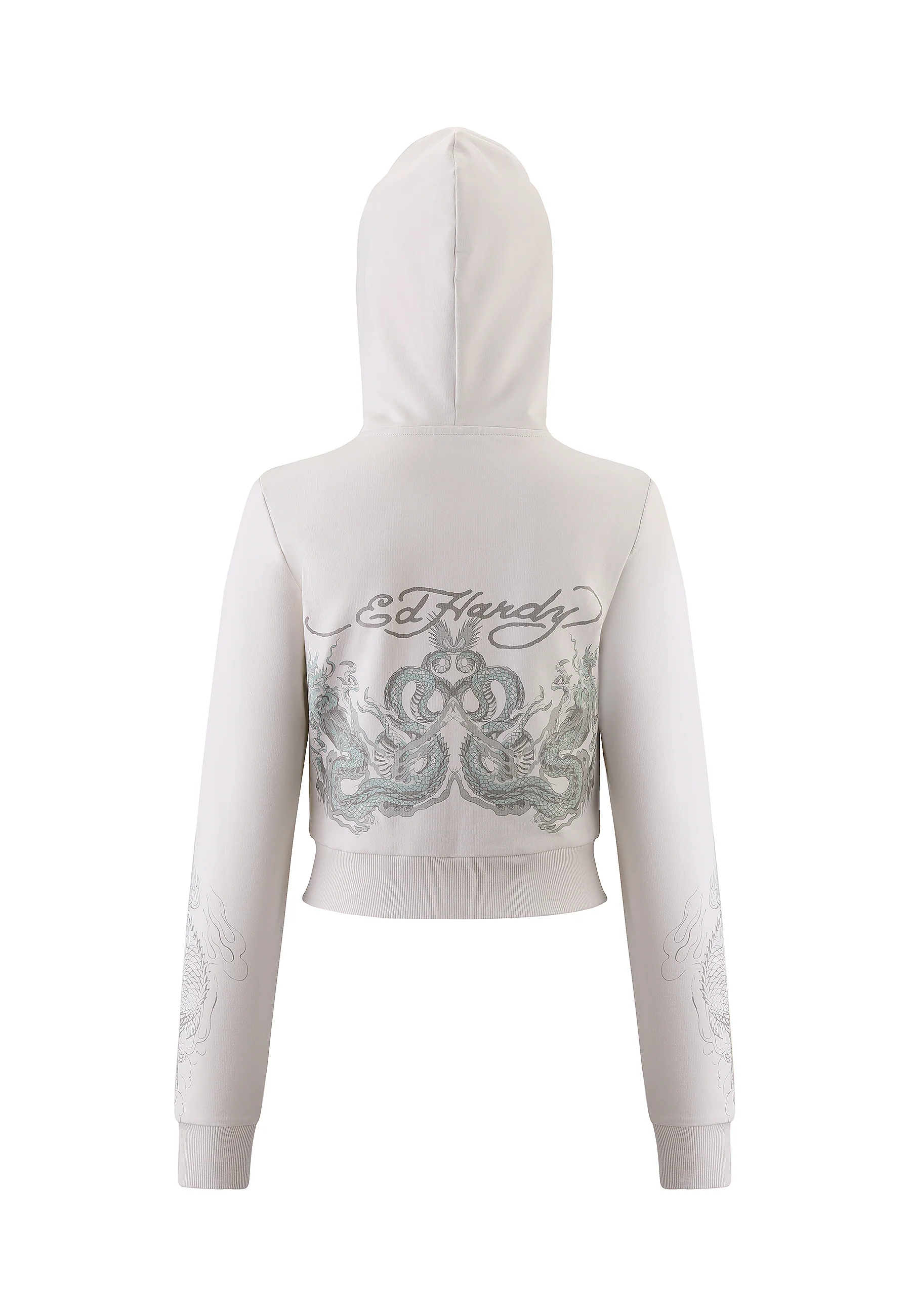Sudadera con capucha y cremallera corta con gráfico Twisted Dragon para mujer - Blanco
