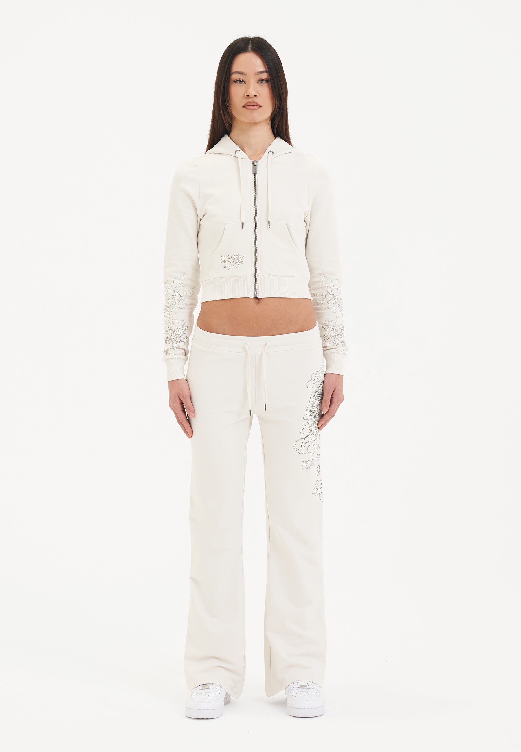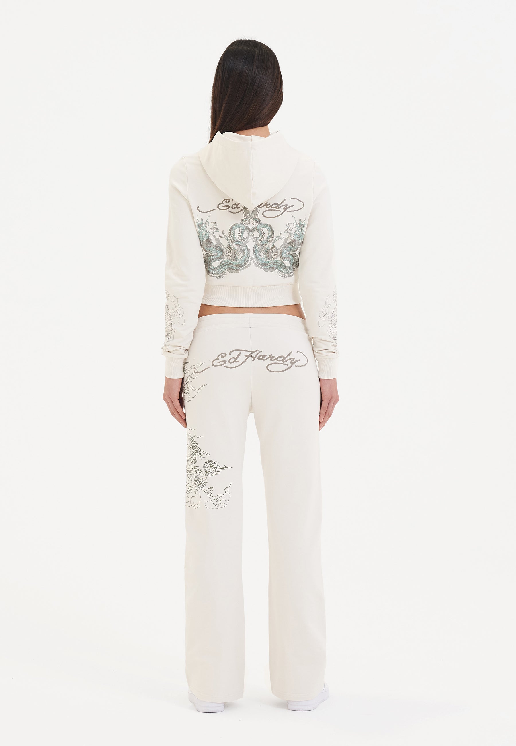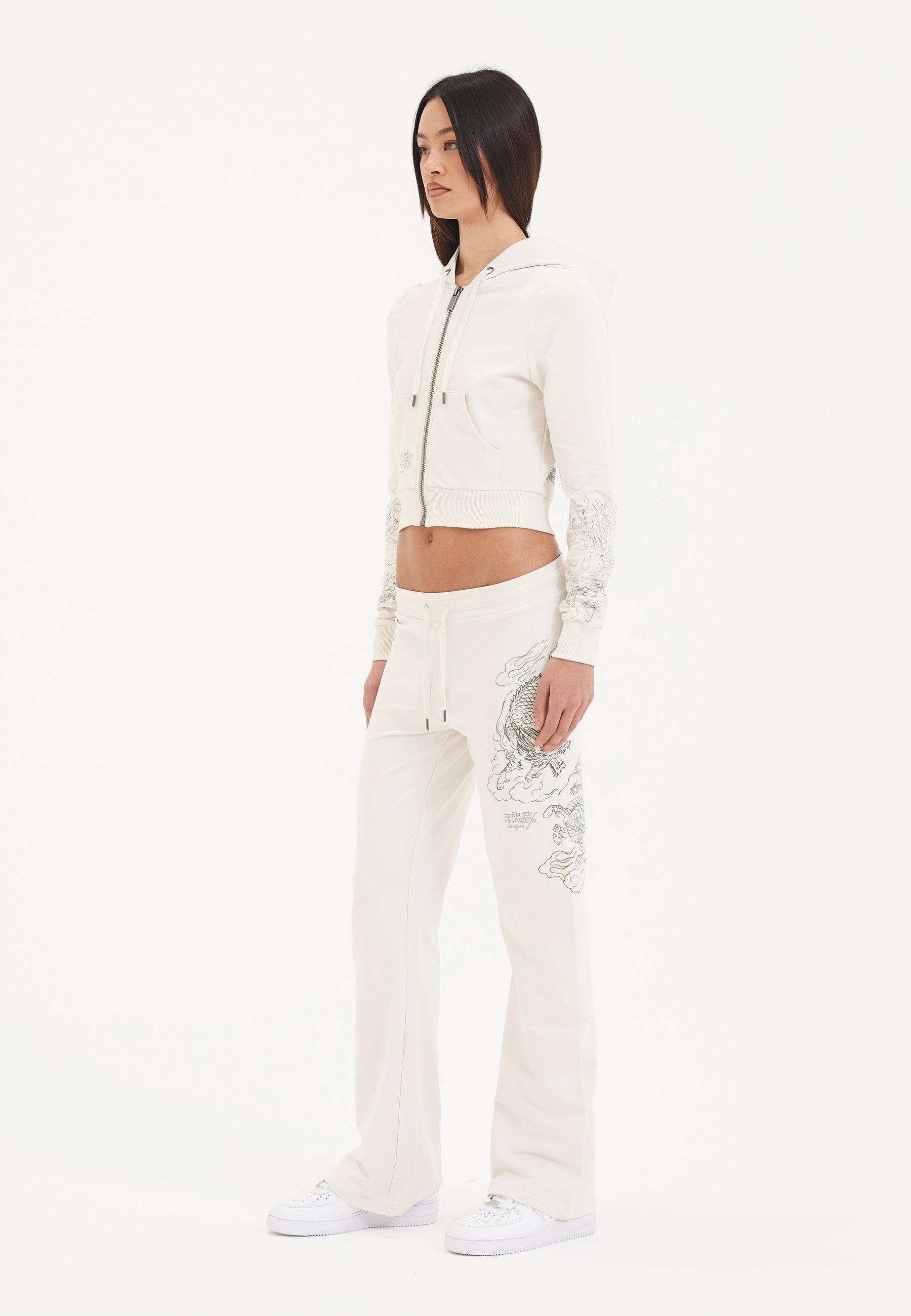 Sudadera con capucha y cremallera corta con gráfico Twisted Dragon para mujer - Blanco