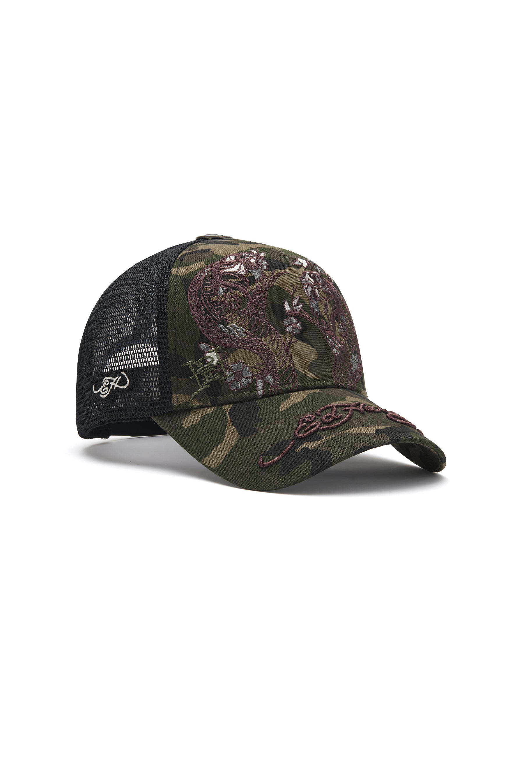 Unisex 2 Snakes Embroidered 5 Panel Trucker Cap in Camo