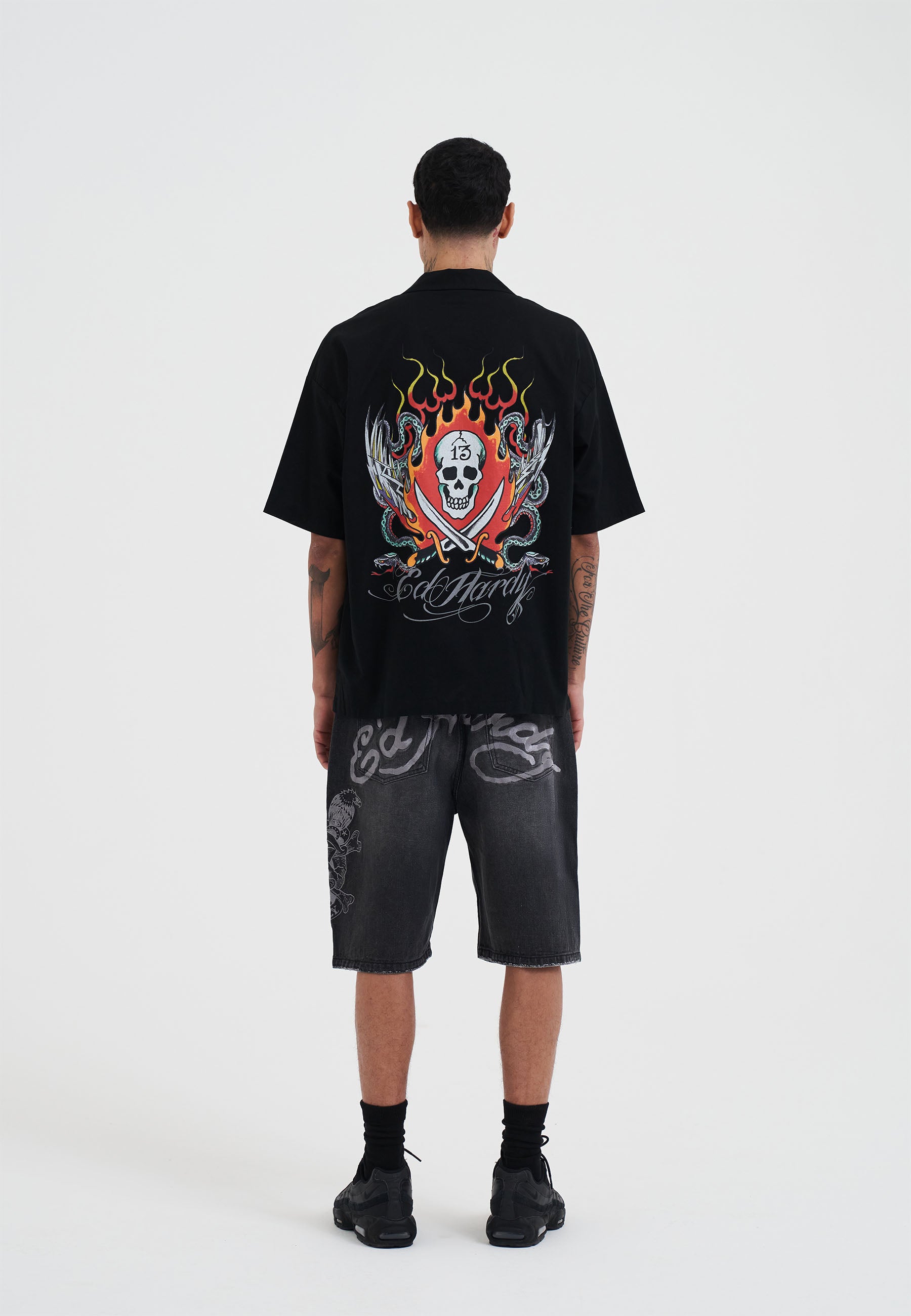Mens Snakes And Skull Flames Printed Camp Shirt - Black