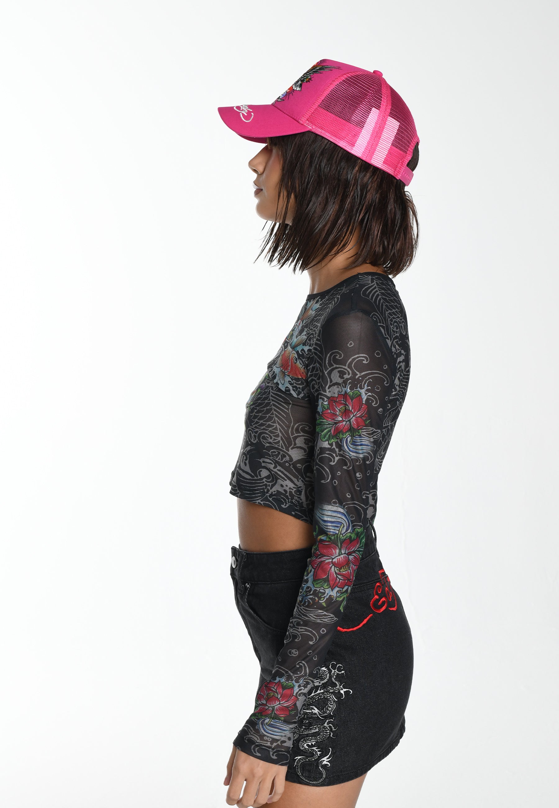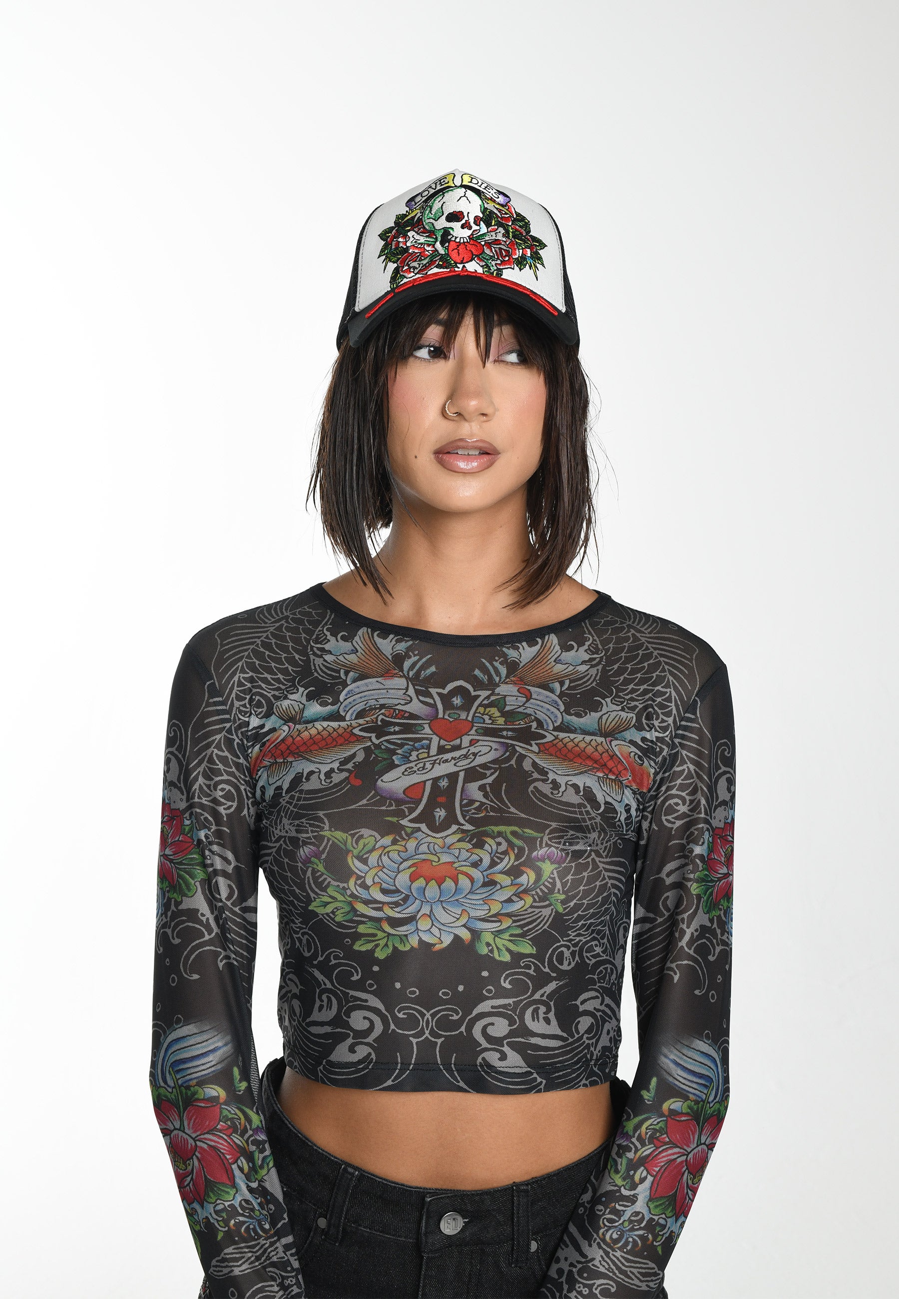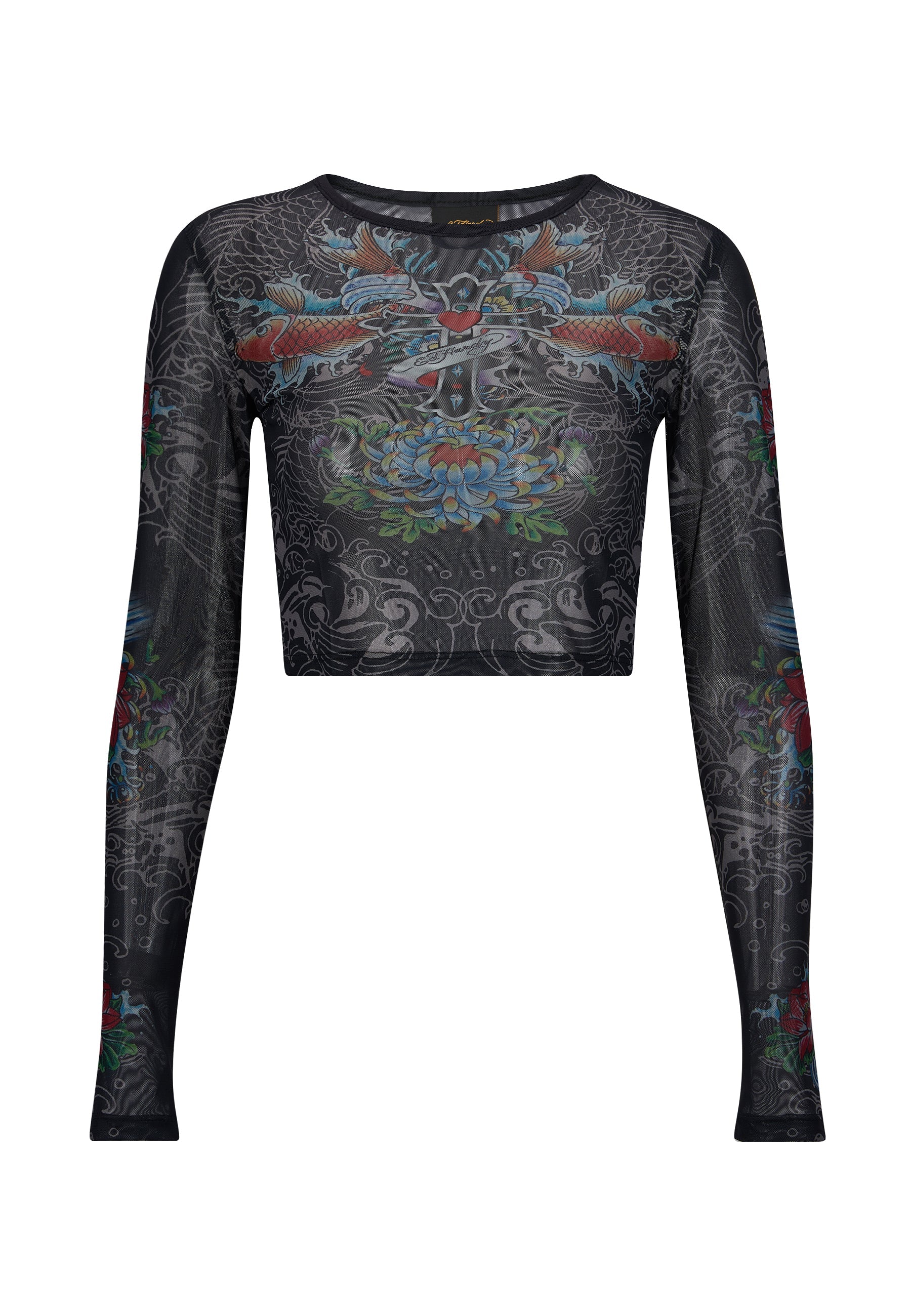 Koi-kala on muokannut Edin taidetta vuosikymmeniä, nyt AW23, Koi Paradise Mesh -pitkähihainen T-paita vangitsee kestävän muusansa.