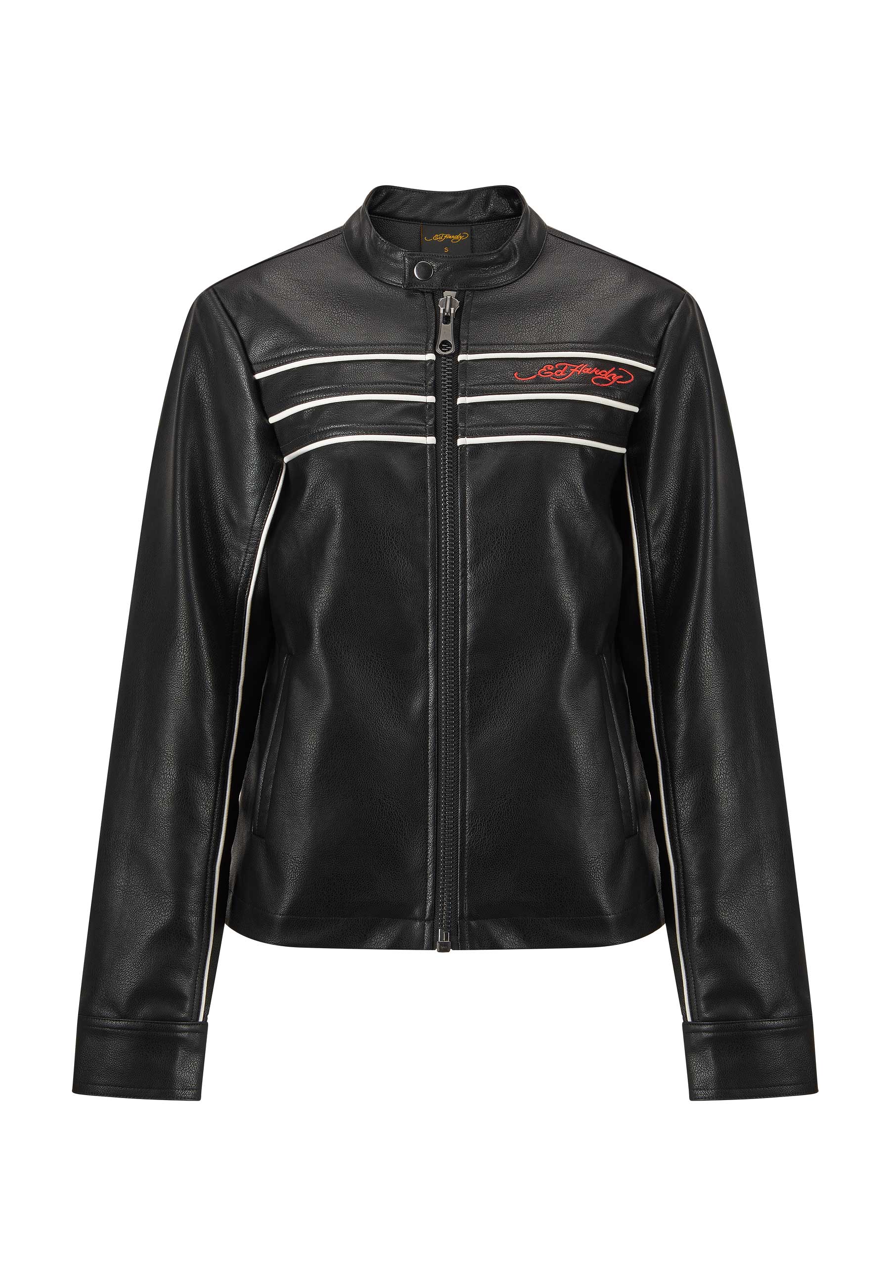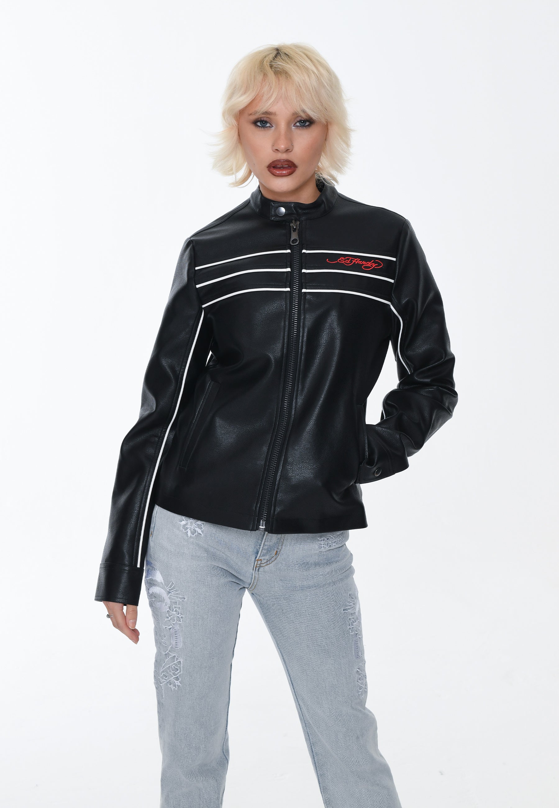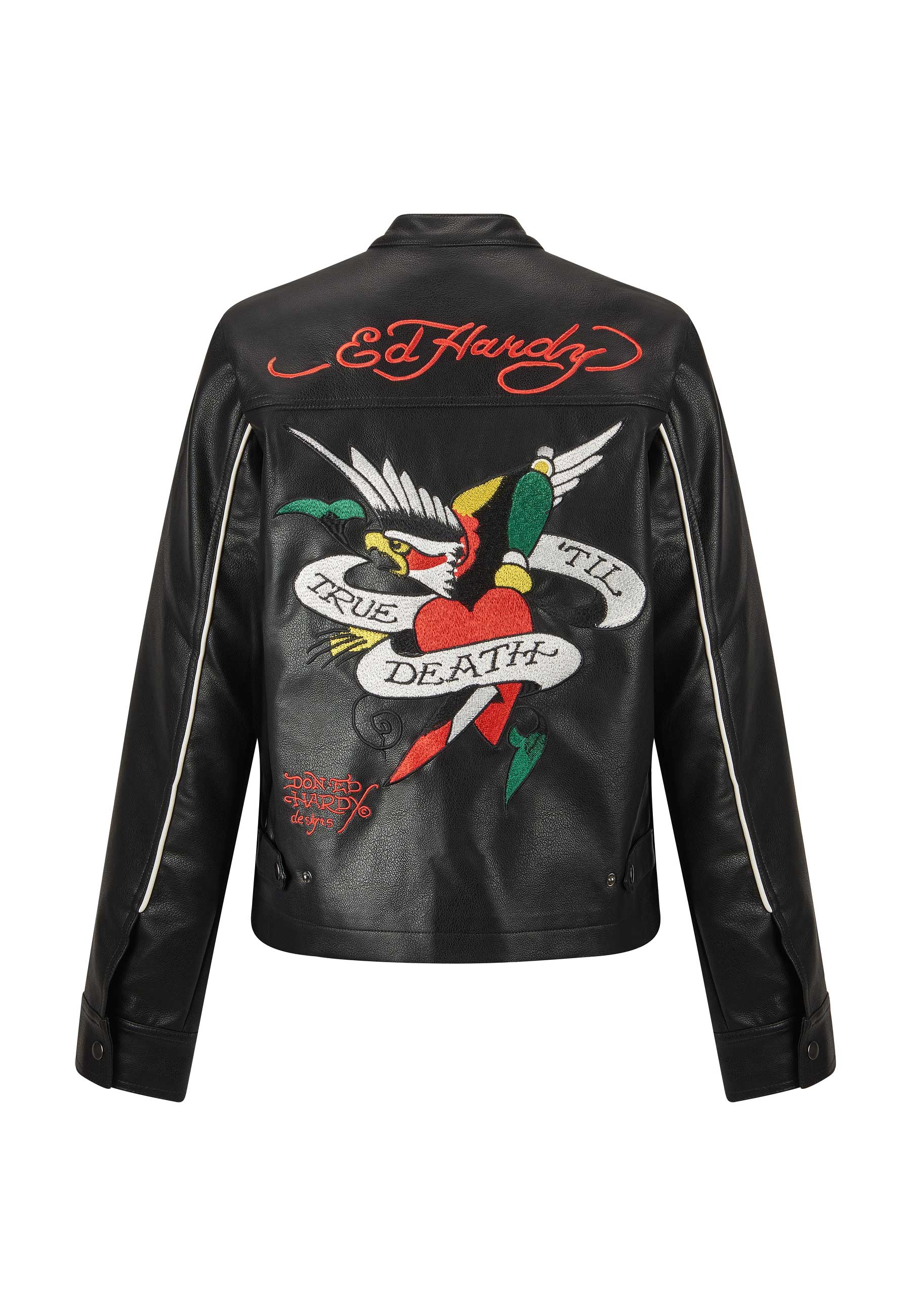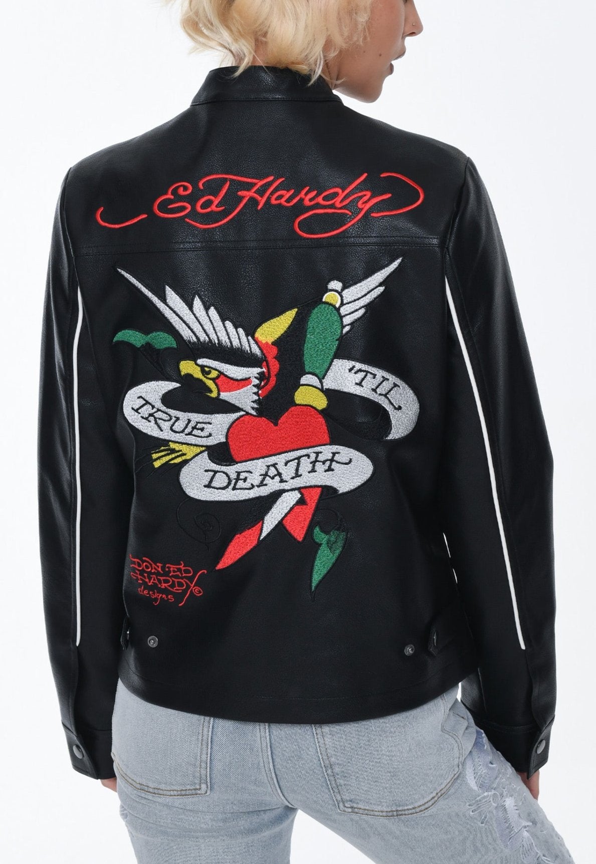 Esittelyssä Till Death Vegan Leather Biker Jacket, klassinen istuvuustakki korkealaatuisesta mustasta PU:sta. Moitteettomilla yksityiskohdilla ja rohkealla "True Till Death" -kotkagrafiikalla, joka on kirjailtu eloisalla täyteläisellä väreillä, tämä teos edustaa Ed Hardyn perintöä määritteleviä tyylikkäitä malleja.