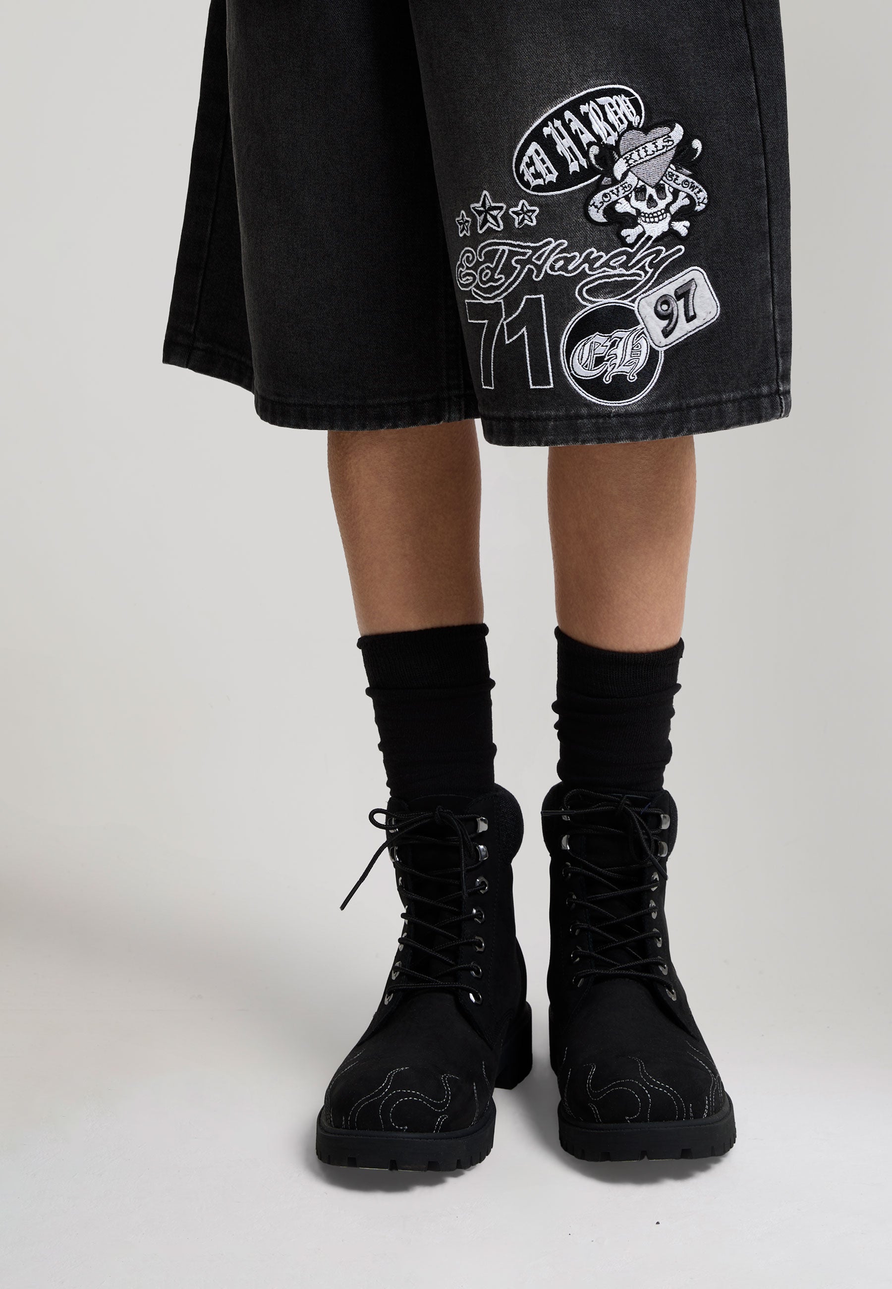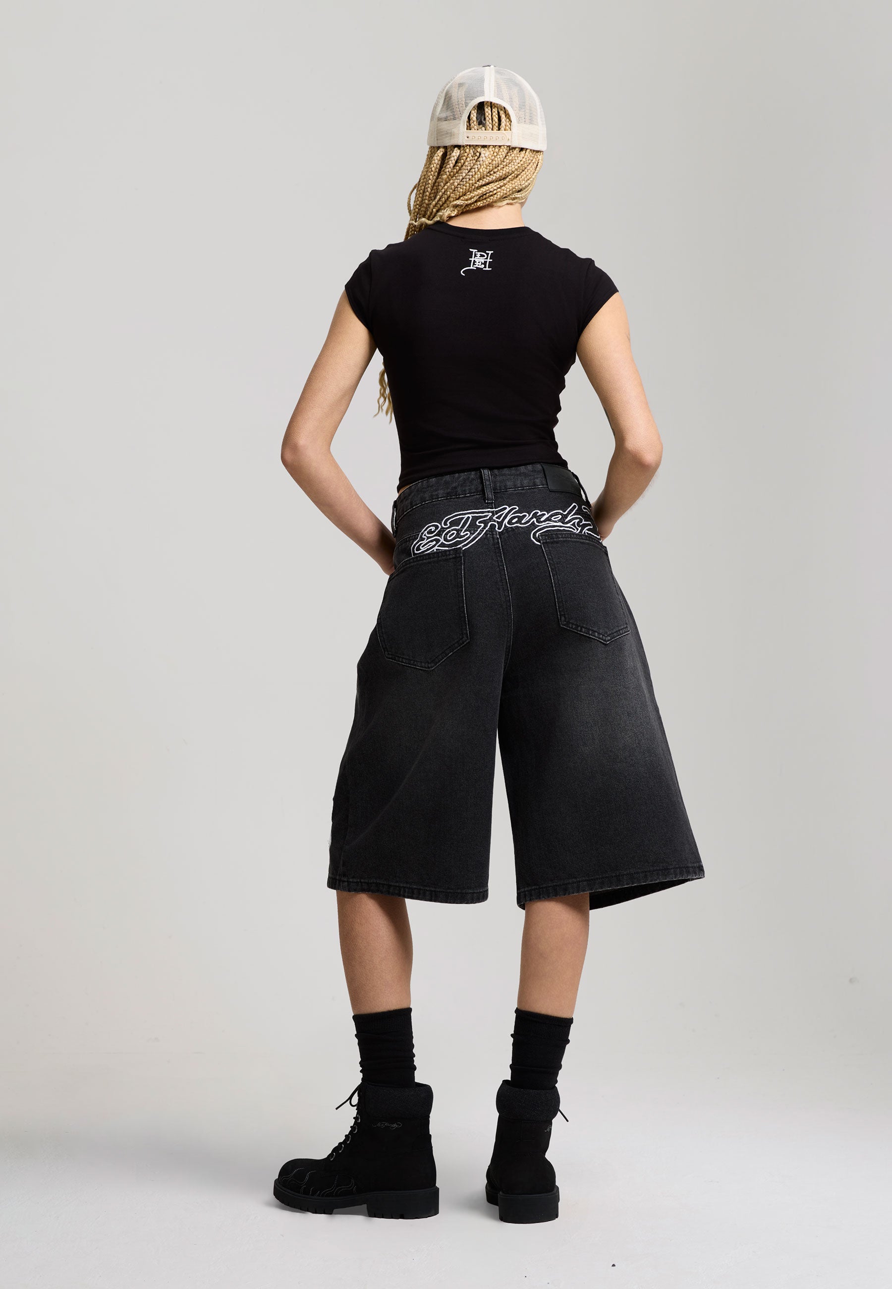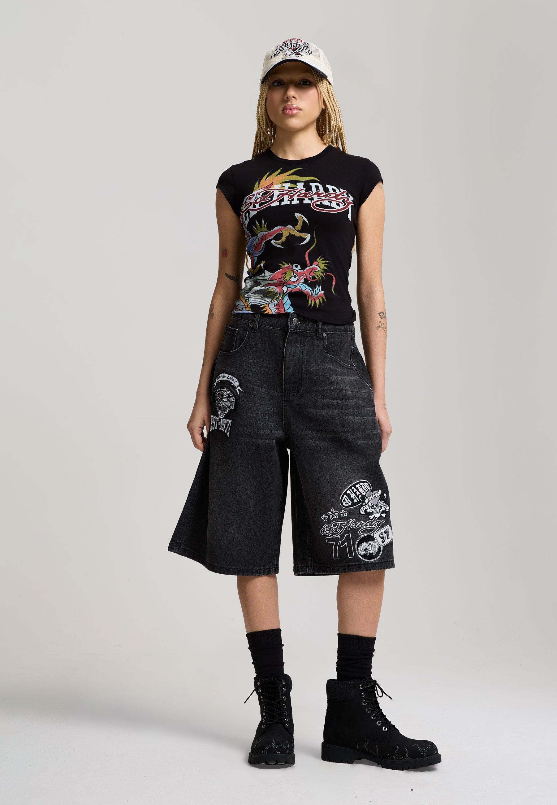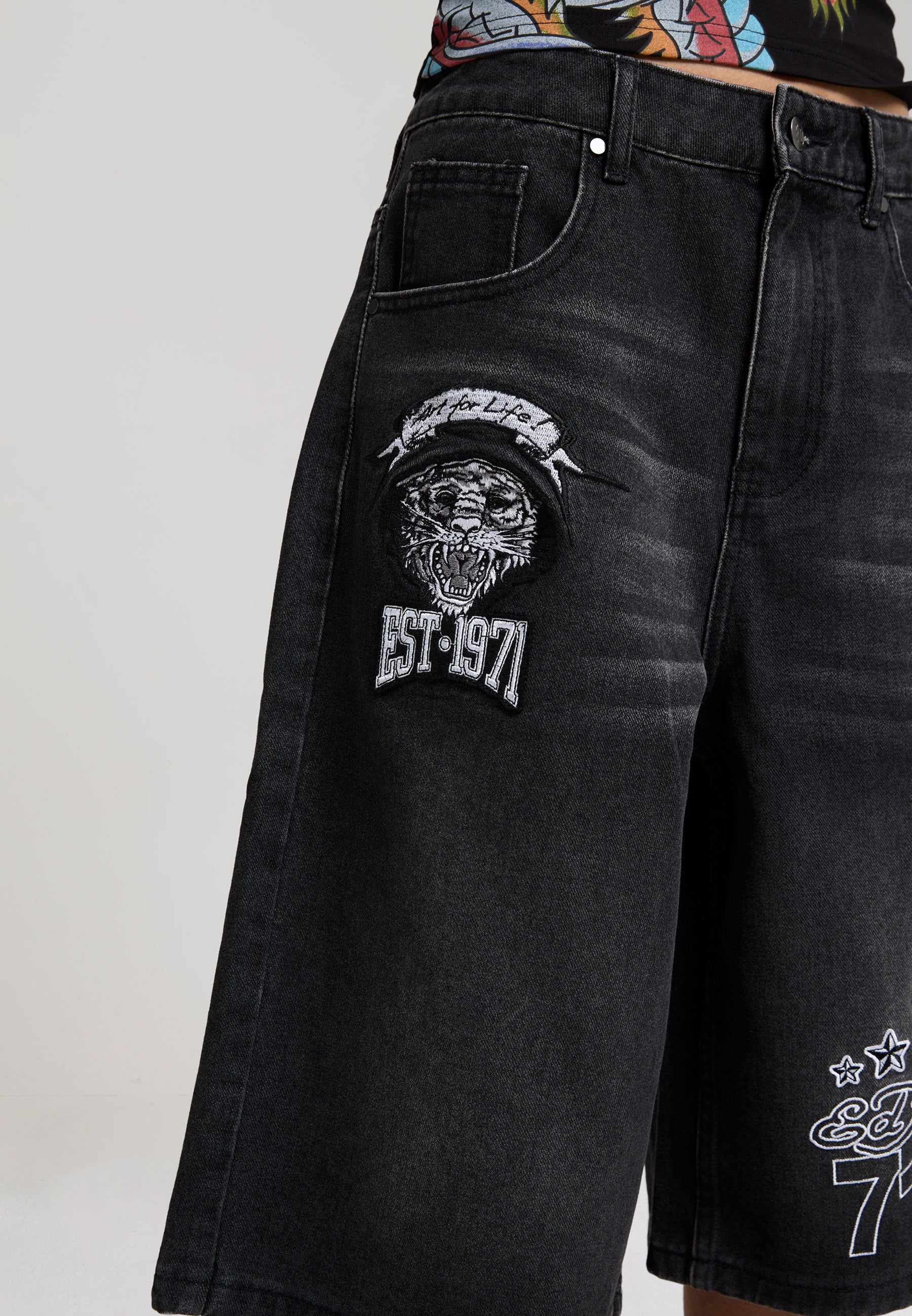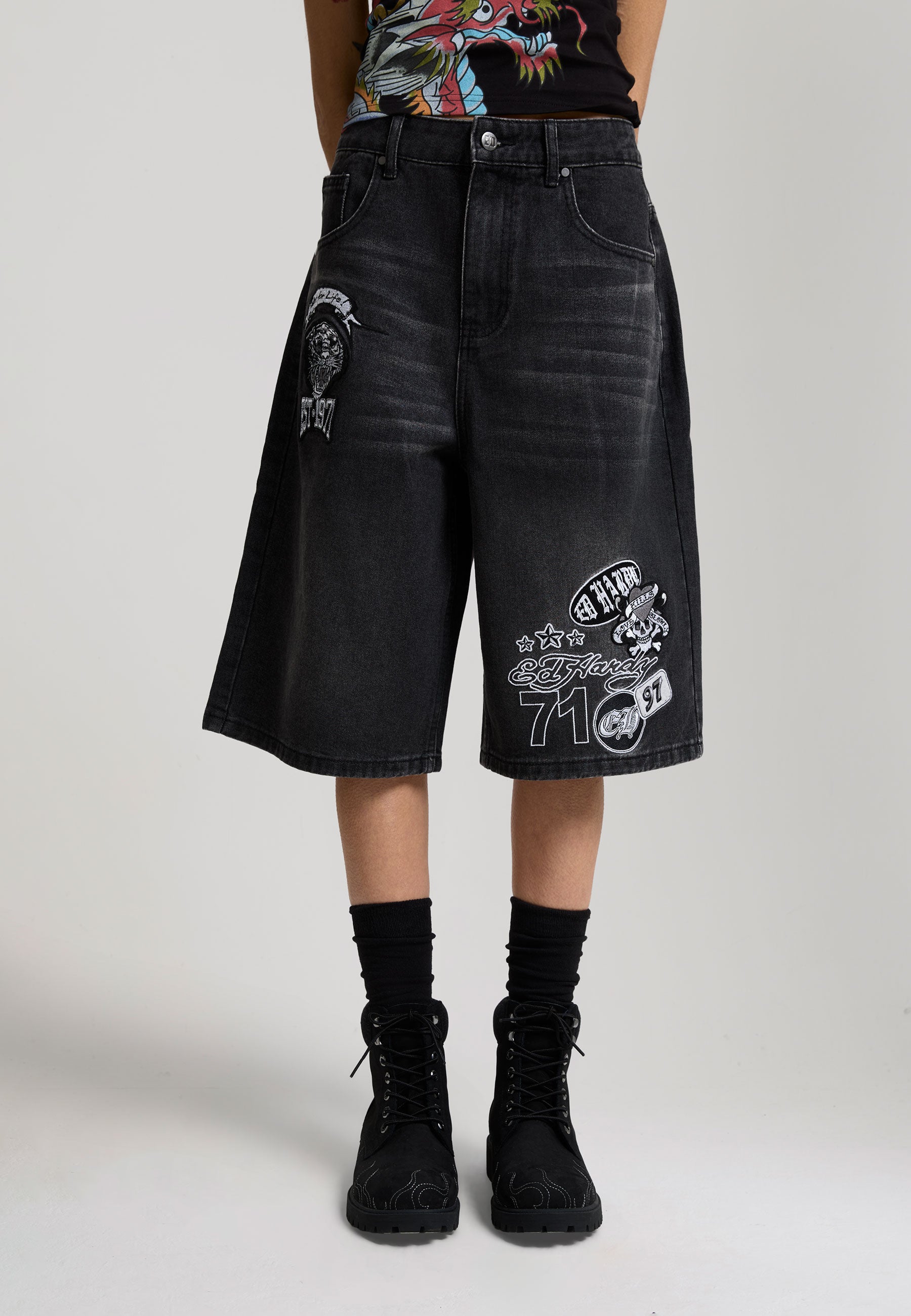 Womens Multi Badge Tattoo Denim Relaxed Jort in Black