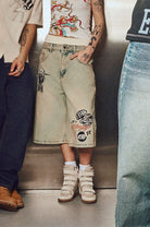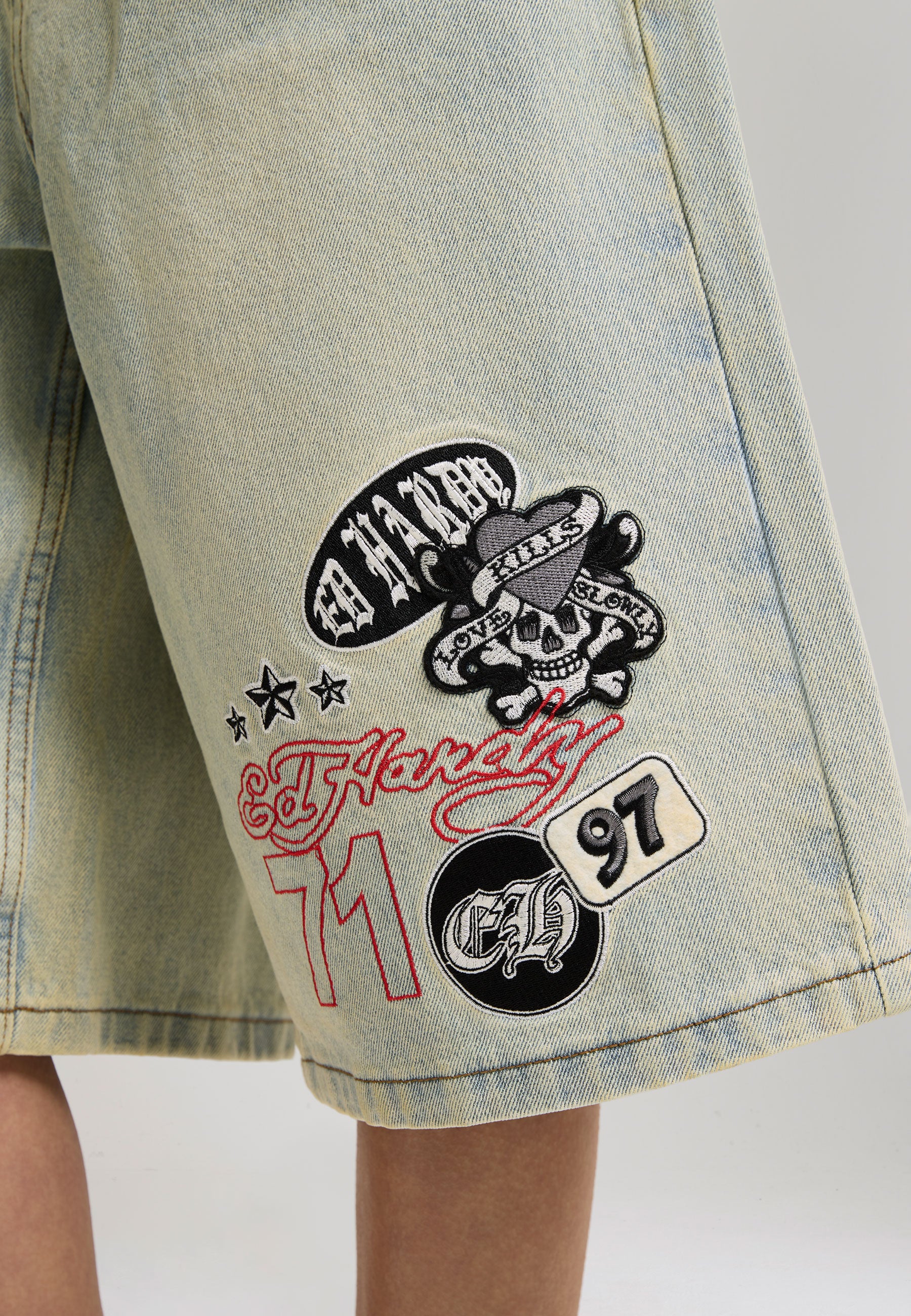 Womens Multi Badge Tattoo Denim Relaxed Jort - Bleach Denim
