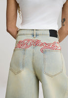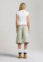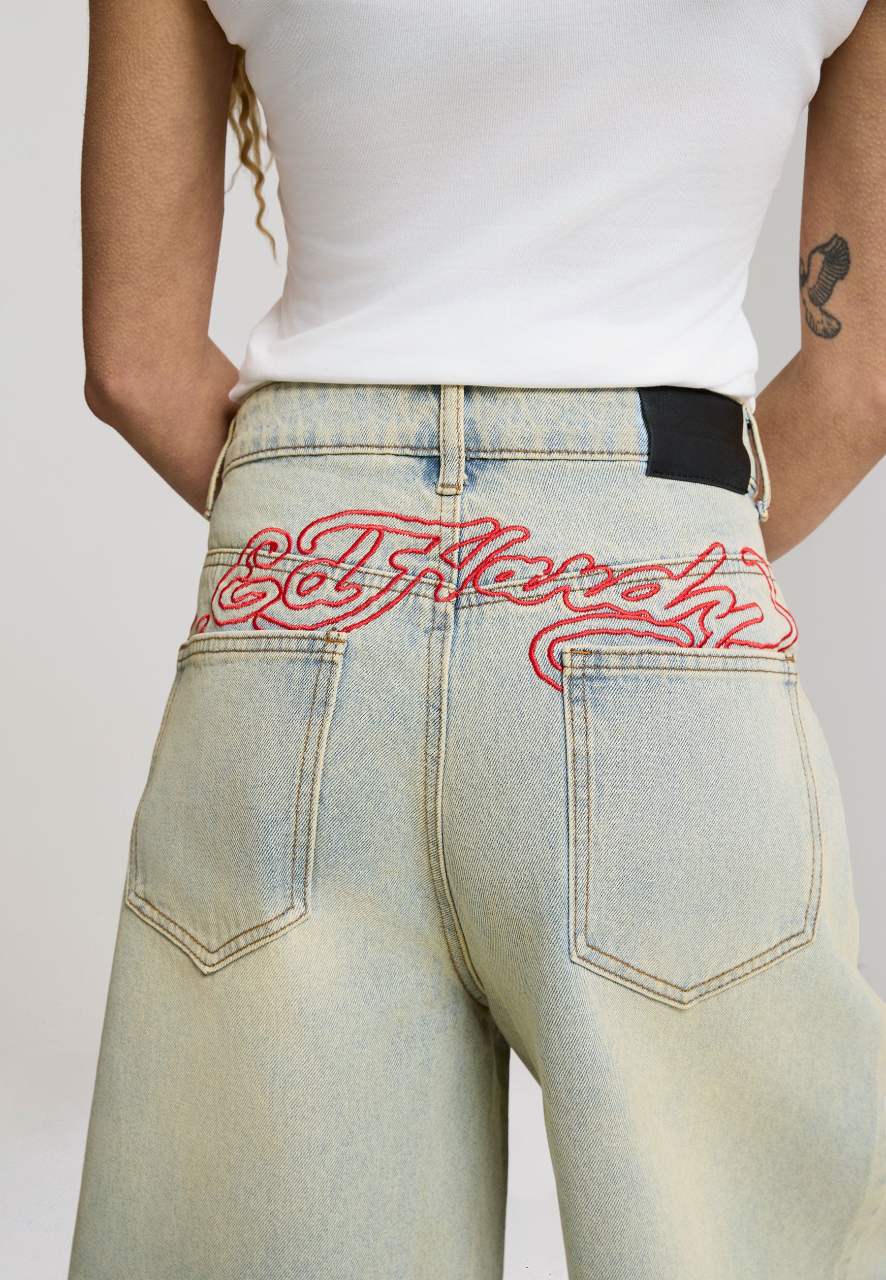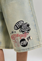 Womens Multi Badge Tattoo Denim Relaxed Jort in Bleach Denim