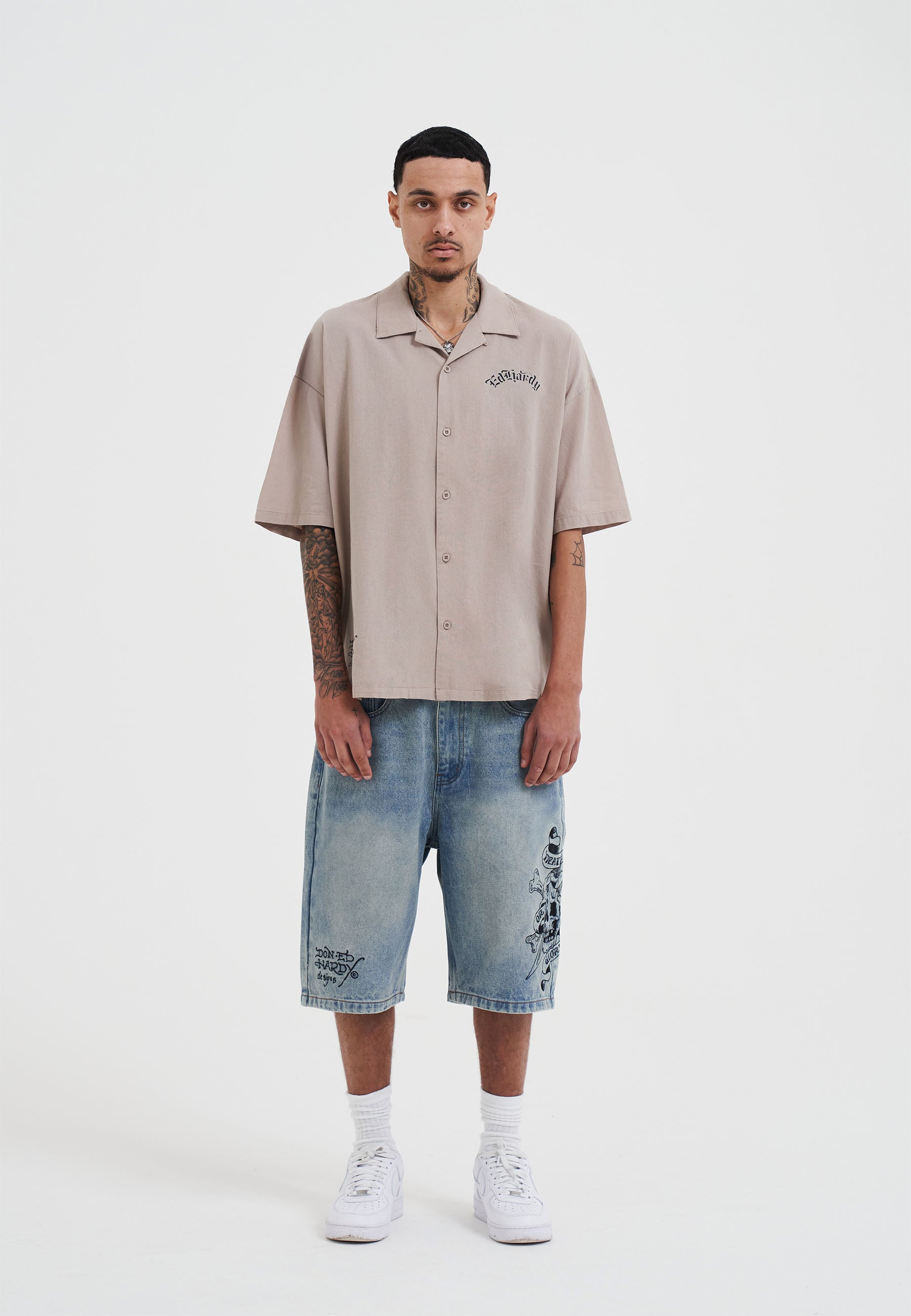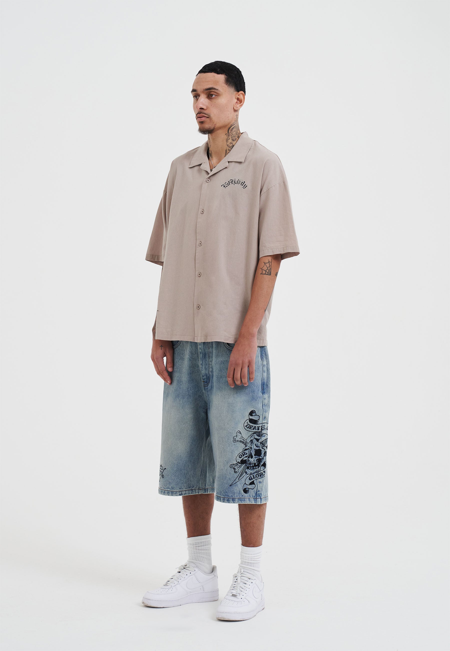 Mens Death Before Glory Mono Printed Camp Shirt - Light Grey