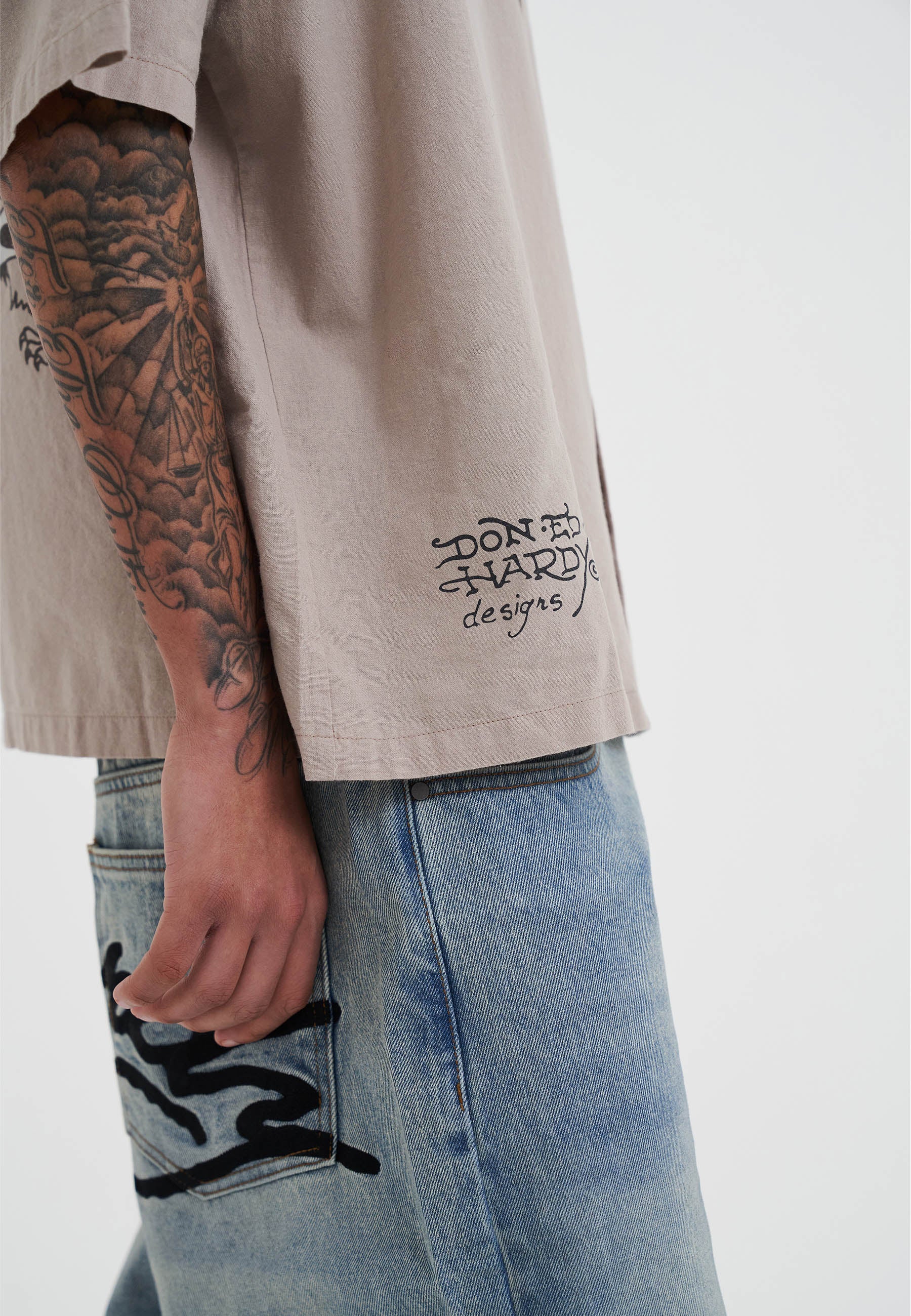 Mens Don Wolf Dragon Printed Camp Shirt - Ecru