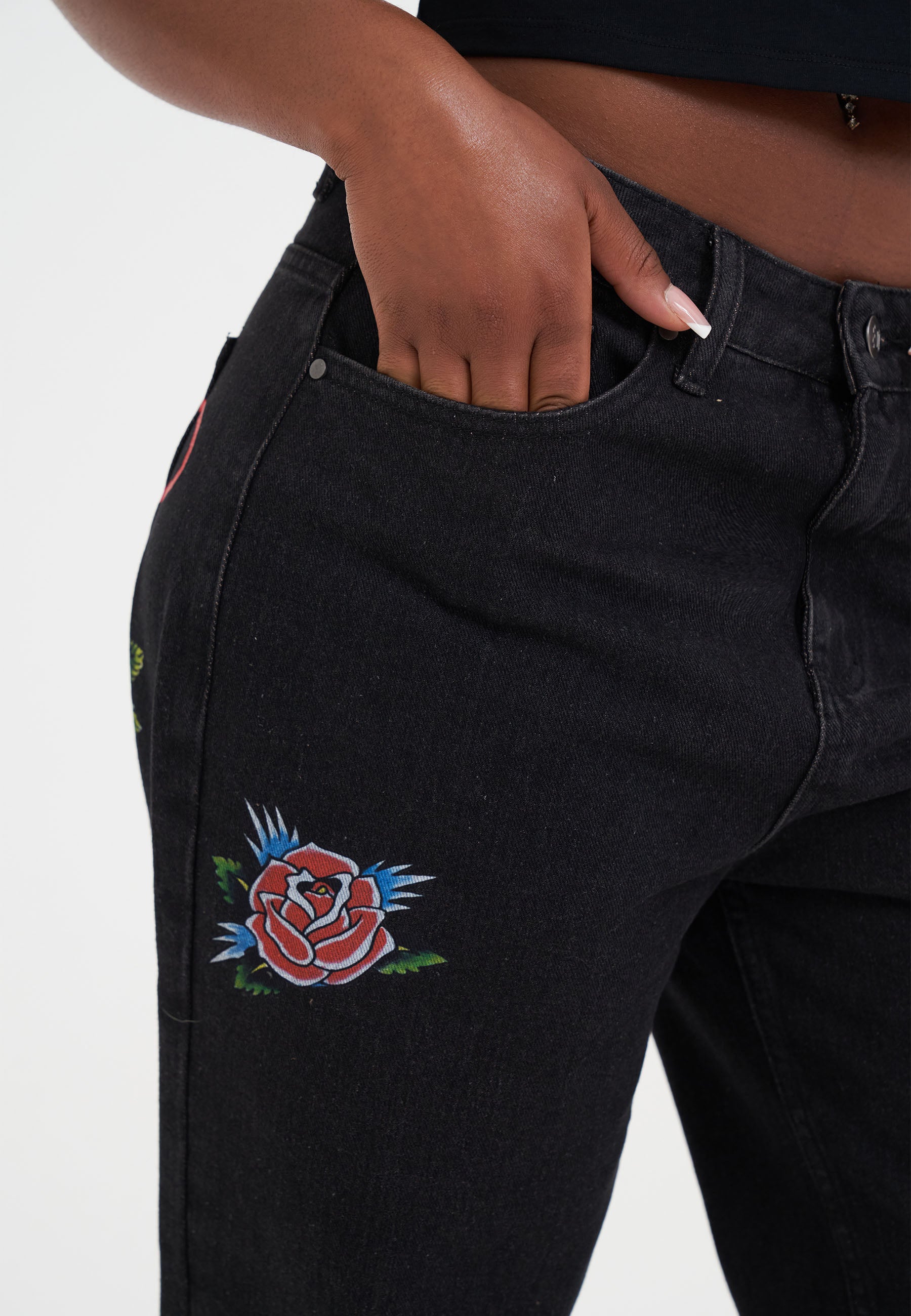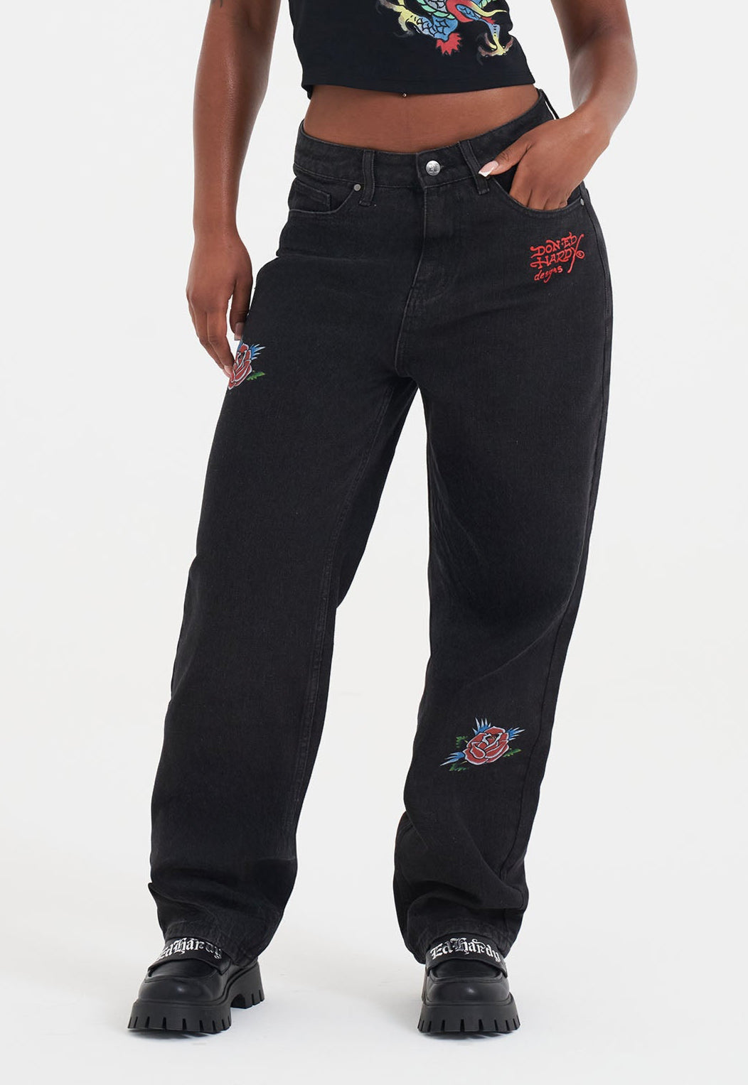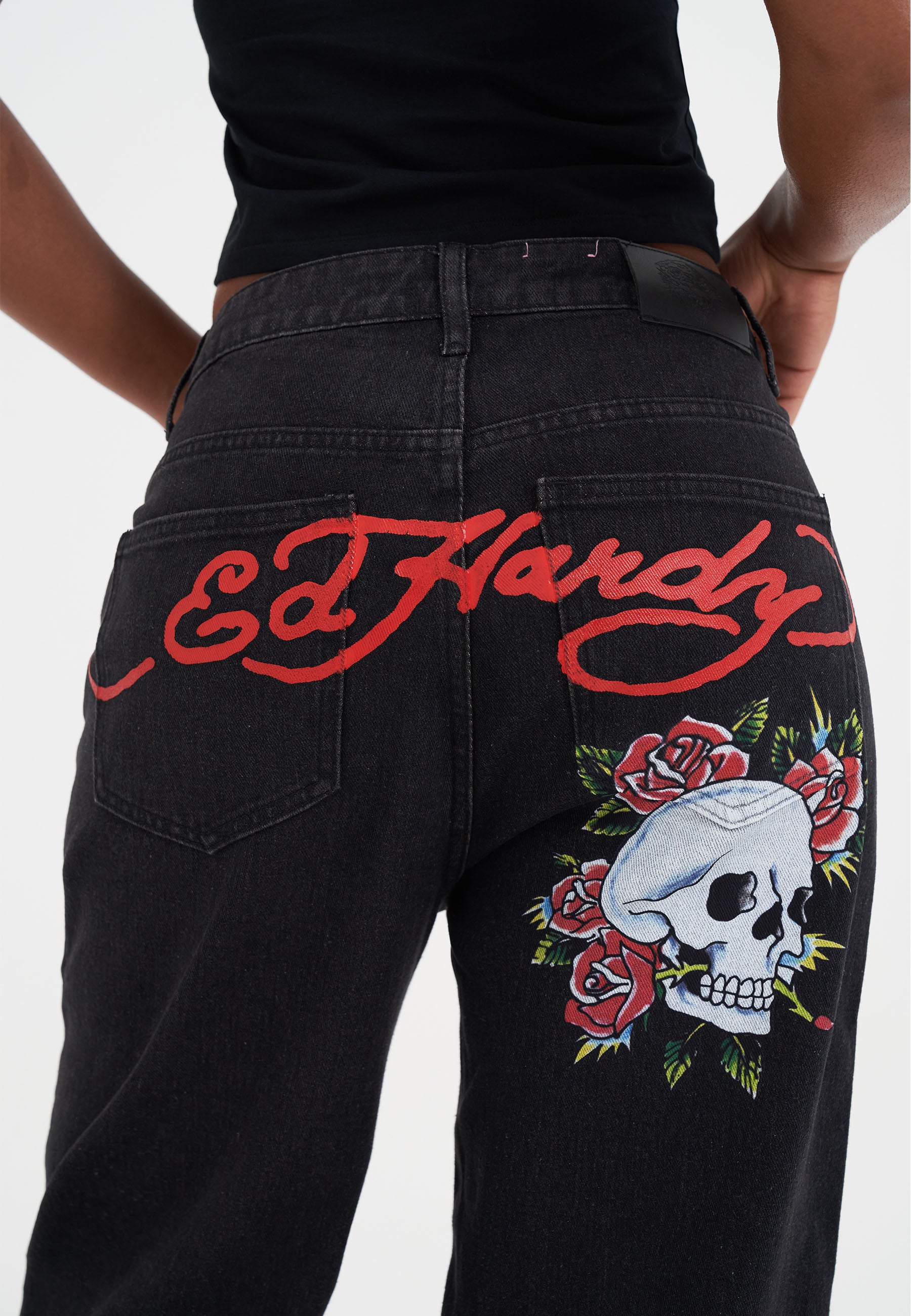 Les Jeans décontractés Blooming Death pour femmes réinterprètent les dessins originaux d'Ed dans des designs intemporels. La jambe coupe décontractée présente une broderie complexe en couleur, mettant en vedette l'emblématique Blooming Skull d'Ed Hardy et des graphismes Rose originaux de son carnet de croquis.
