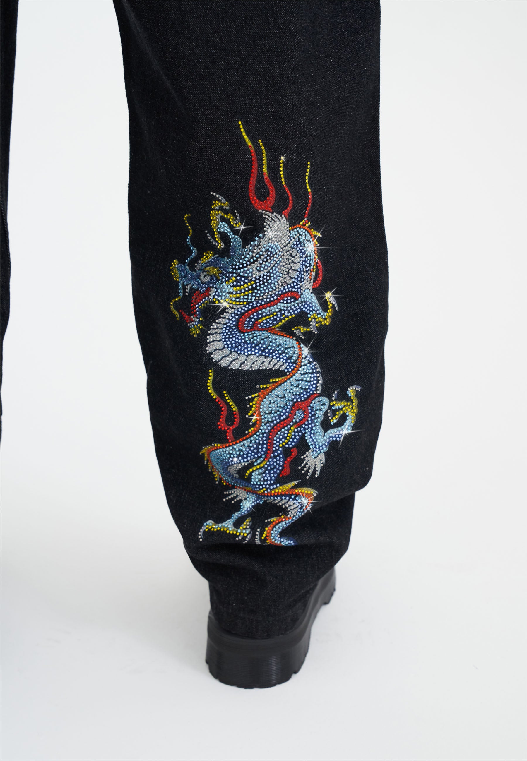 Présentation du Battle Dragon Jean, un saut audacieux dans une nouvelle ère de design, où des œuvres d'art en strass en couleur ornent un denim 100 % coton haut de gamme, de l'avant à l'arrière.