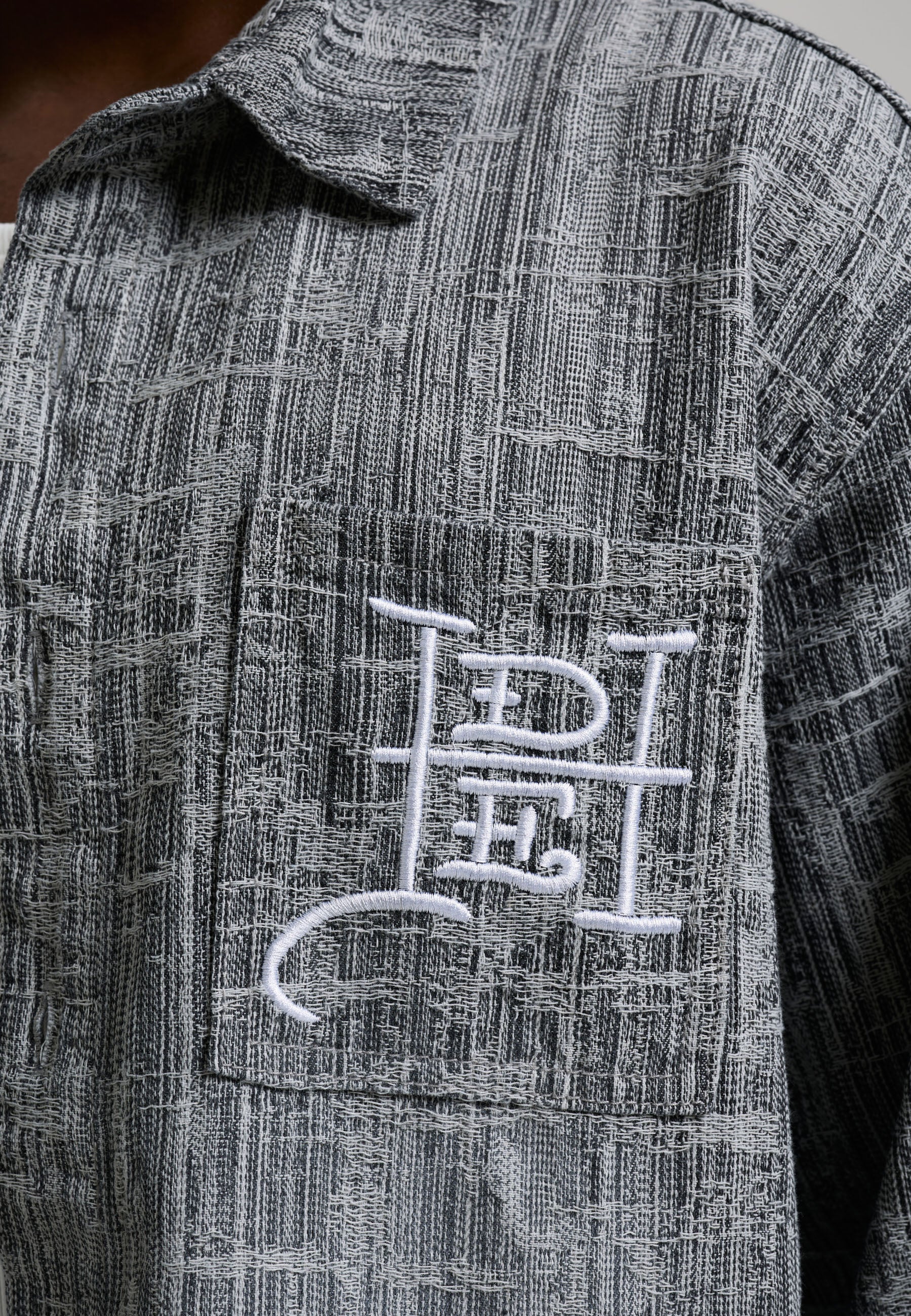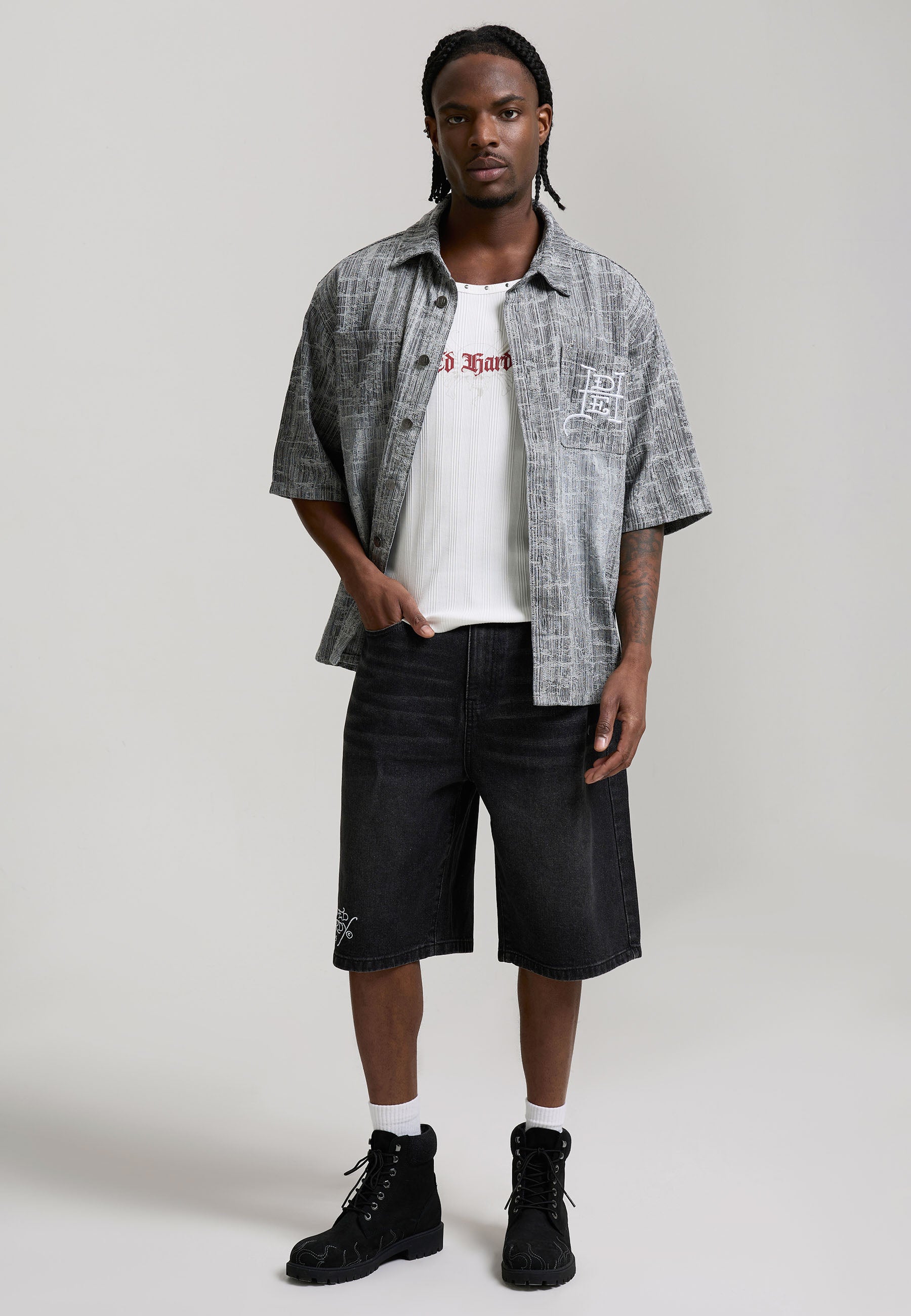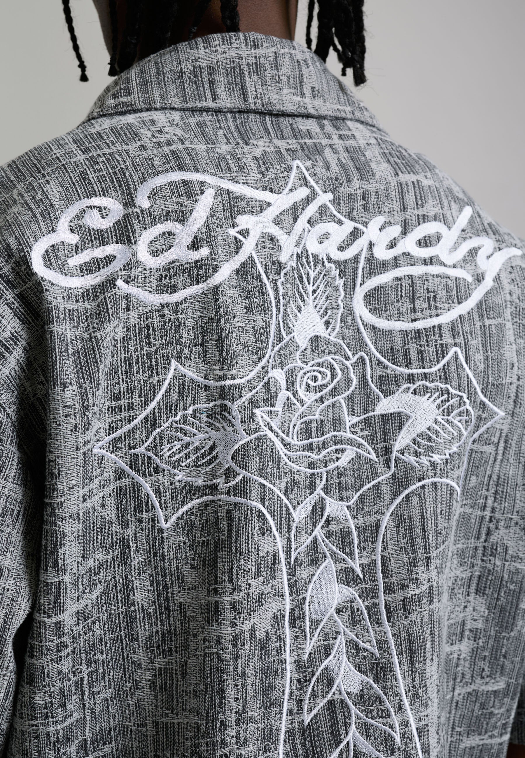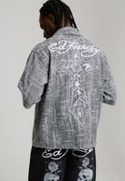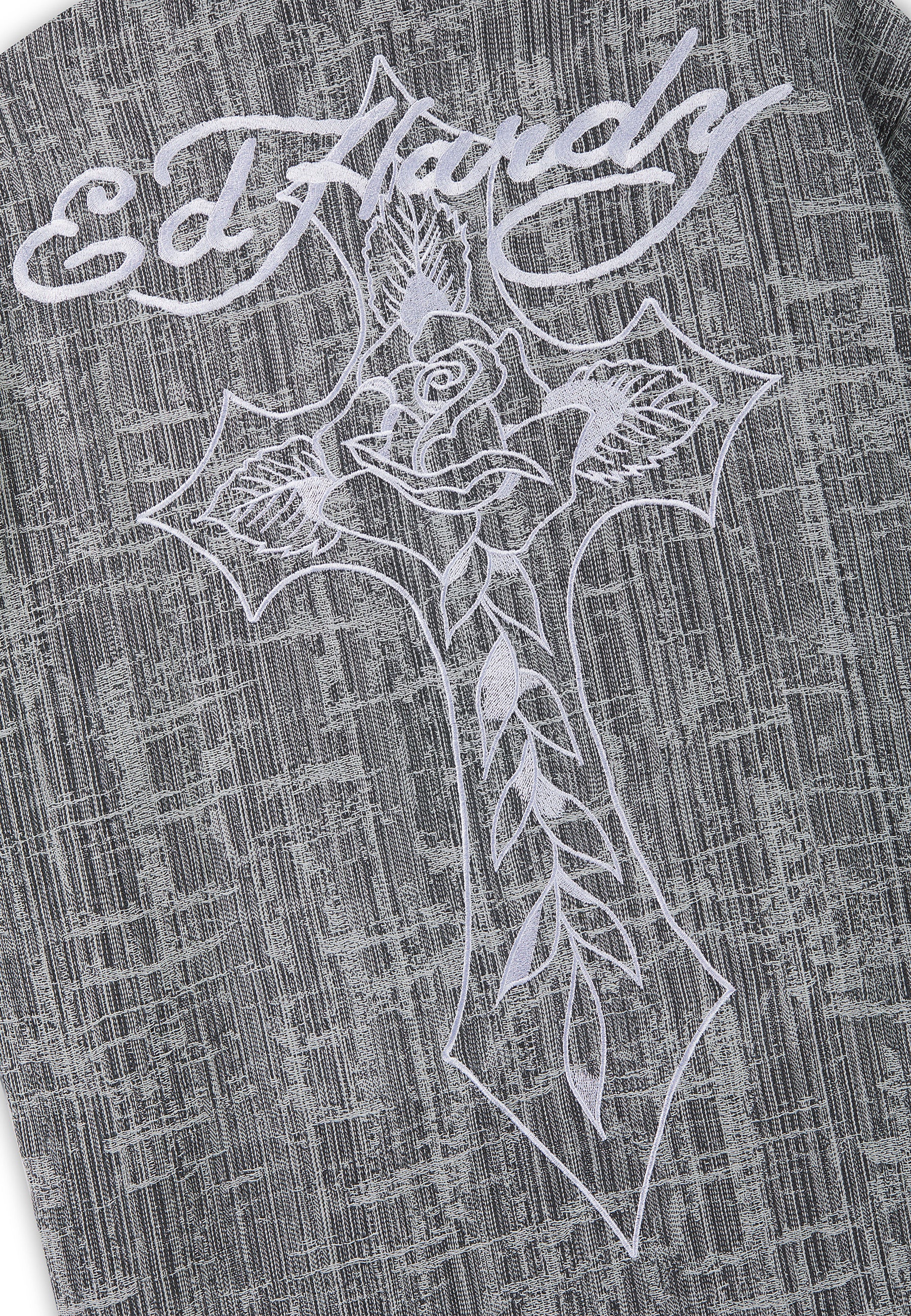 100% COTTON RELAXED FIT ENZME WASH DISTRESSED FABRICATION ED HARDY CROSS EMBROIDERY CHEST POCKET DETAILING ED HARDY BRANDED SHANK FASTENING