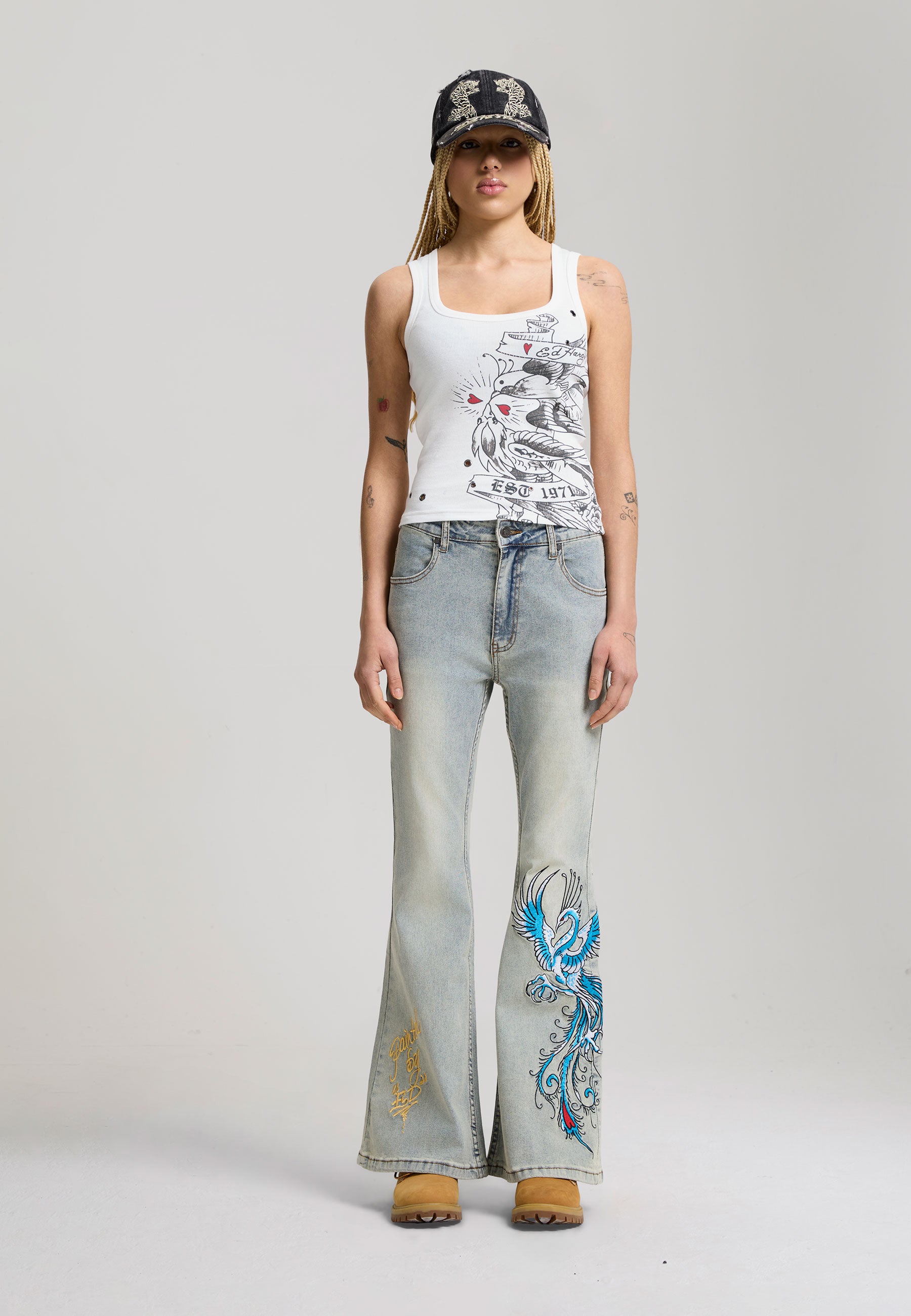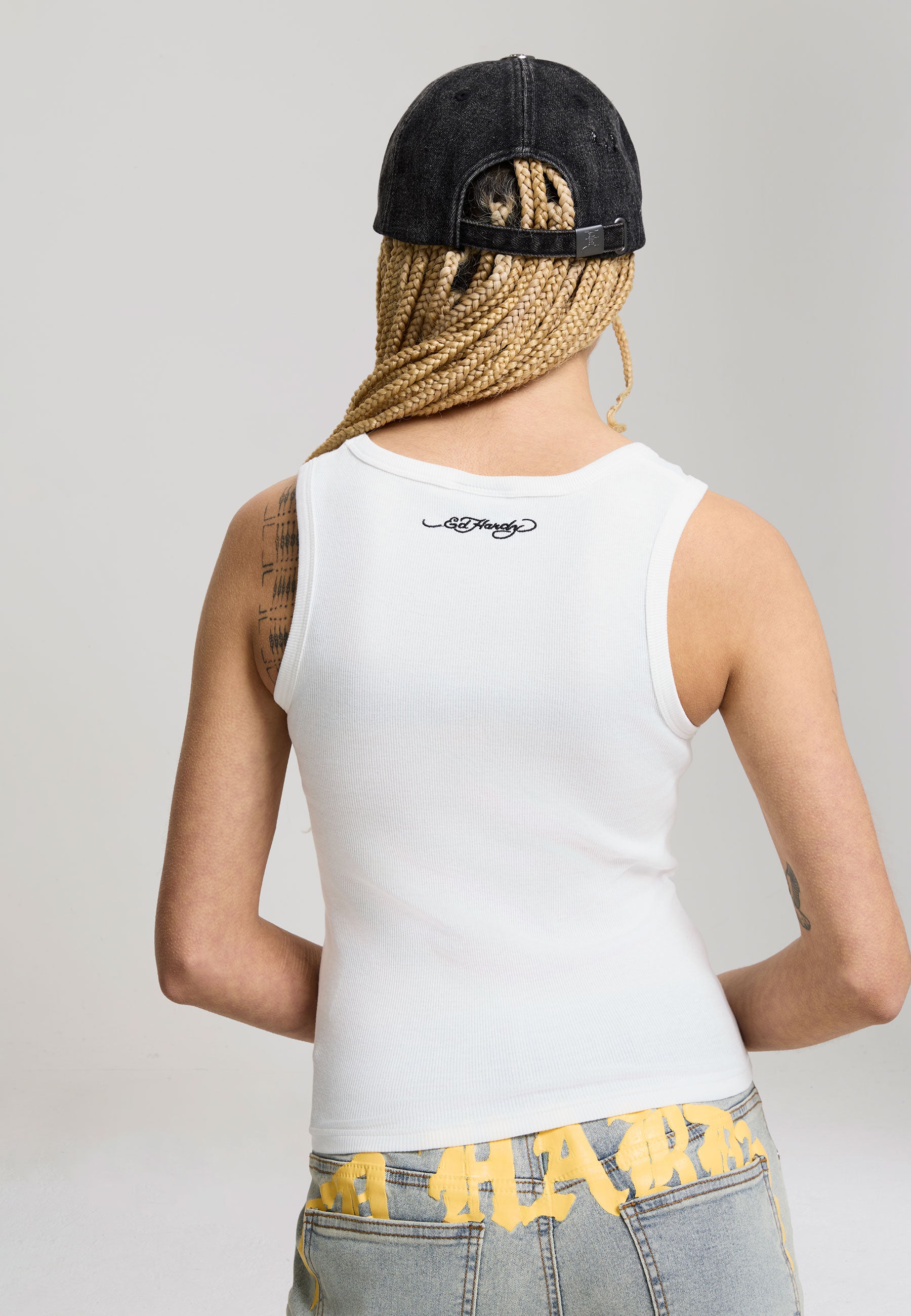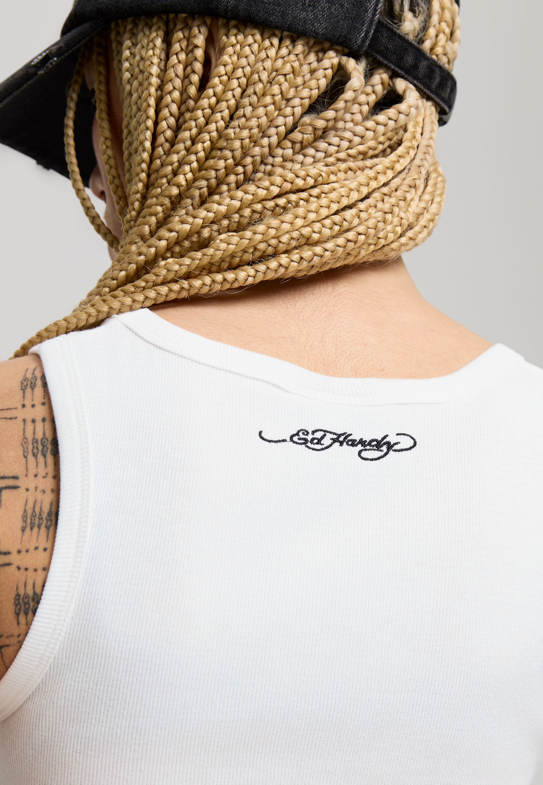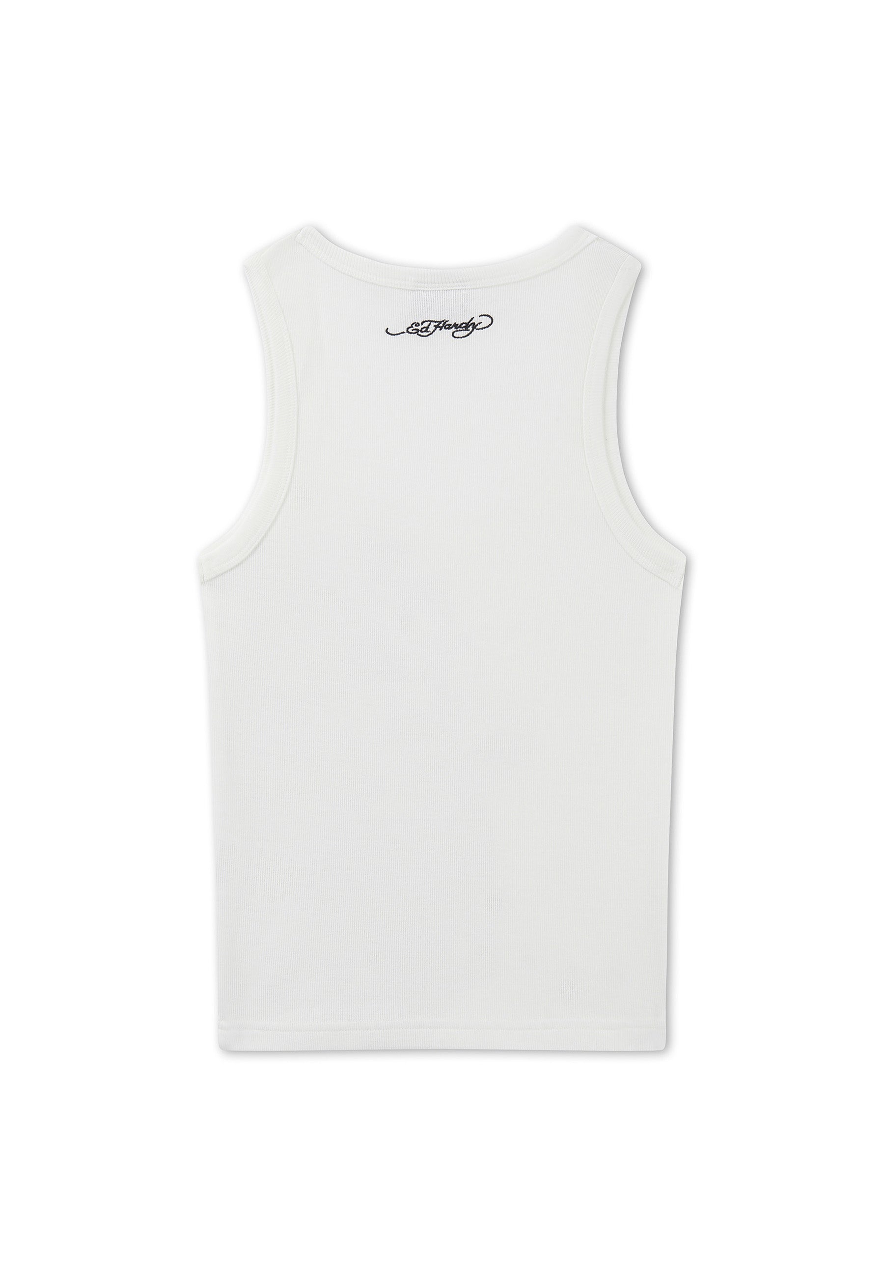 FITTED NO WASH 95% COTTON 5% ELASTANE 2x2RIB 220GSM RIBBED LOVE BIRDS GRAPHIC PRINT TO FRONT ED HARDY SIGNATURE EMBROIDERY TO BACK EYELET AND FLAT PRESS STUD DETAILING ROUNDED SCOOP NECKLINE