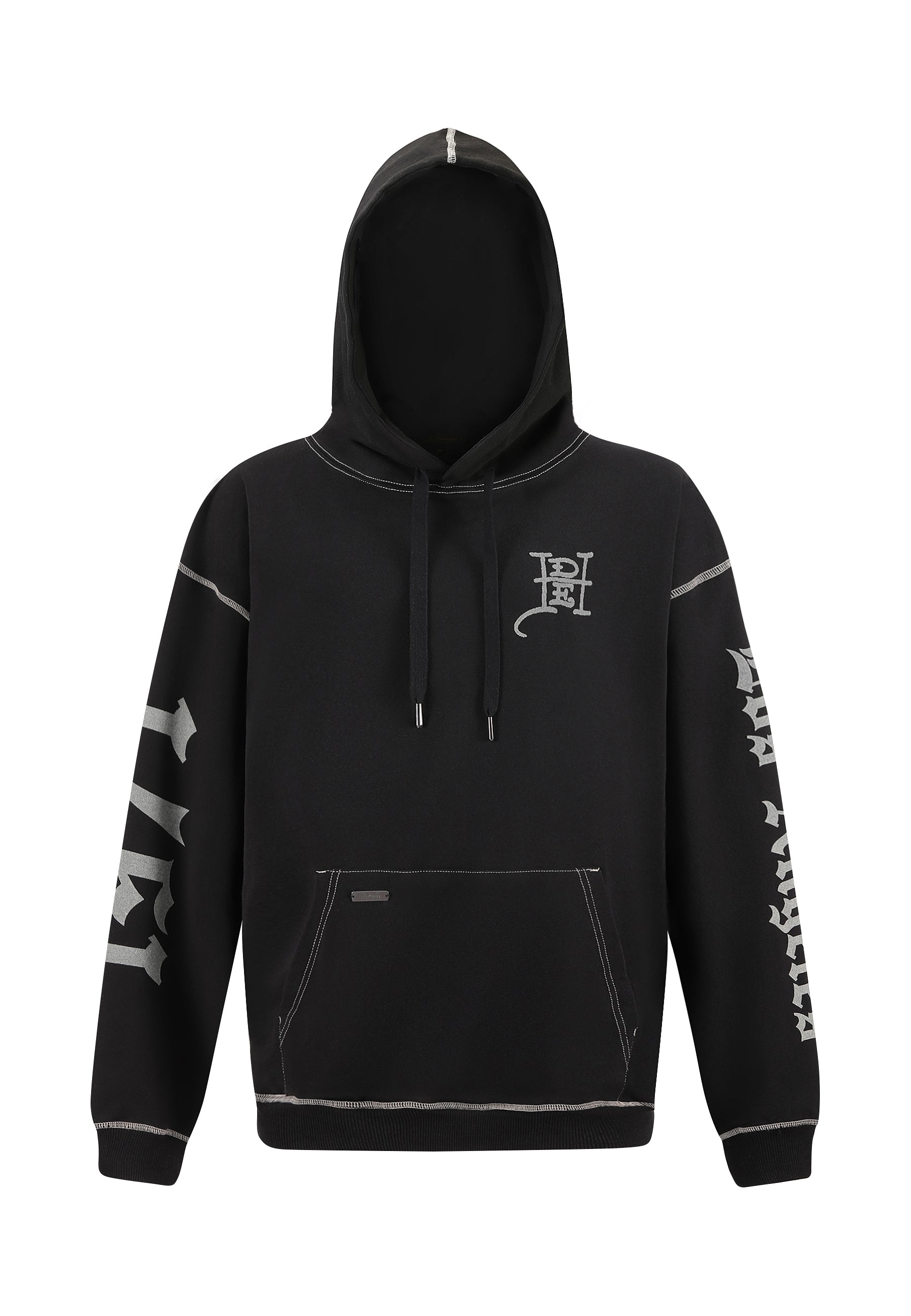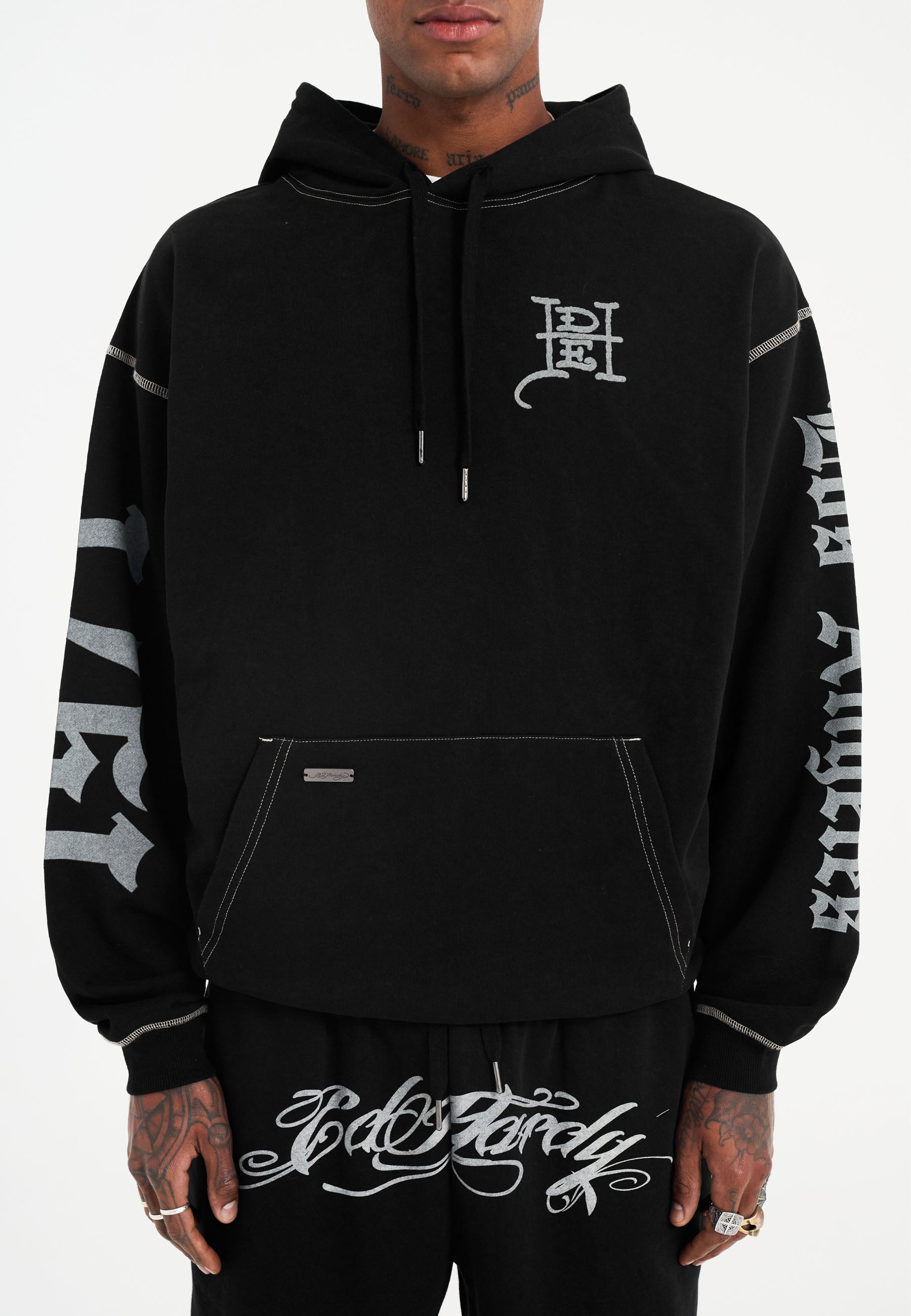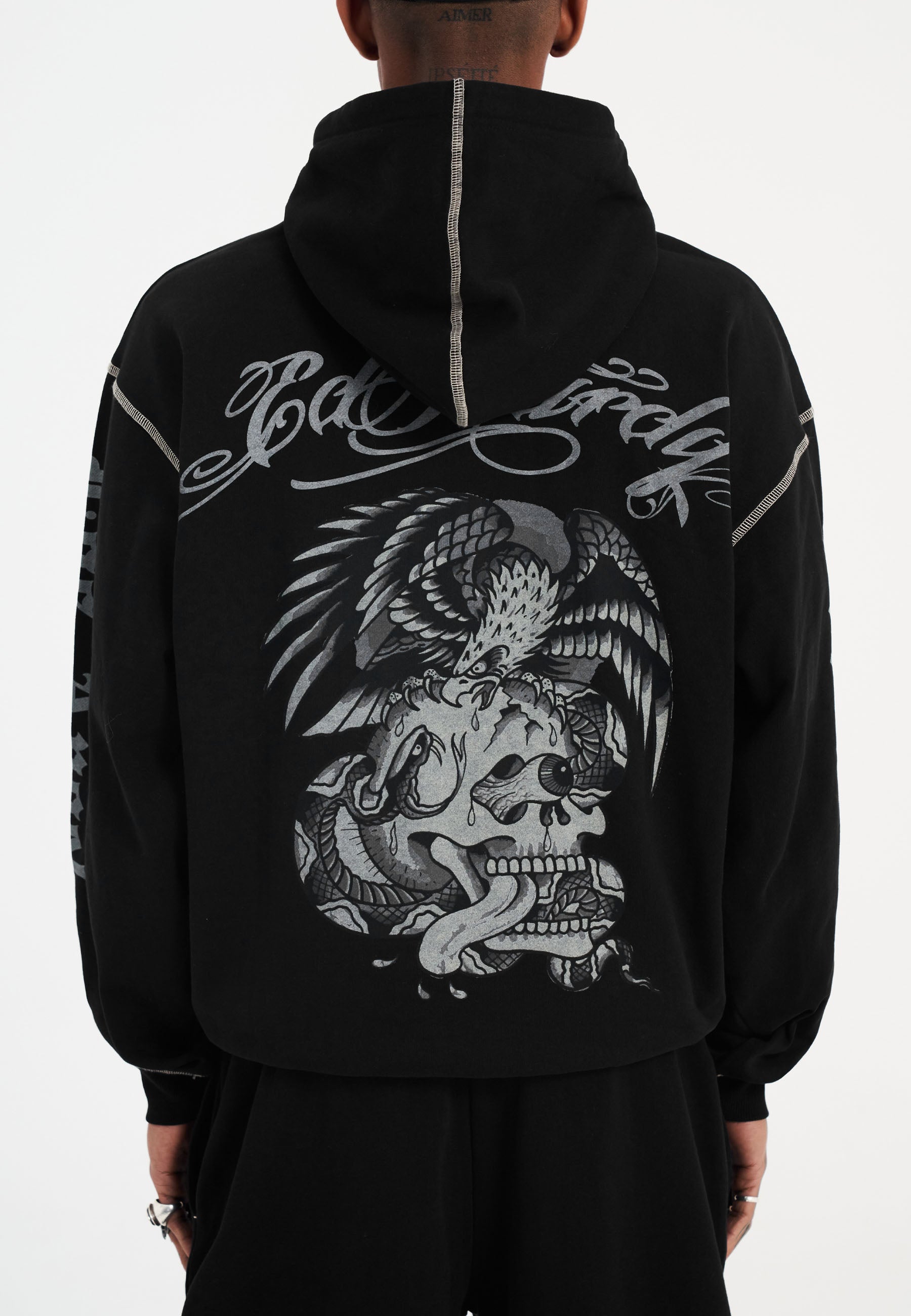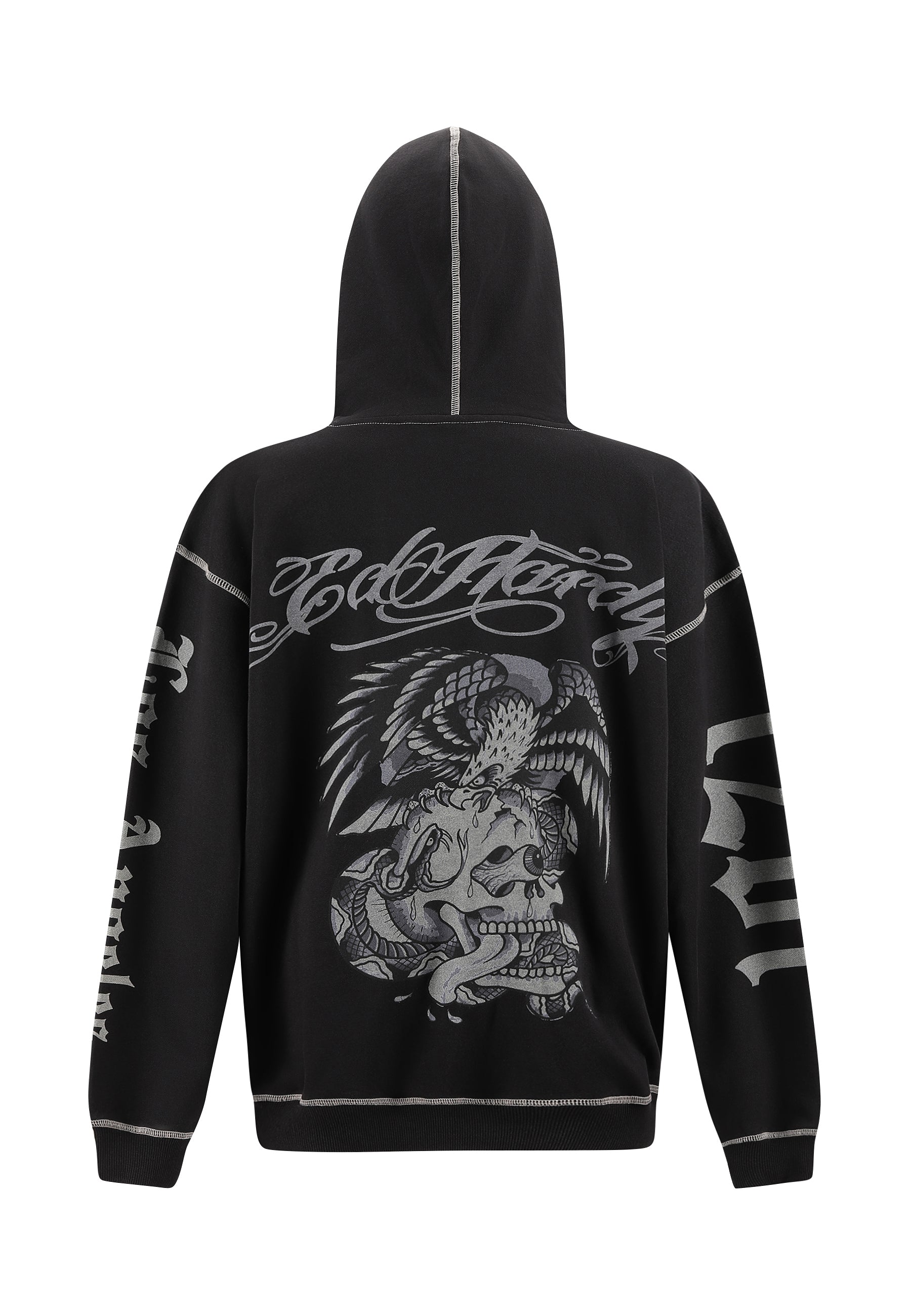 A standout piece. The Men's Gothic Skull Fight Pouch Hoodie offers a relaxed fit with unmistakable Ed Hardy style. It features a faded EH tonal logo on the chest, a bold skull tattoo graphic on the back, faded "Los Angeles" and "1971" details on the sleeves and the kangaroo pocket with a metal tab adds functionality.