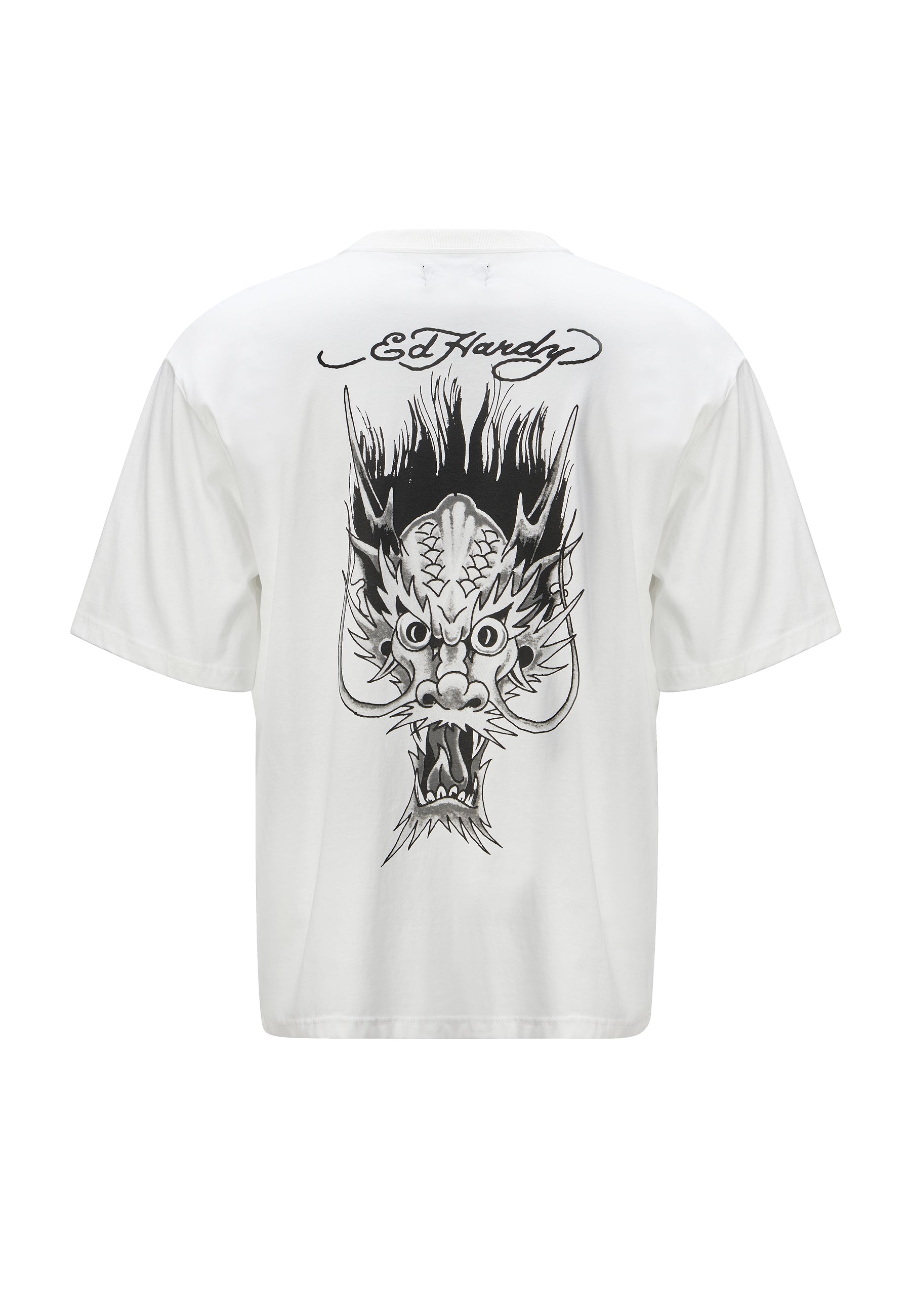 La maglietta monocromatica Drags-Back-Tonal in bianco presenta la stampa originale della testa di drago di The Don in stampa in scala di grigi ad alta definizione su larga scala sul retro, così come la firma sul petto e sui fianchi.