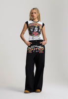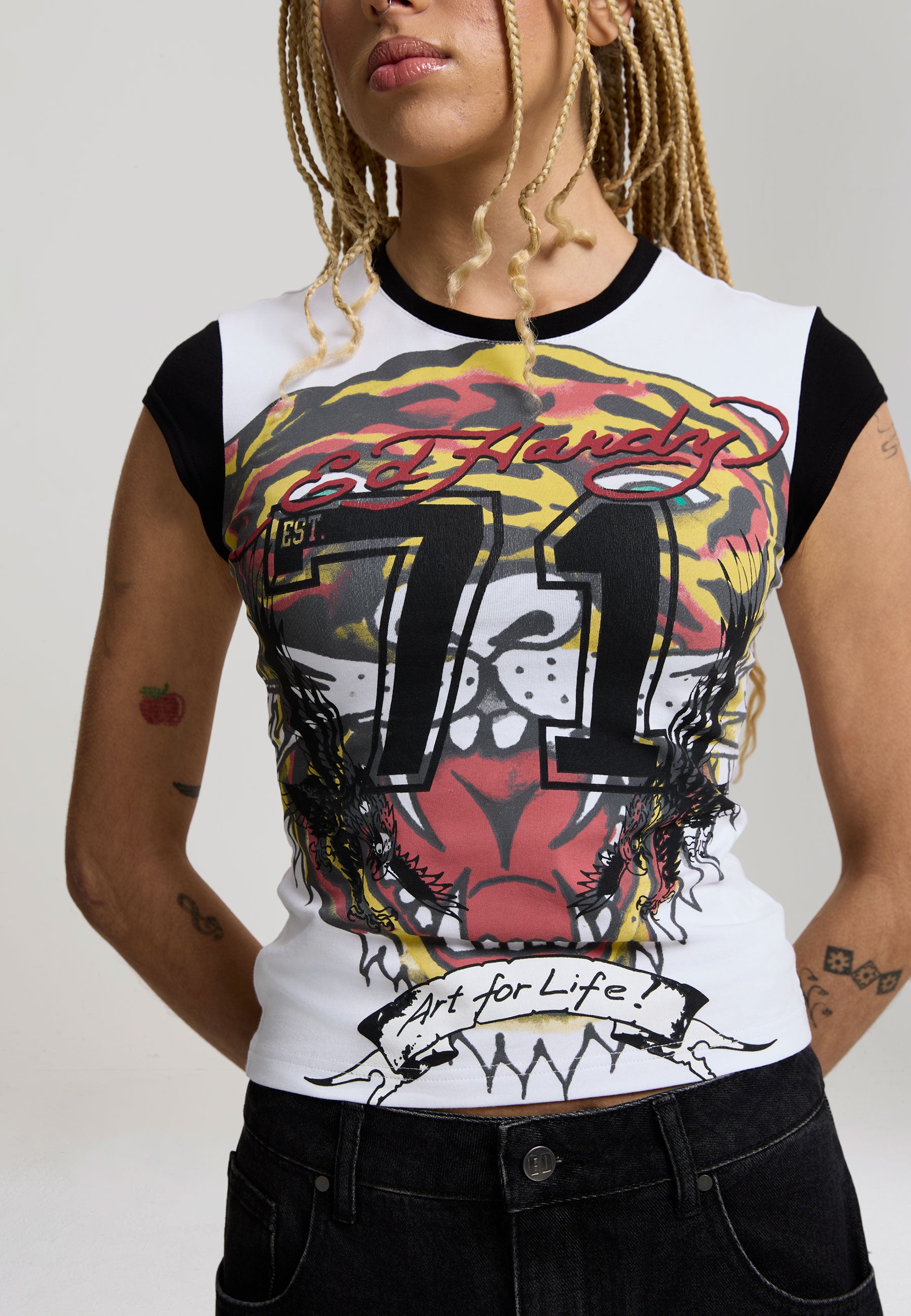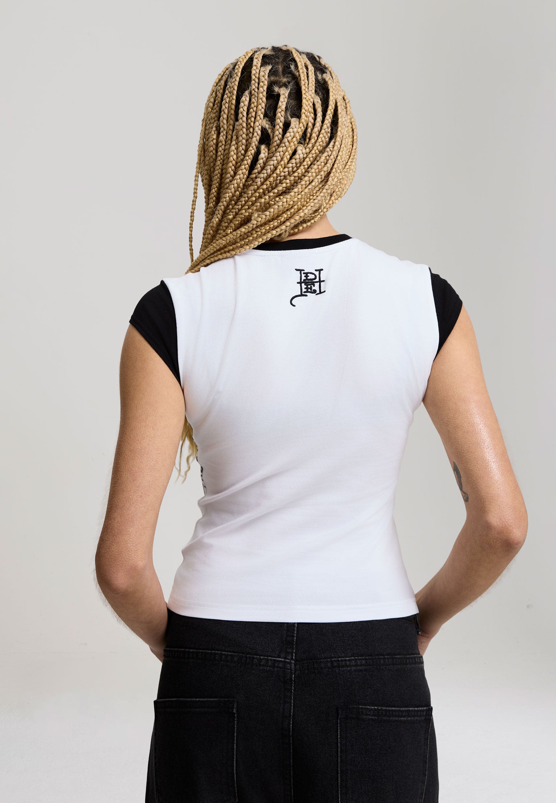 CAP SLEEVE SHAPE CONTRAST SLEEVE AND NECK PRINTED GRAPHIC TO FRONT EDH SIGN OFF TO BACK NECK COTTON ELASTANE MIX