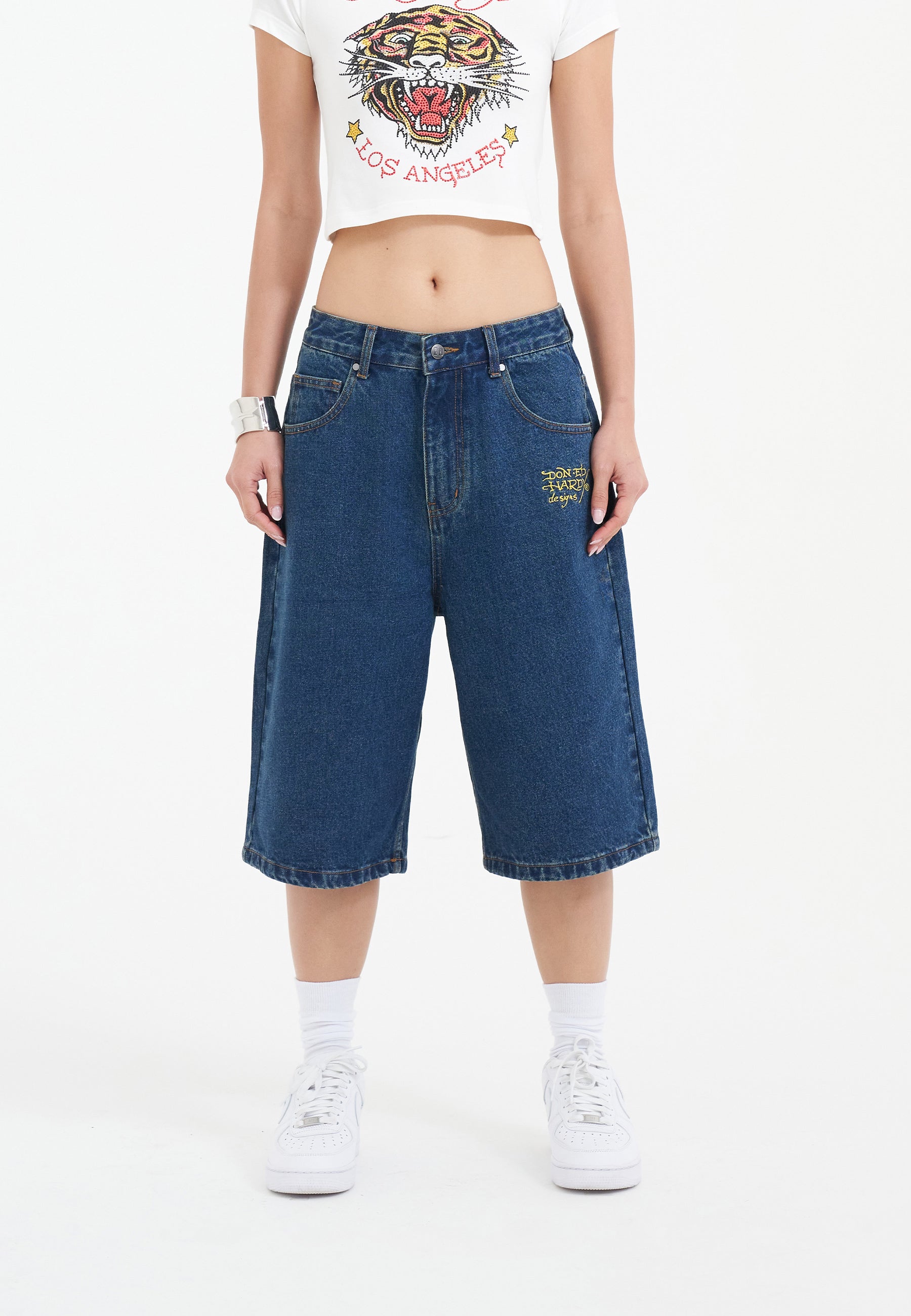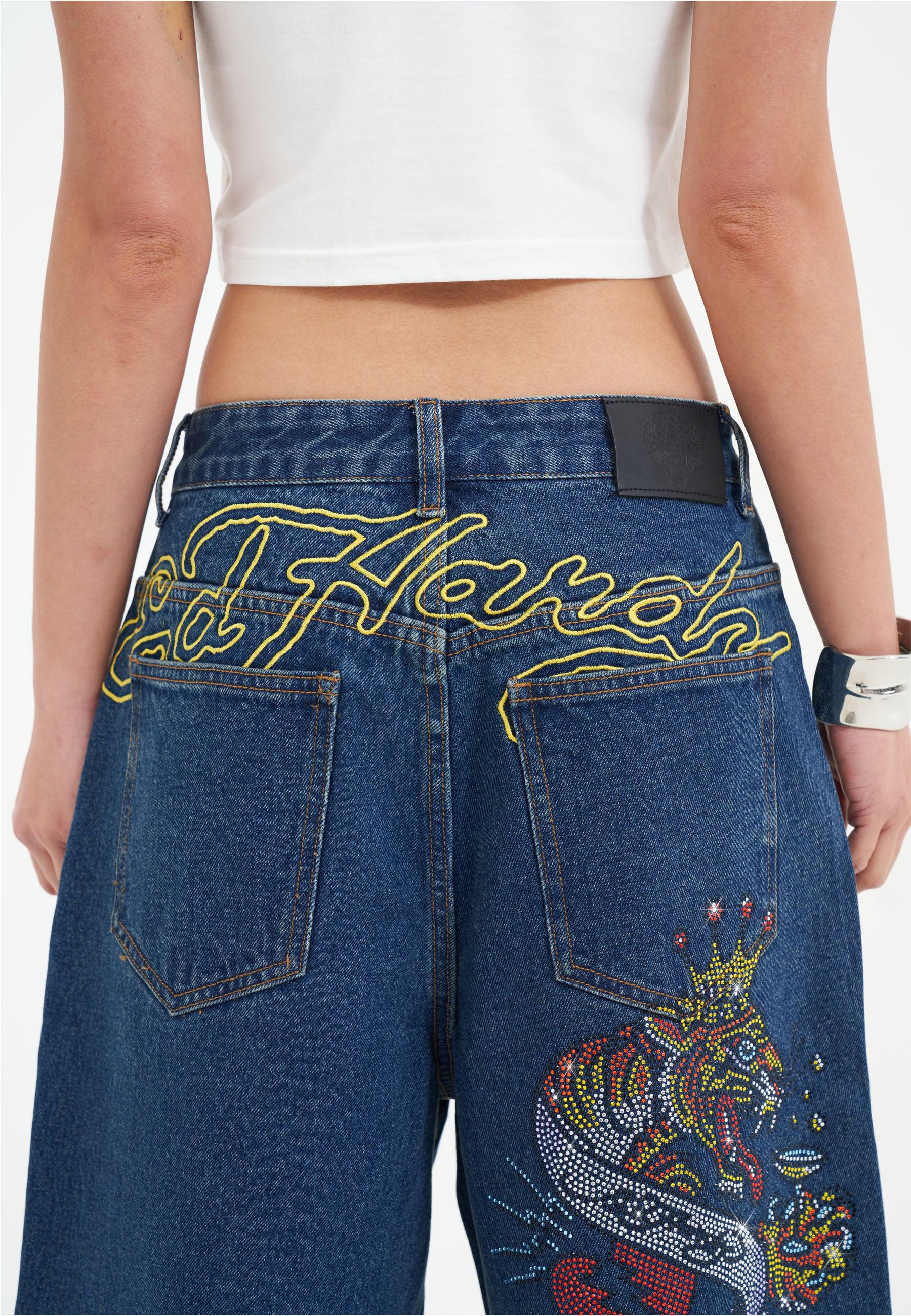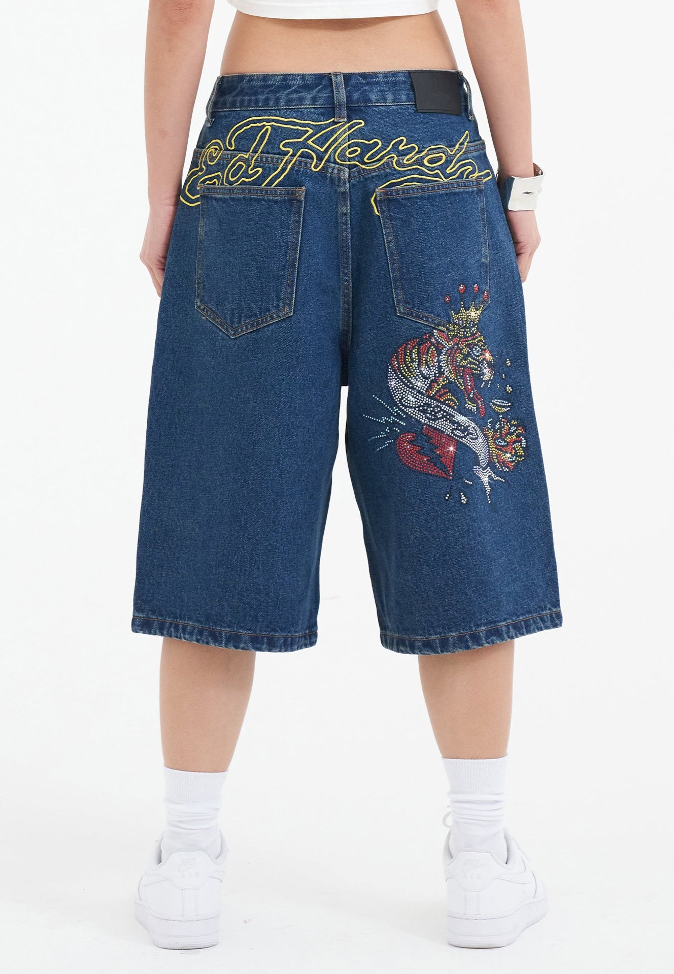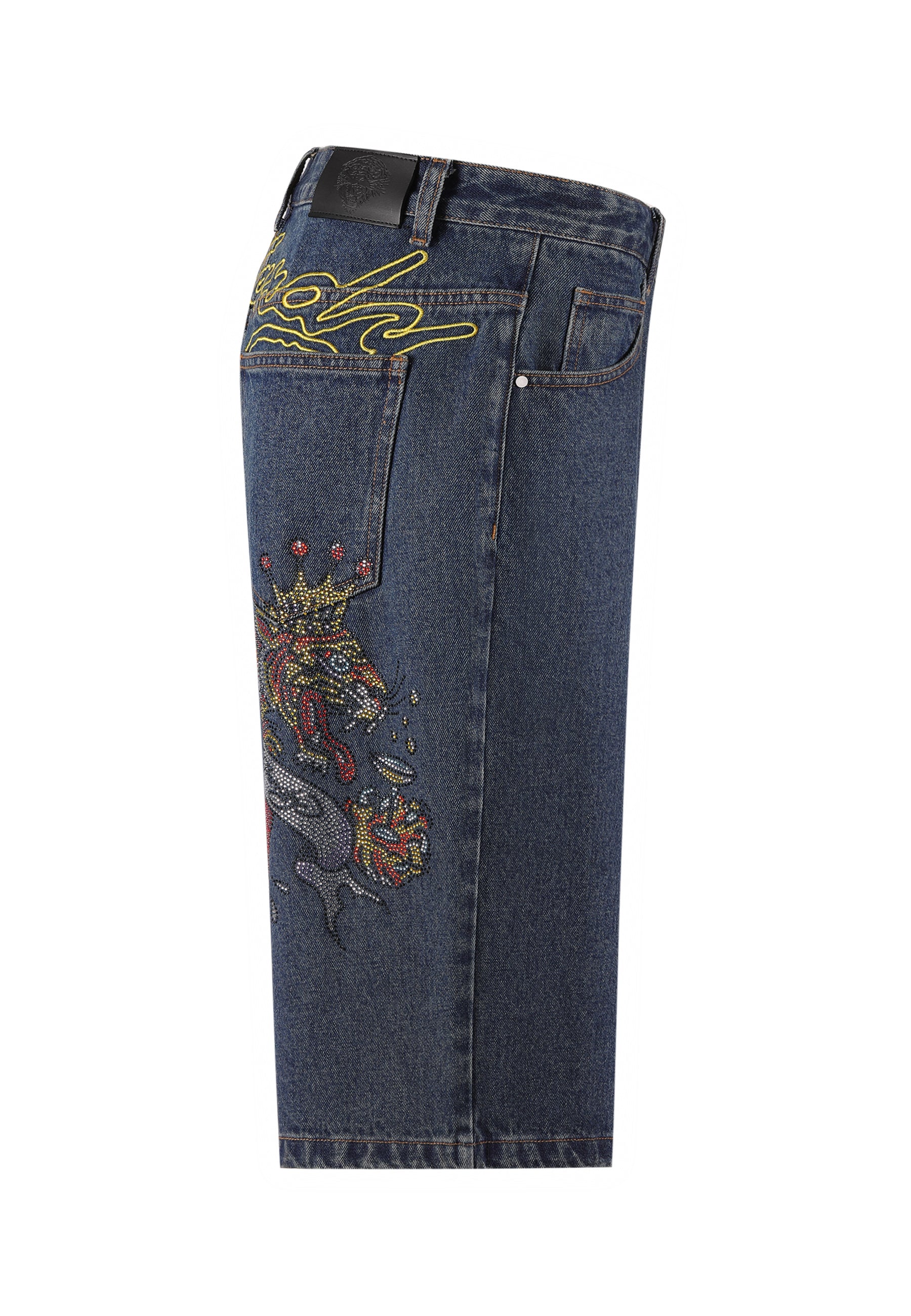 Dames Tiger King Diamante Denim Jorts Shorts - Indigo