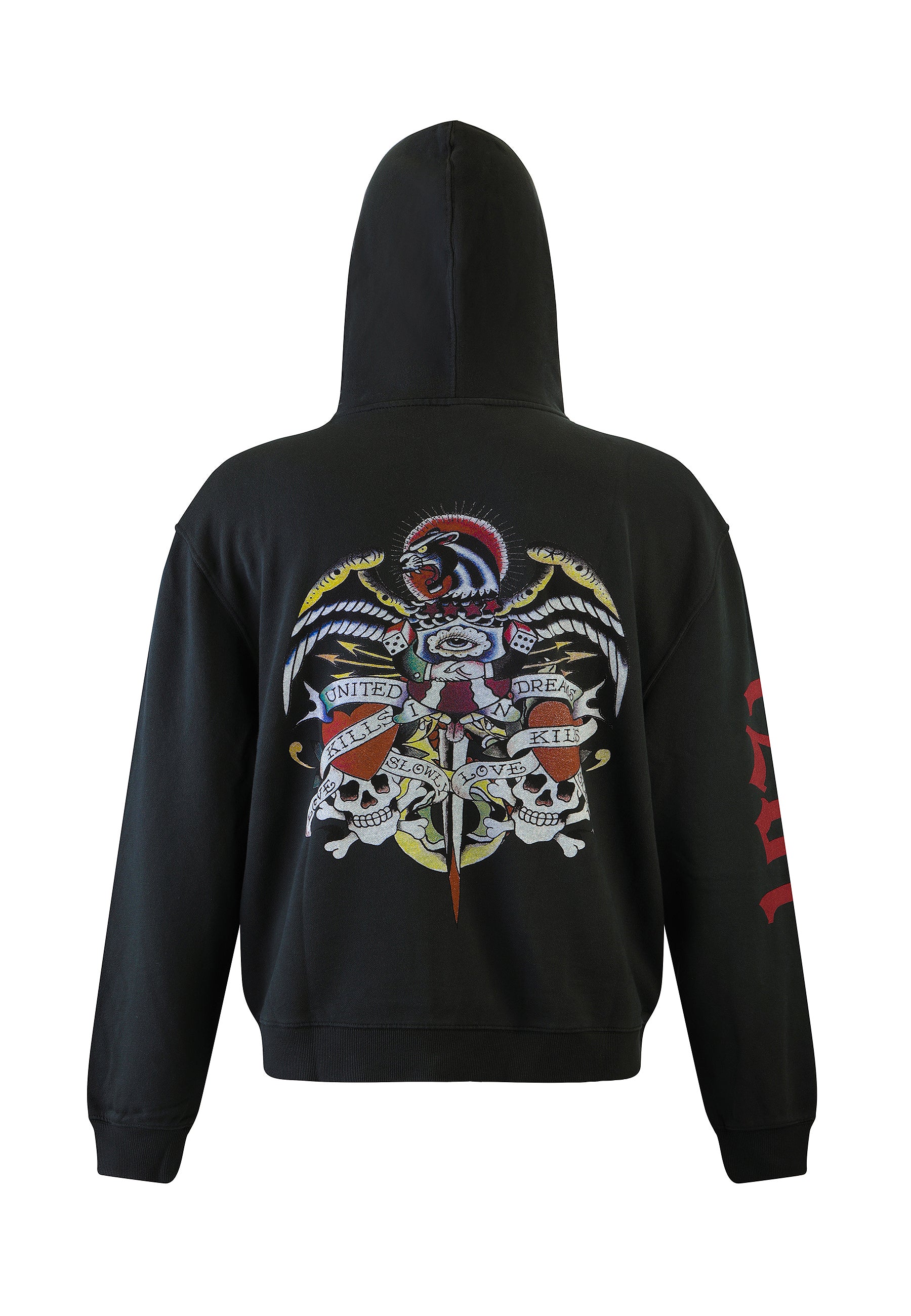 Dit premium exemplaar belichaamt Ed Hardy's talent voor het opnieuw uitvinden van iconische stijlen, waarbij ingewikkelde tonale borduursels en eersteklas vakmanschap worden gecombineerd met de punkinvloeden van dit seizoen.