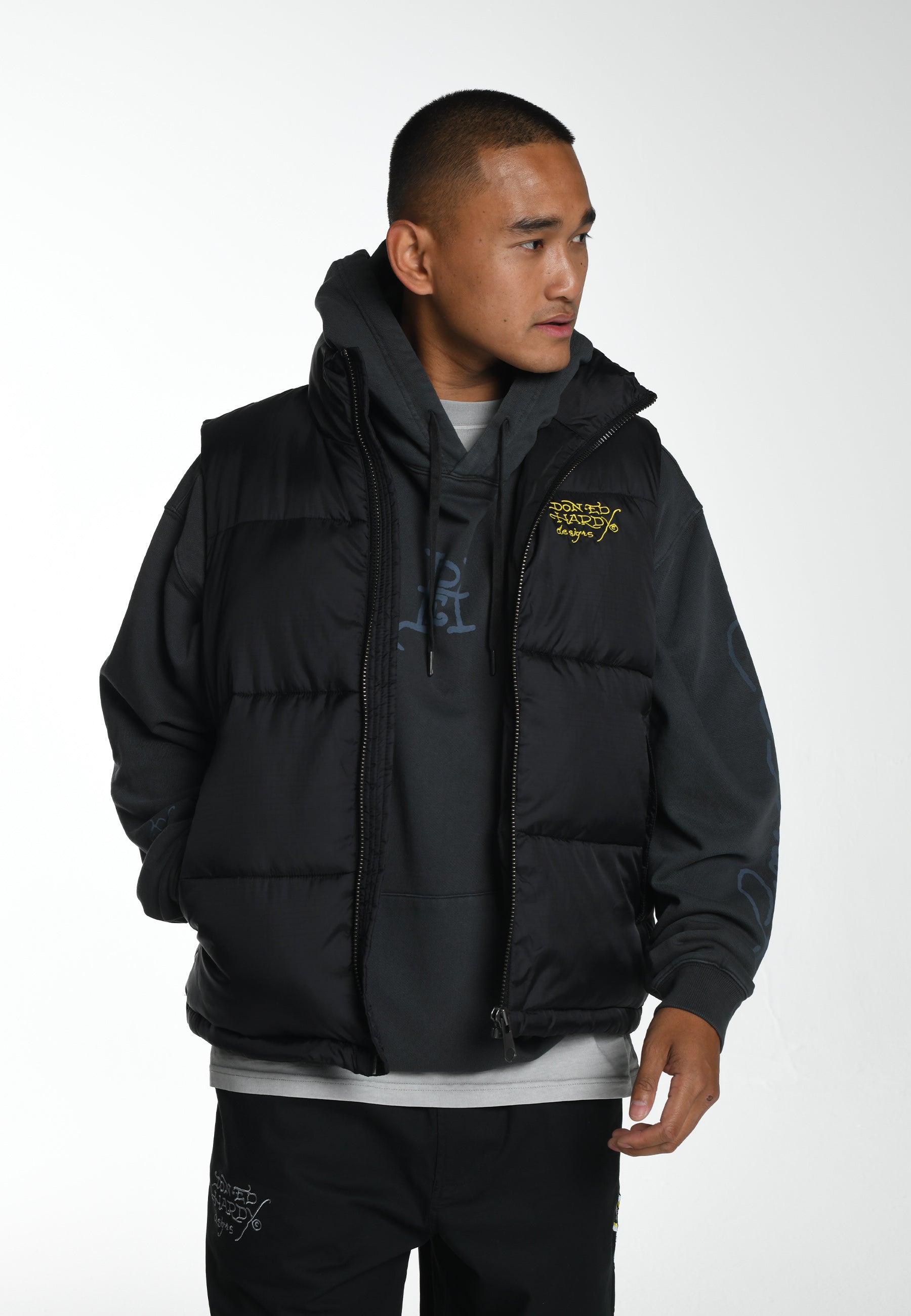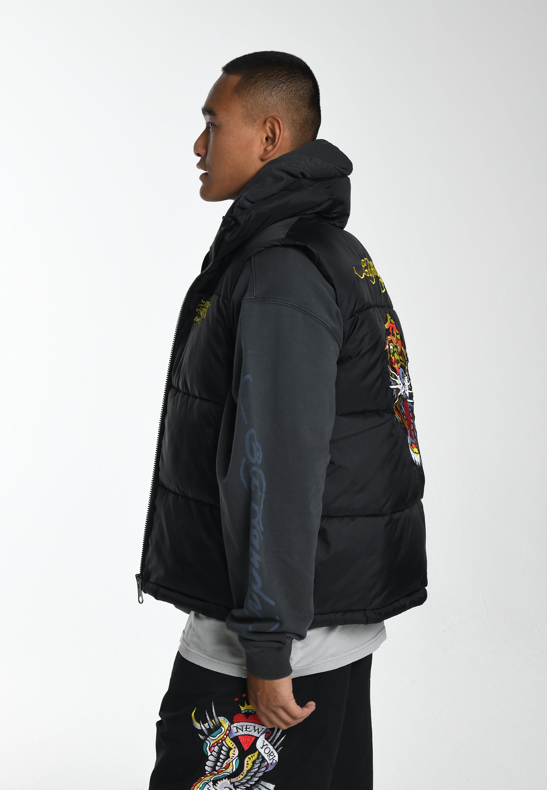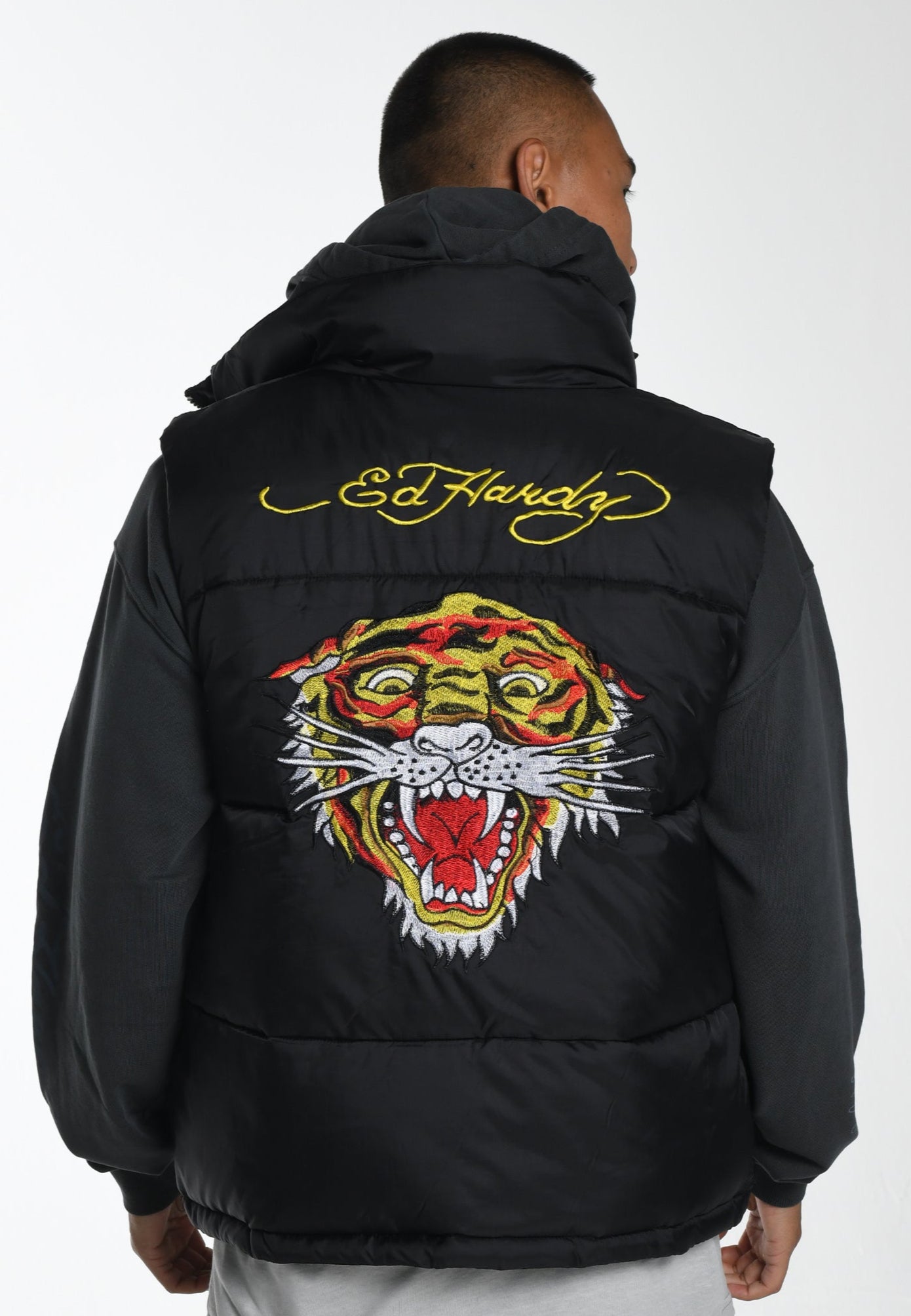 Een onmisbaar item voor het nieuwe seizoen: het Tiger Head Gillet Puffer Jacket biedt superieur comfort van 100% nylon, met een full colour, opvallende geborduurde afbeelding op de achterkant en een subtiel Ed Hardy-monogram op de borst.