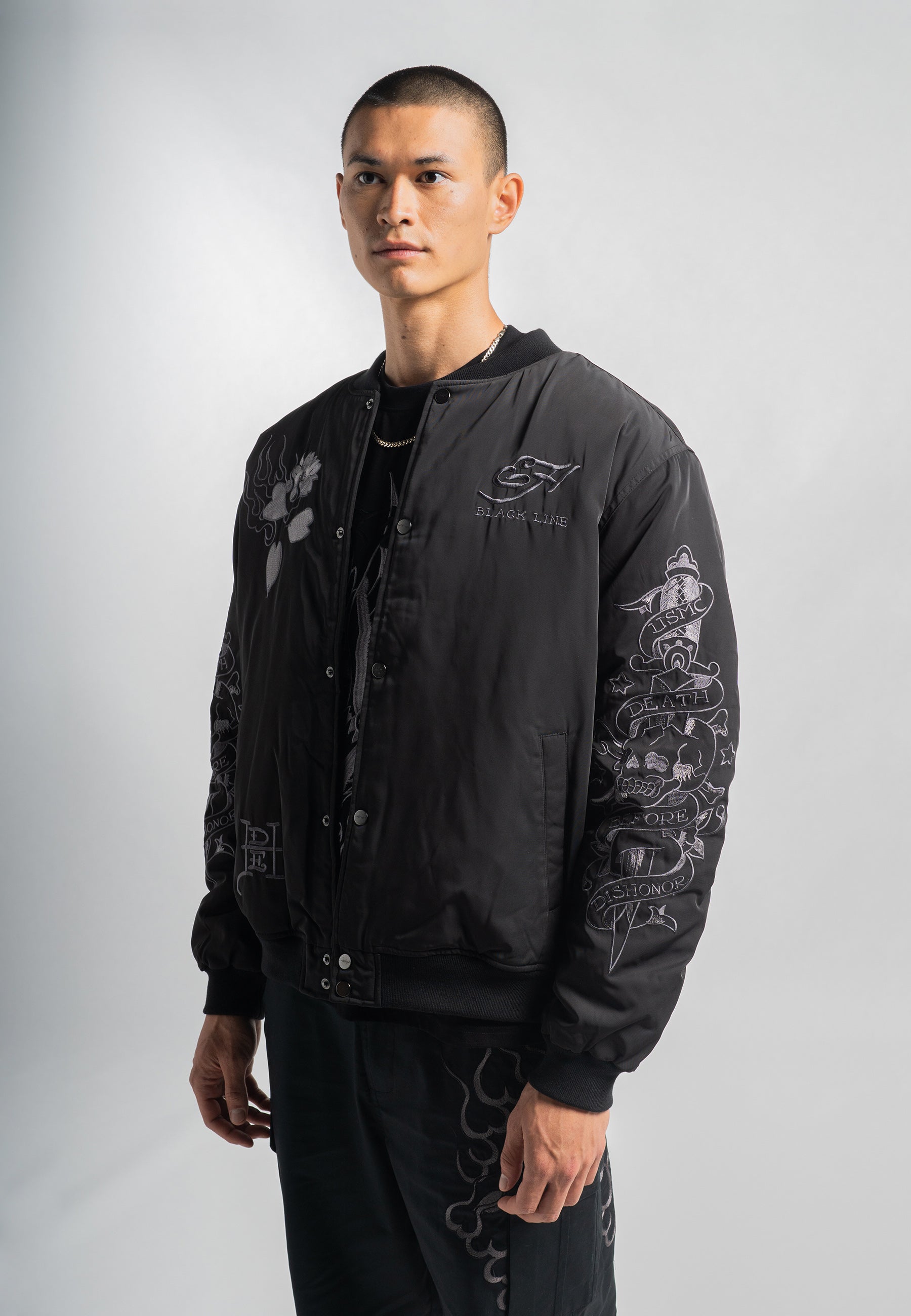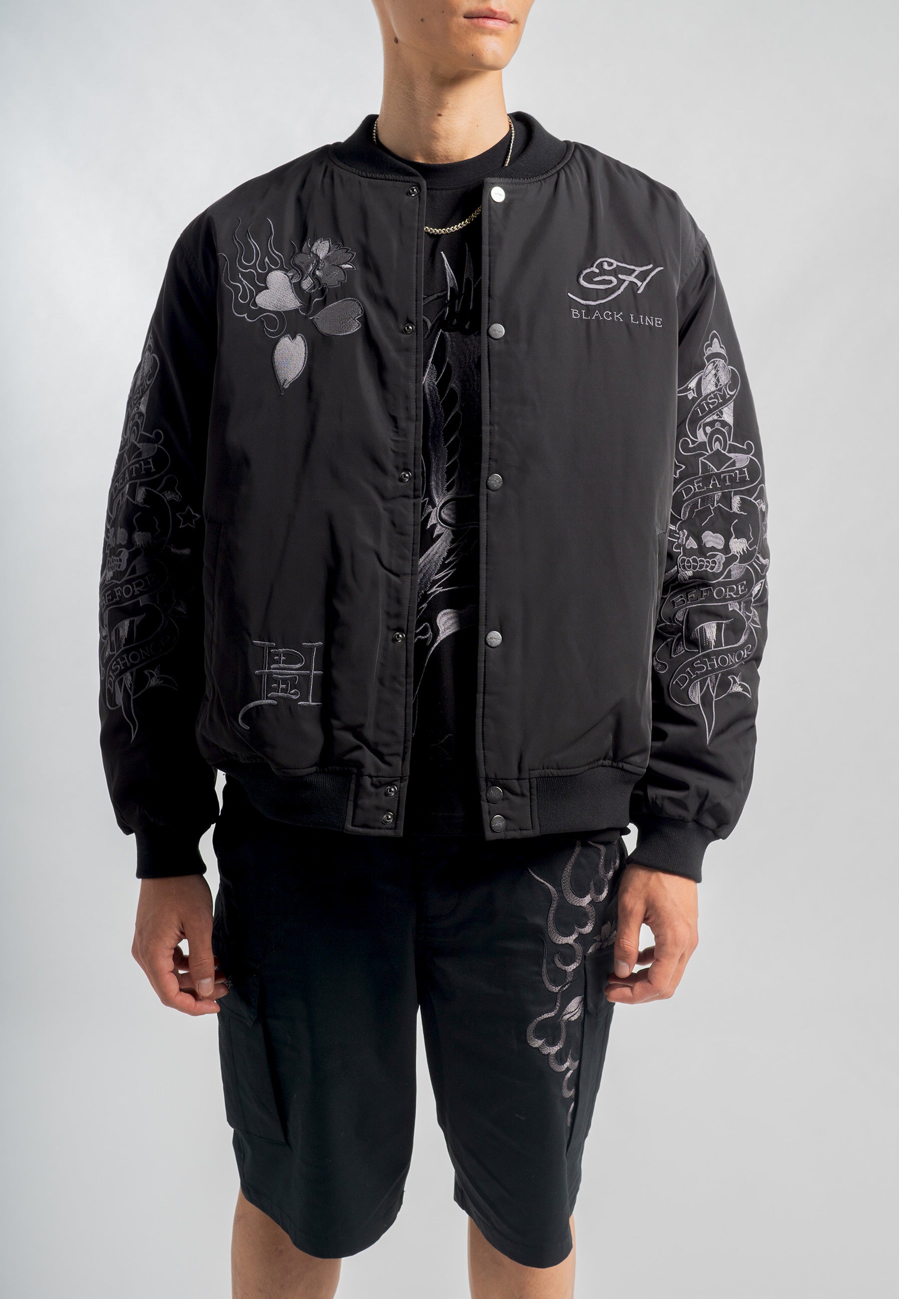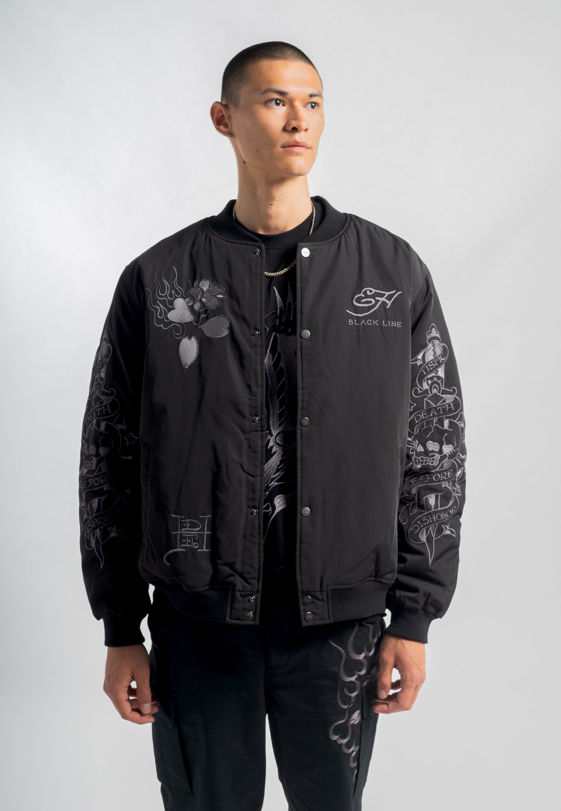 Dit premium exemplaar belichaamt Ed Hardy's talent voor het opnieuw uitvinden van iconische stijlen, waarbij ingewikkelde tonale borduursels en eersteklas vakmanschap worden gecombineerd.