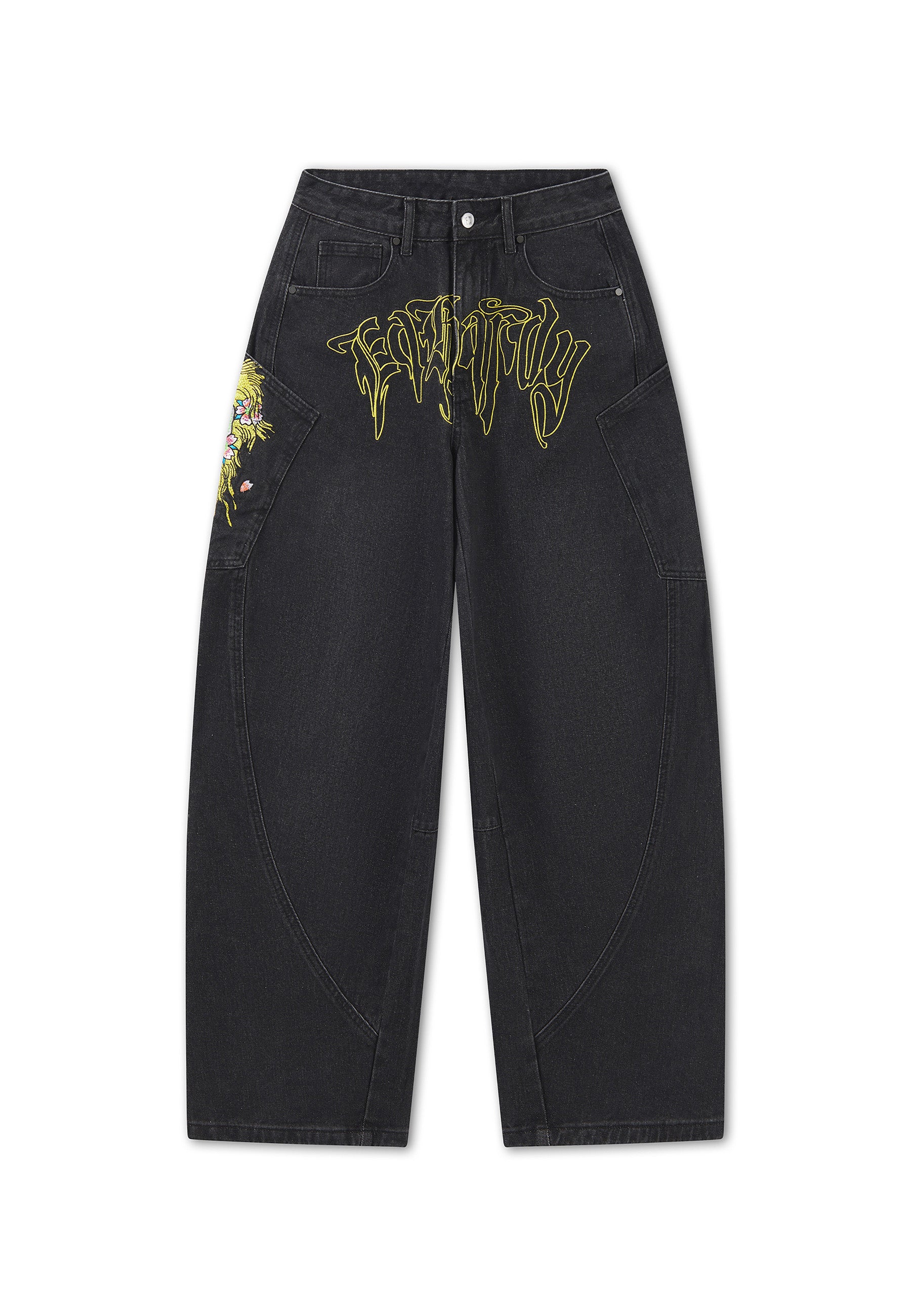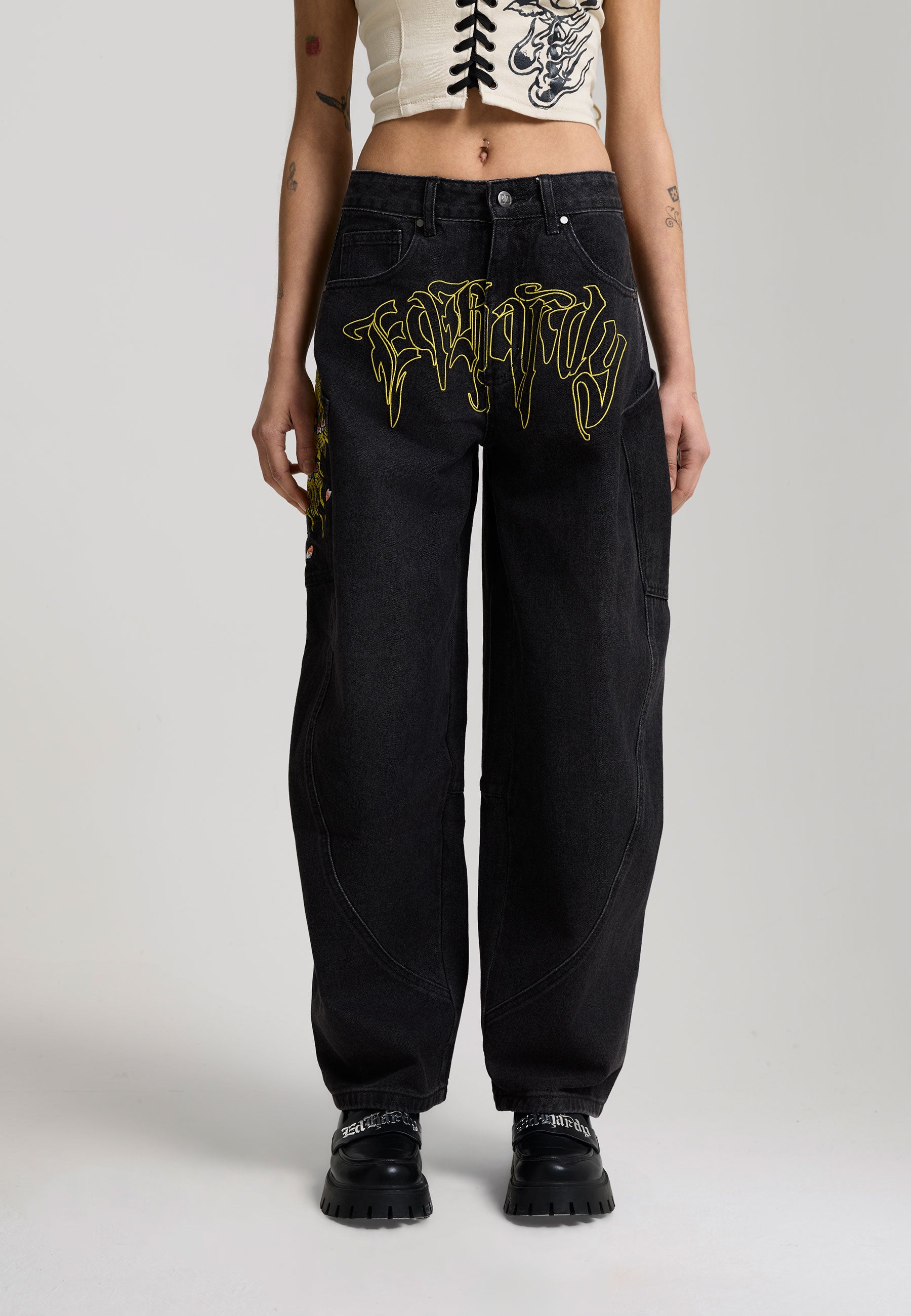 BALLOON LEG FIT NO WASH 90% COTTON 10% POLYESTER OUTLINE GOTHIC ED HARDY EMBROIDERY TO FRONT HIGH QUALITY GRAPHIC EMBROIDERY ON POCKET DON ED HARDY EMBROIDERY TO BACK LEFT LEG