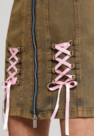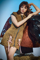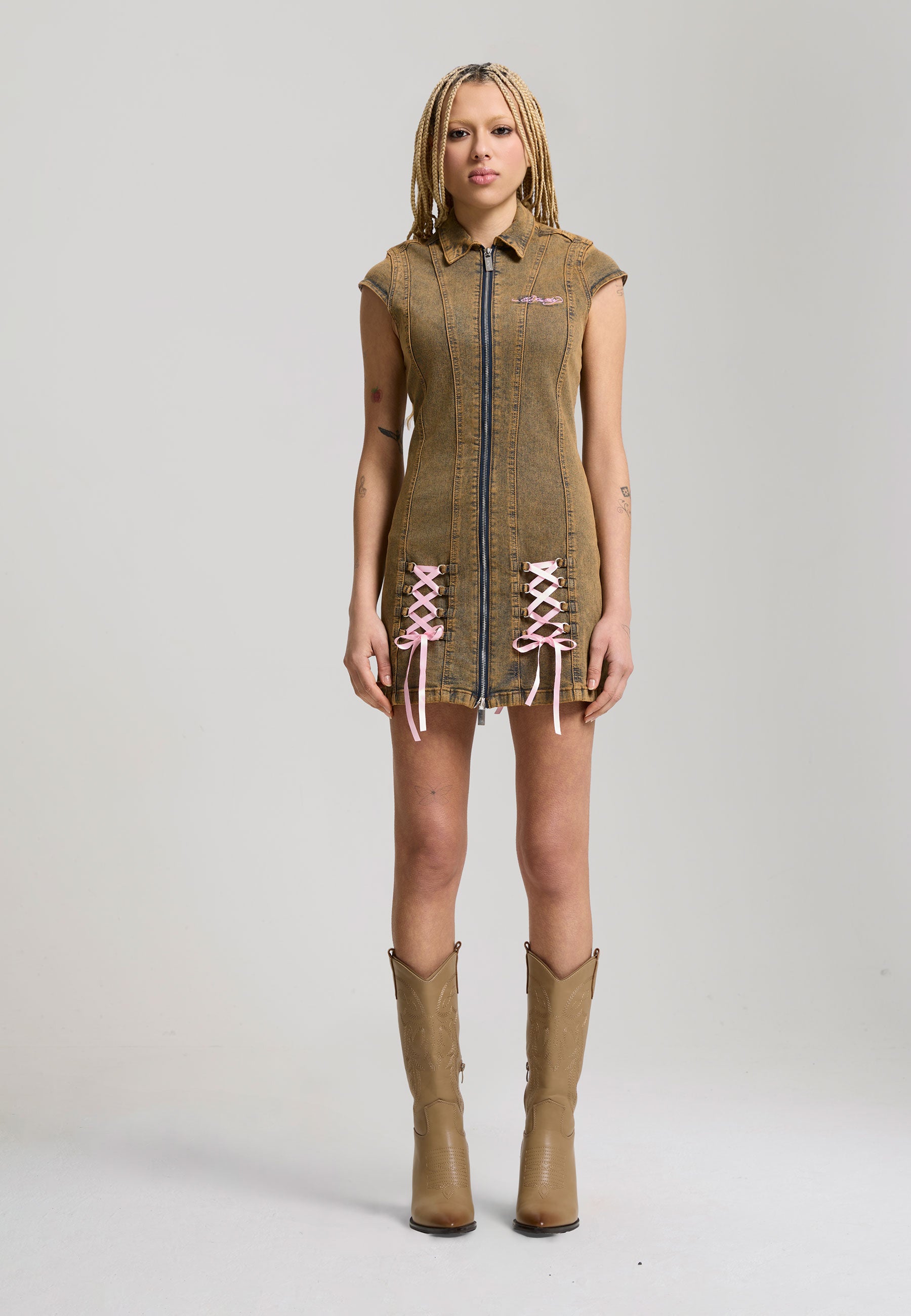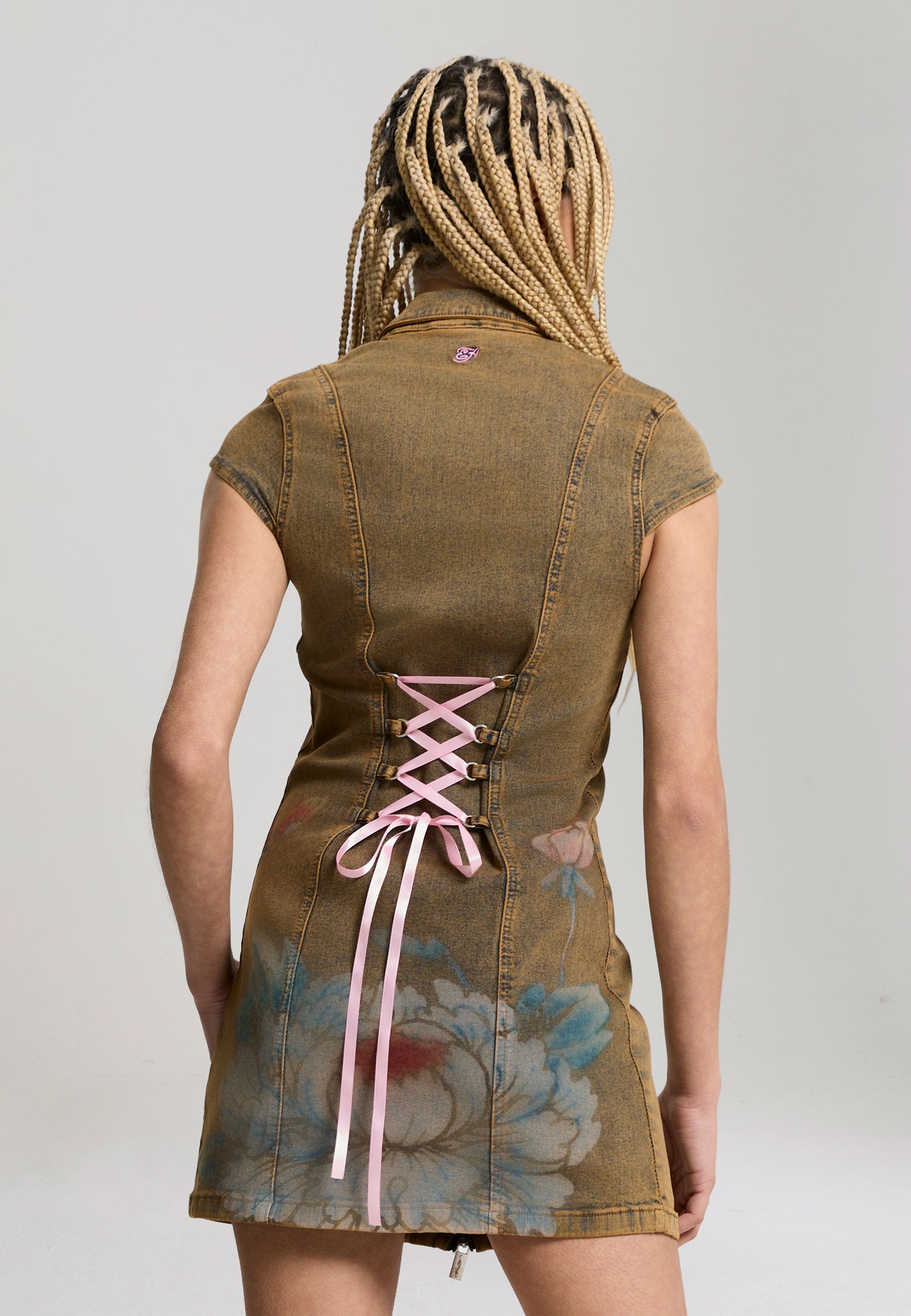 Womens Lotus Flower Seam Detail Tie Up Denim Dress - Beige