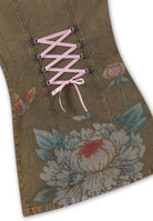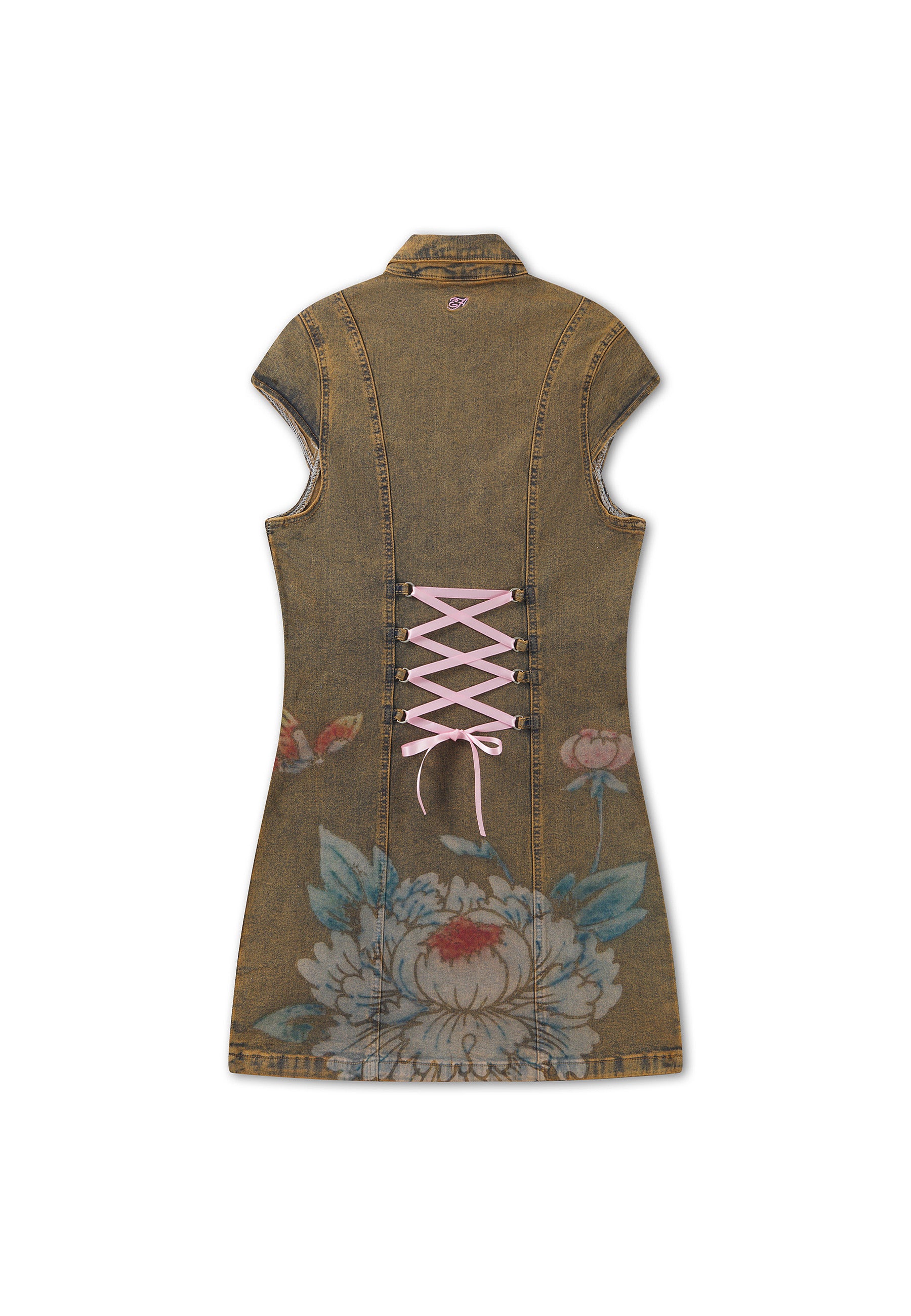 FITTED MINI LENGTH DIRTY OIL WASH 98% COTTON 2% ELASTANE ED HARDY SIGNATURE EMBROIDERY TO FRONT E.H LOGO EMBROIDERY TO BACK LOTUS FLOWER FADED GRAPHIC PRINT TO BACK CAP SLEEVE SEAM DETAILING RIBBON TIE UP DETAILING DOUBLE METAL ZIP TO FRONT REVERE COLLAR
