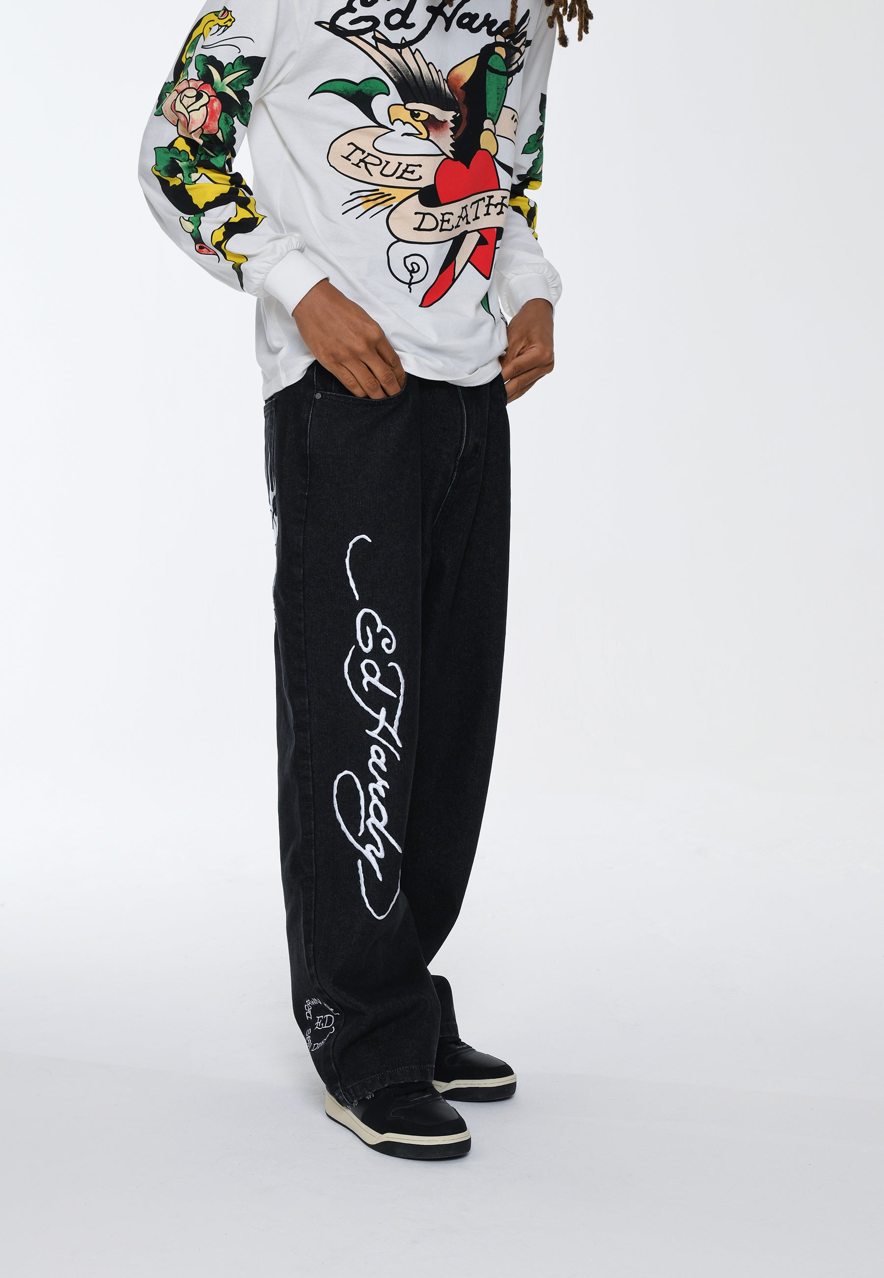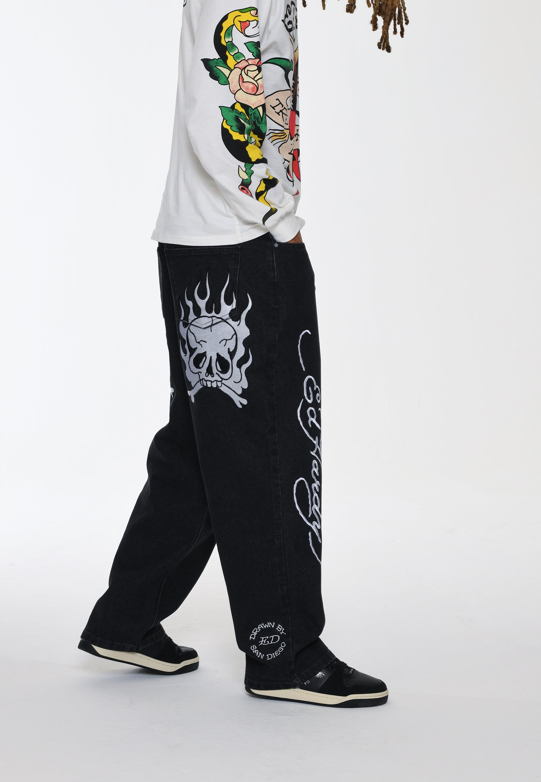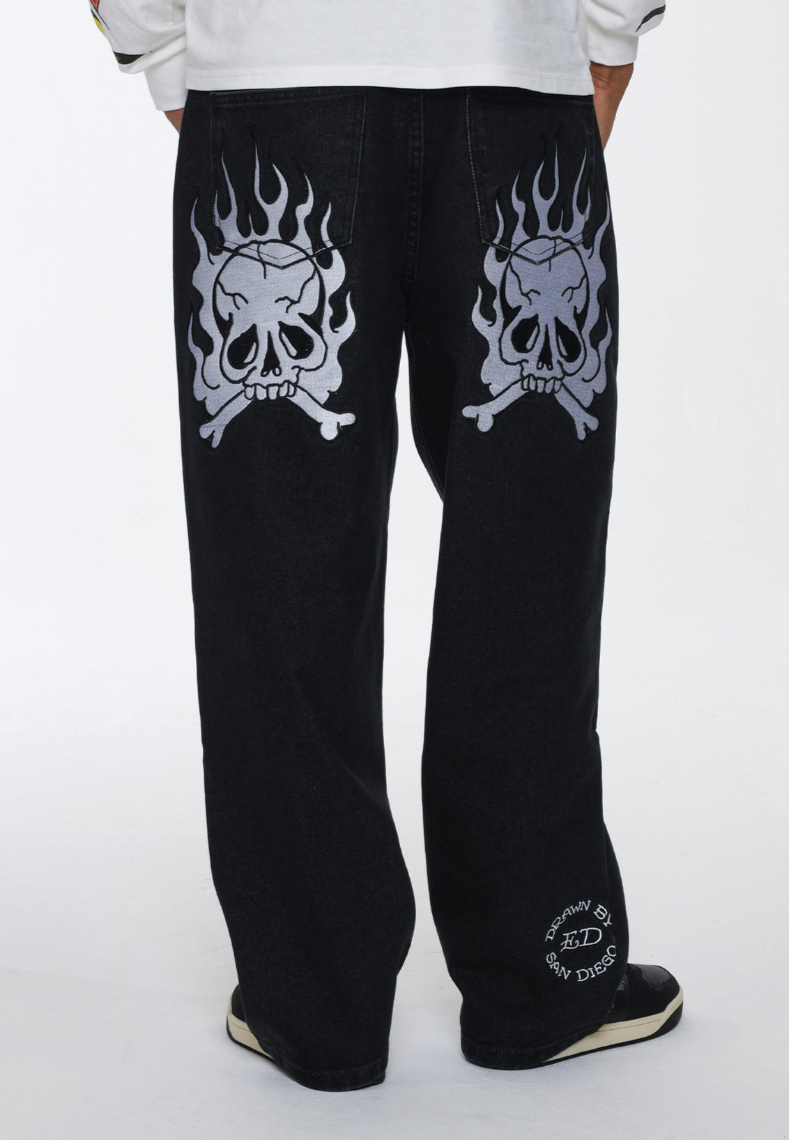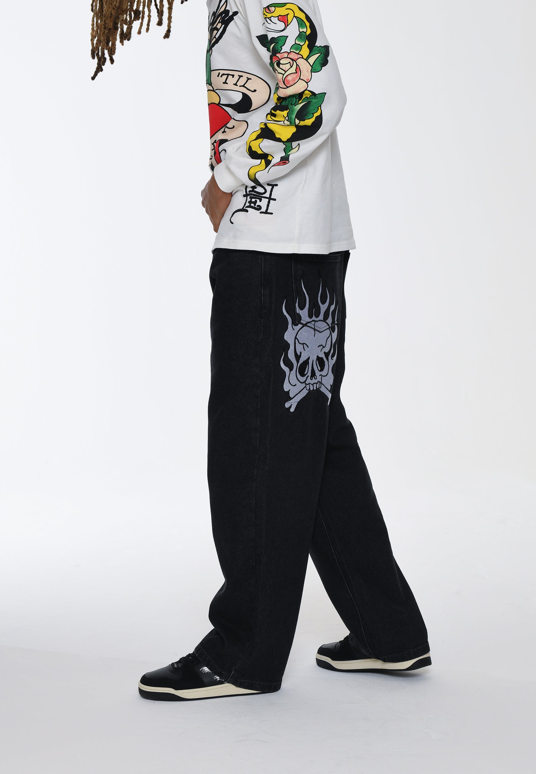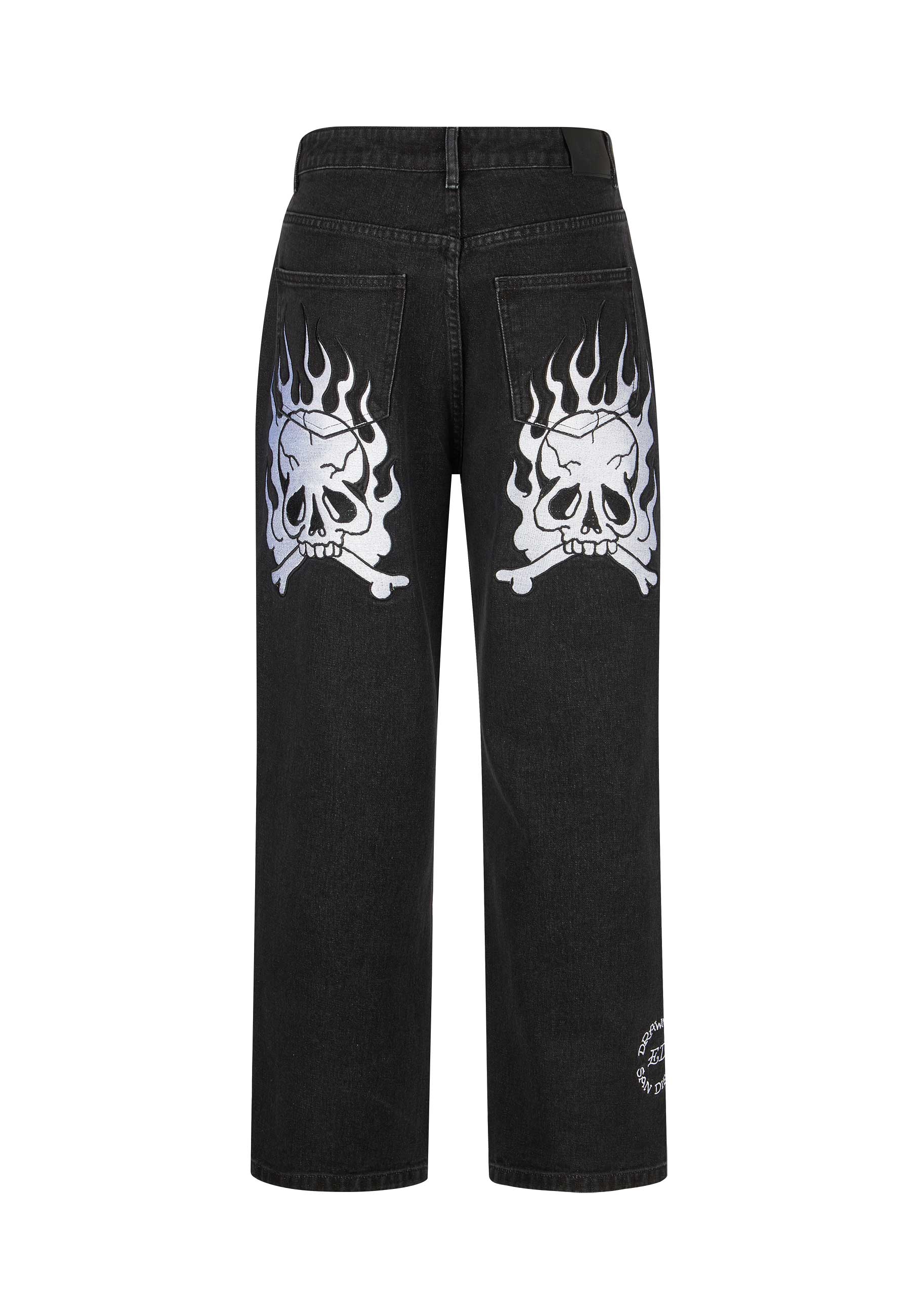 Flaming Skull Relaxed Denim Bukser Baggy Jeans - Svart