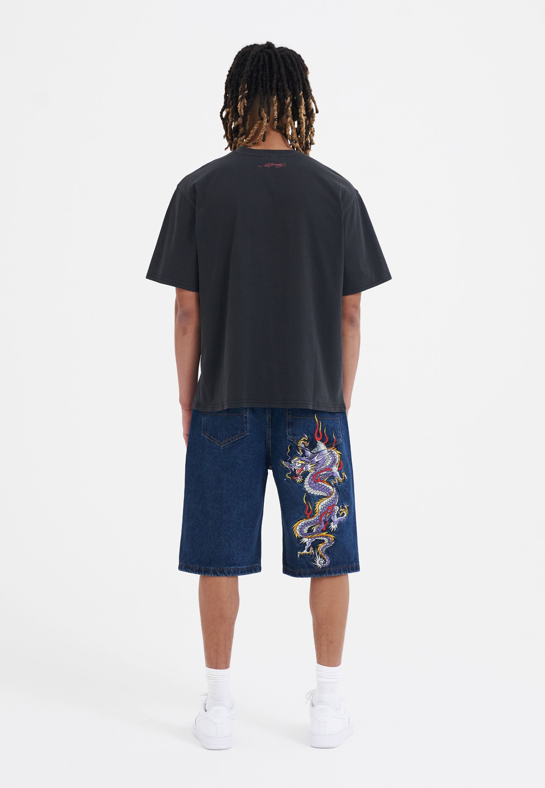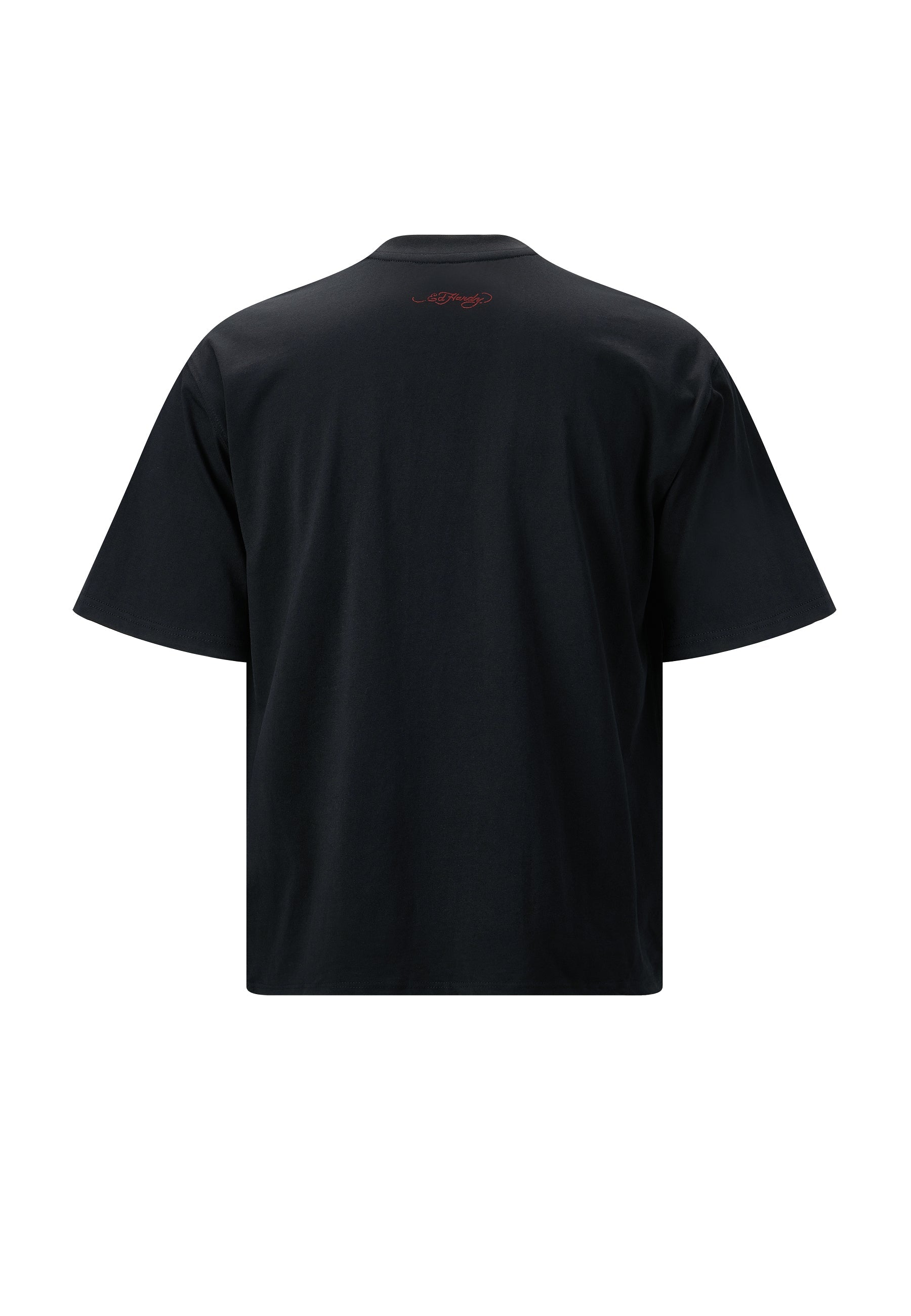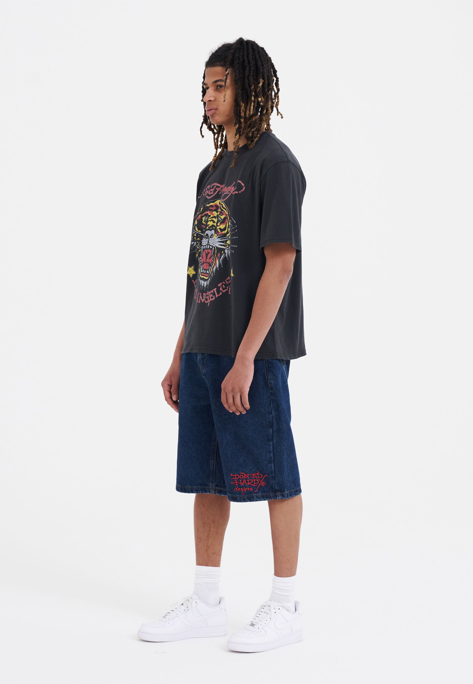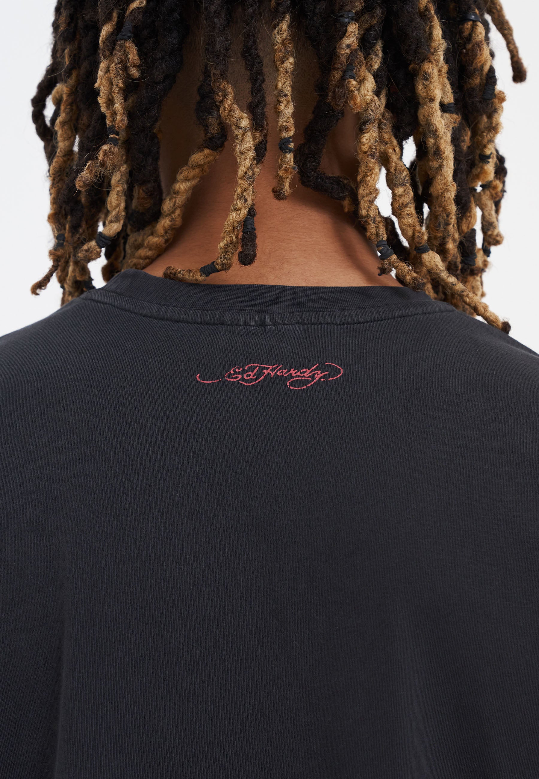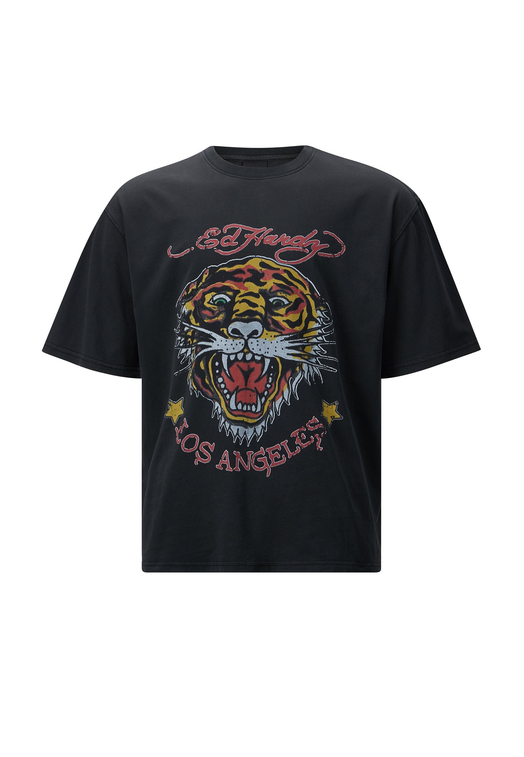 Med et levende, heftig LA tiger-trykk sentralt plassert foran og en rød variant av den ikoniske Ed Hardy-logoen over, kombinerer denne vasket-svarte T-skjorten vintage tatoveringsdesign med moderne stil.
