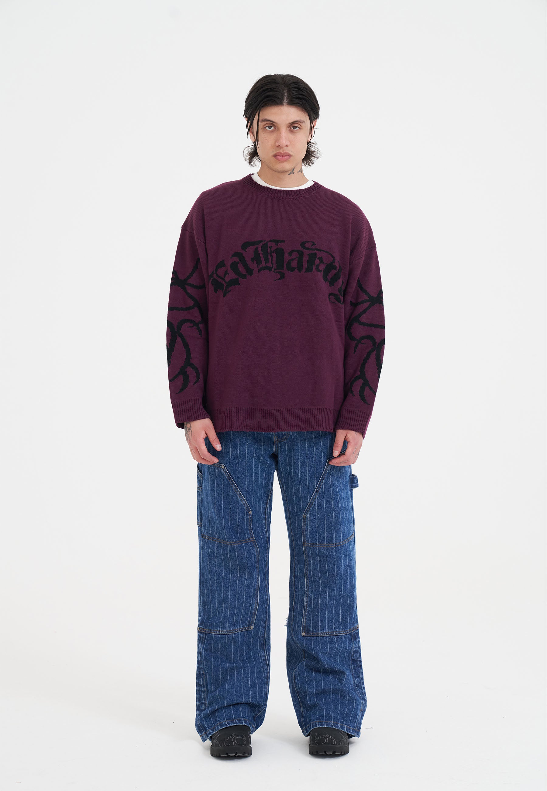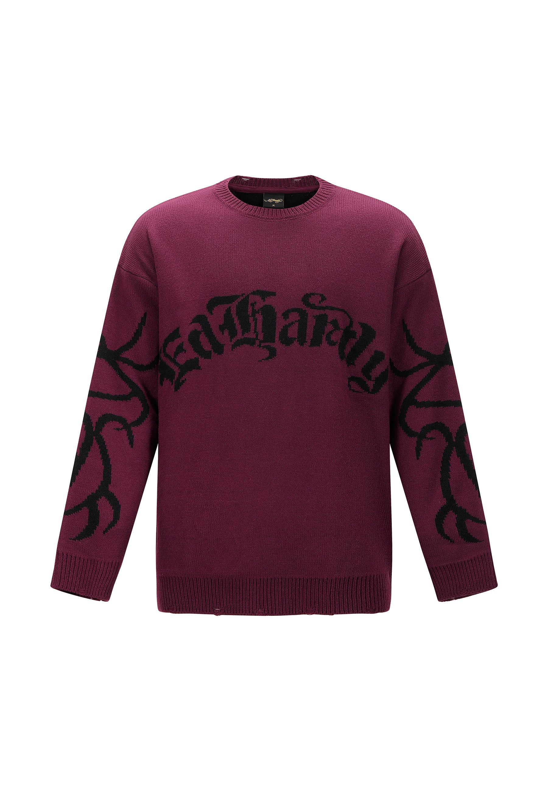 MENS INTARSIA DRAGON AND TATTOO KNITTED CREW JUMPER in Burgundy