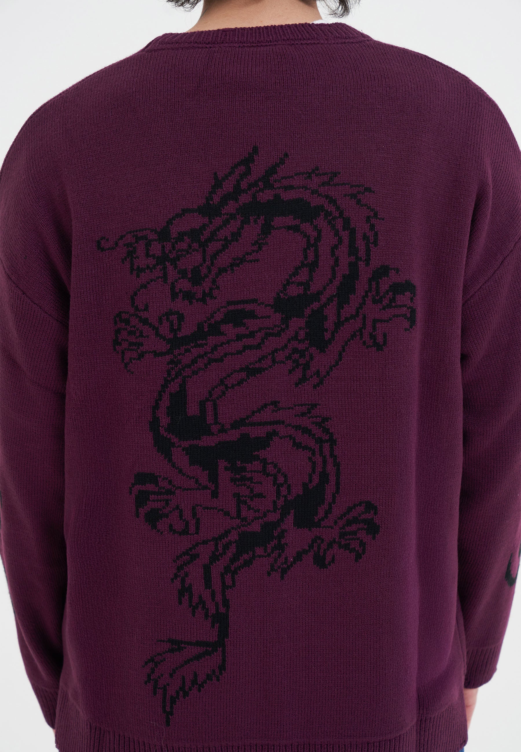 Mens Intarsia Tattoo Dragon Knitted Crew Jumper - Burgundy