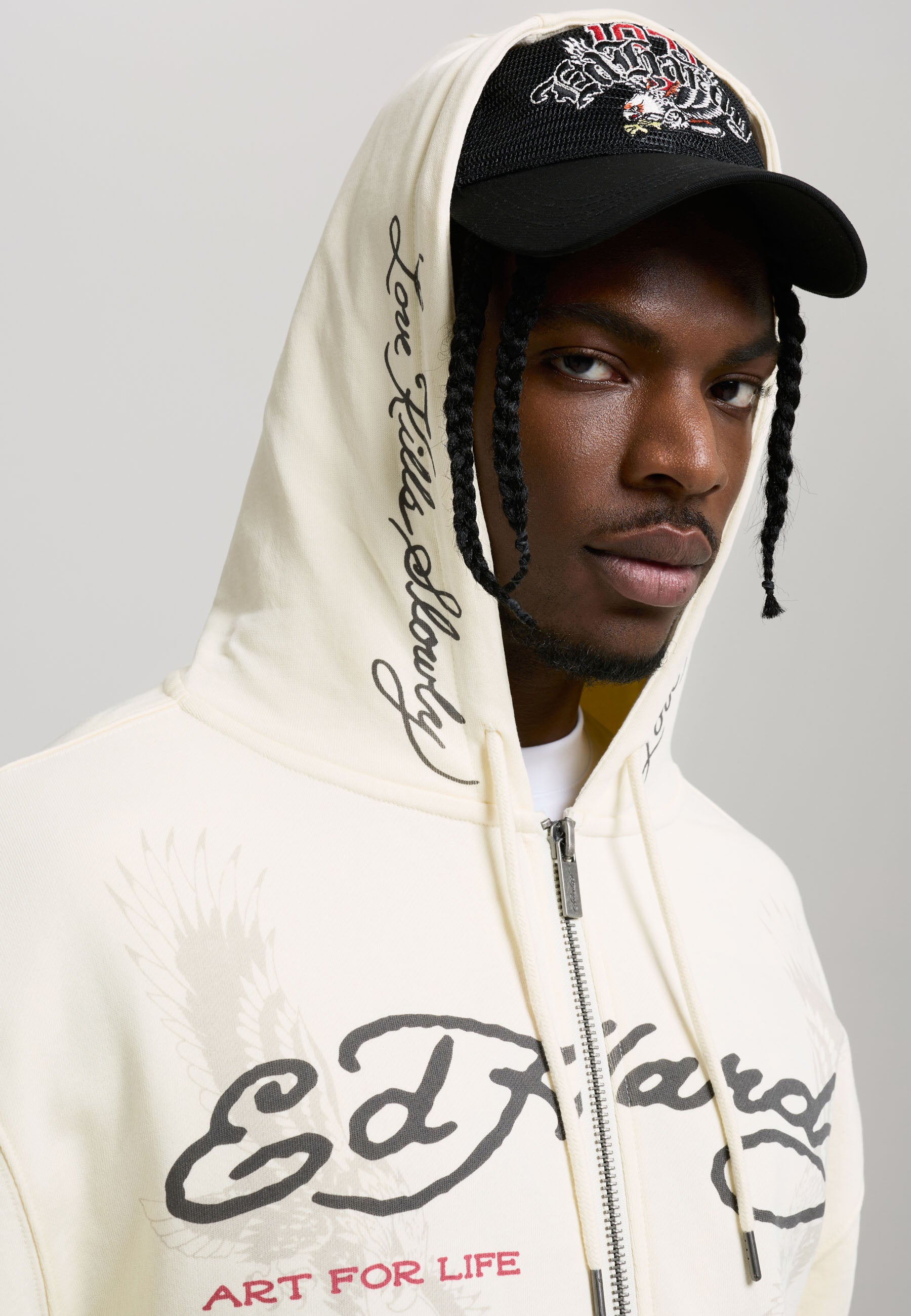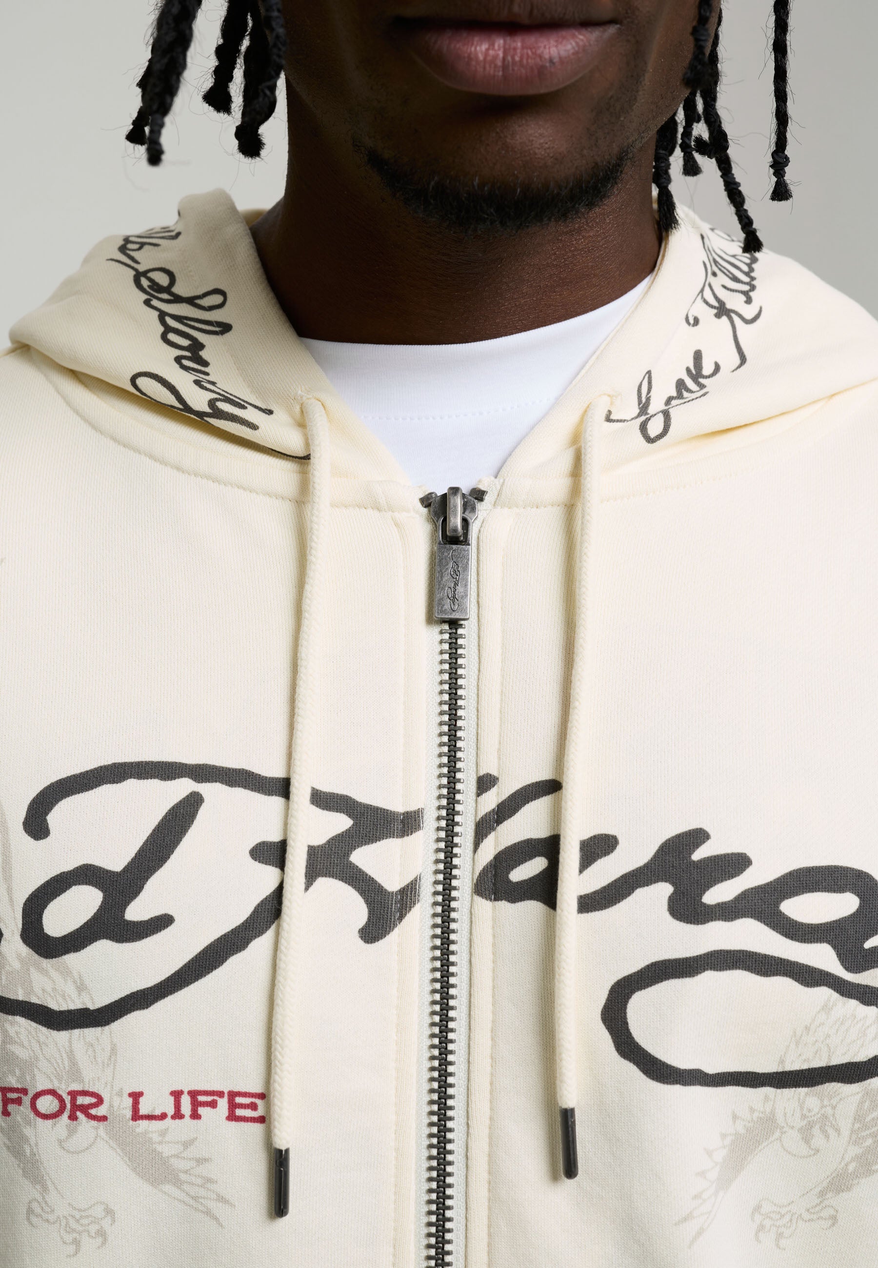 Mens Relaxed Art For Life Tattoo Zip Thru Hoodie in Ecru
