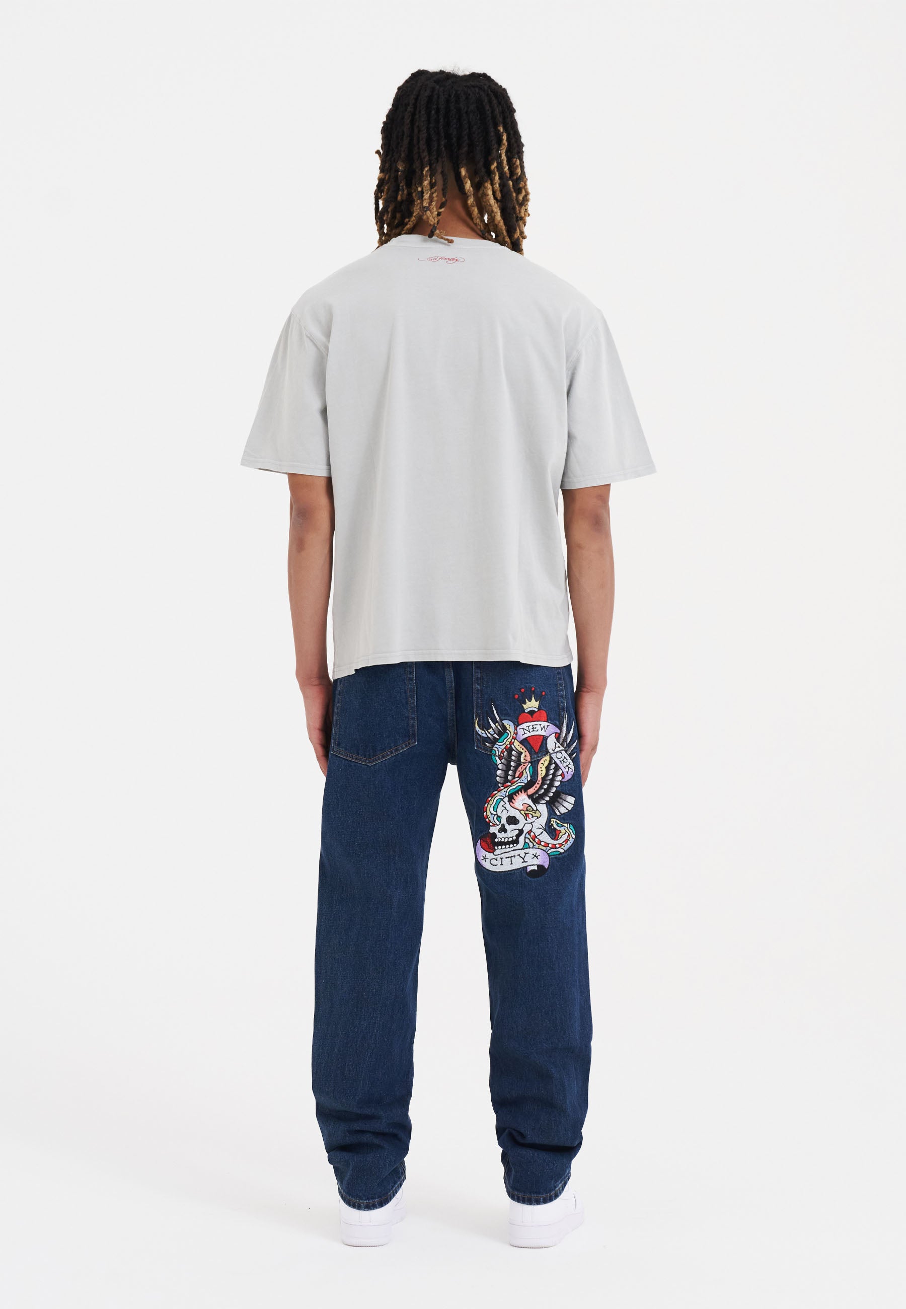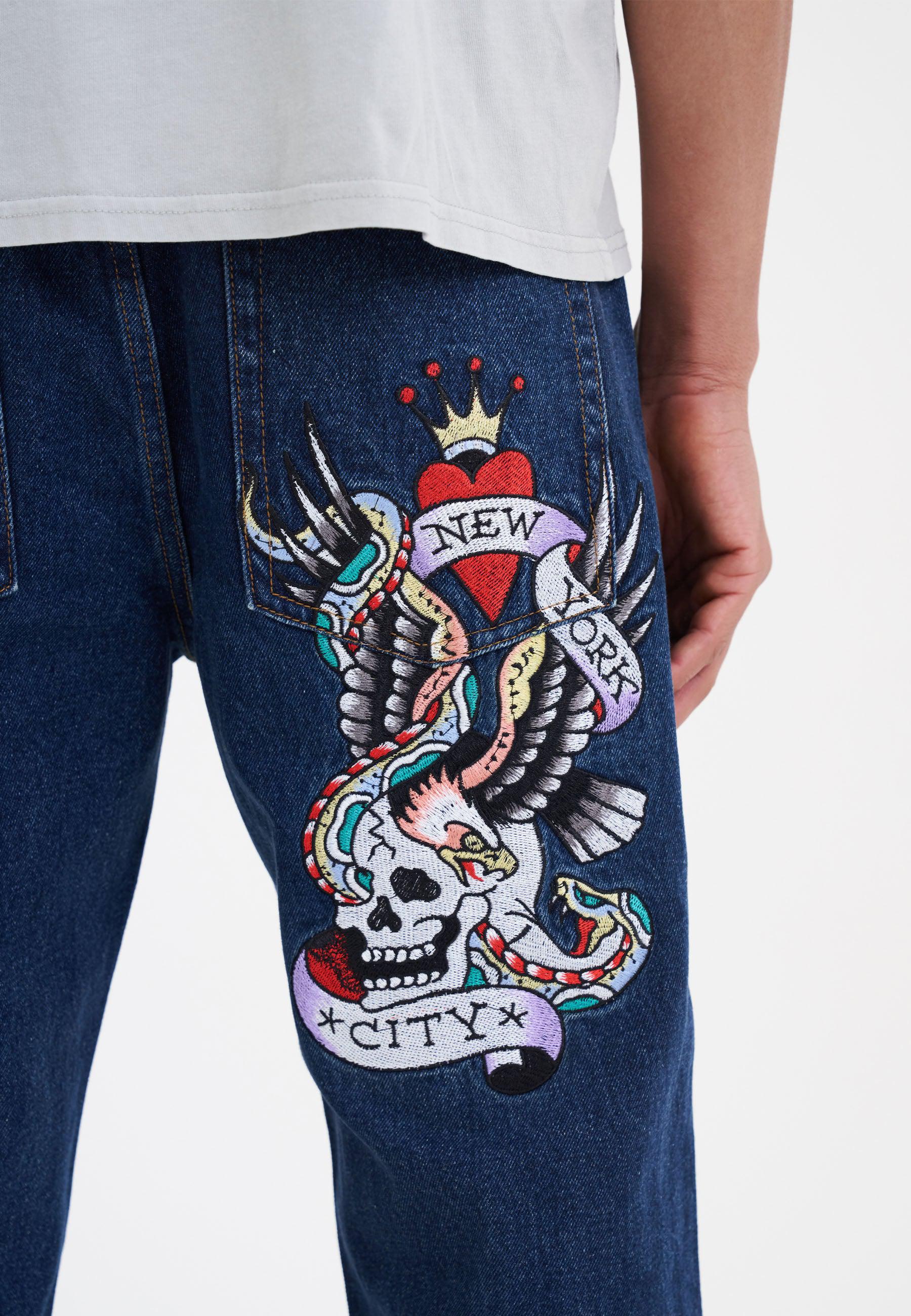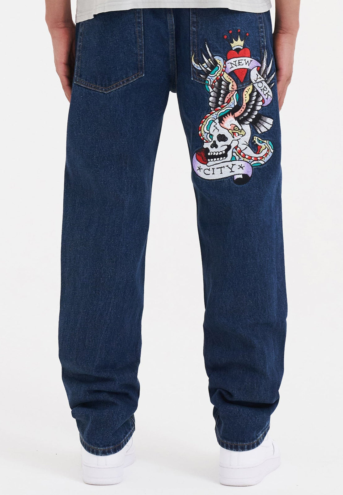 Herre Nyc-Skull Tattoo Graphic Denim Bukser Jeans - Indigo