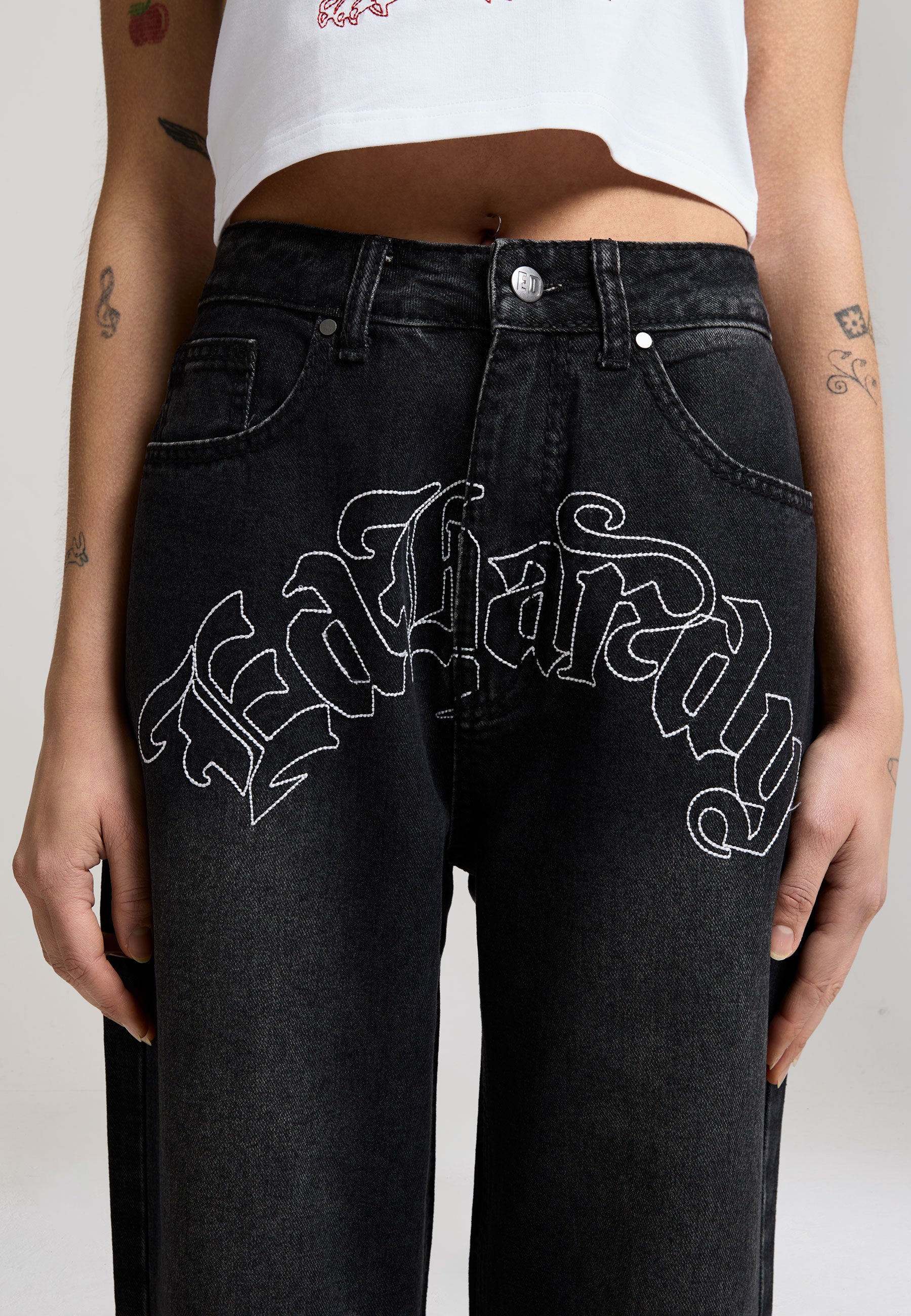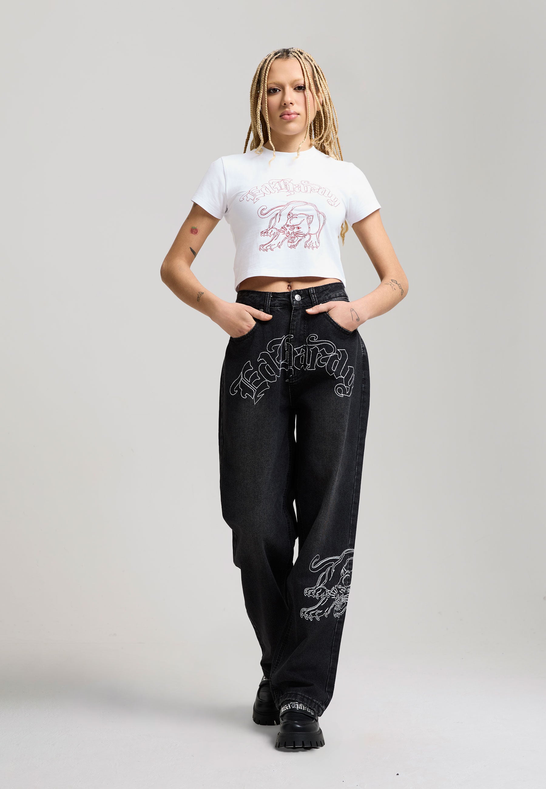 RELAXED FIT WASHED ED HARDY IN CONTRAST STITCHING TO FRONT PANTHER IN CONTRAST STITCHING ON SIDE LEG E.D.H IN CONTRAST STITCHING ON BACK POCKET 90% POLYESTER 10%COTTON