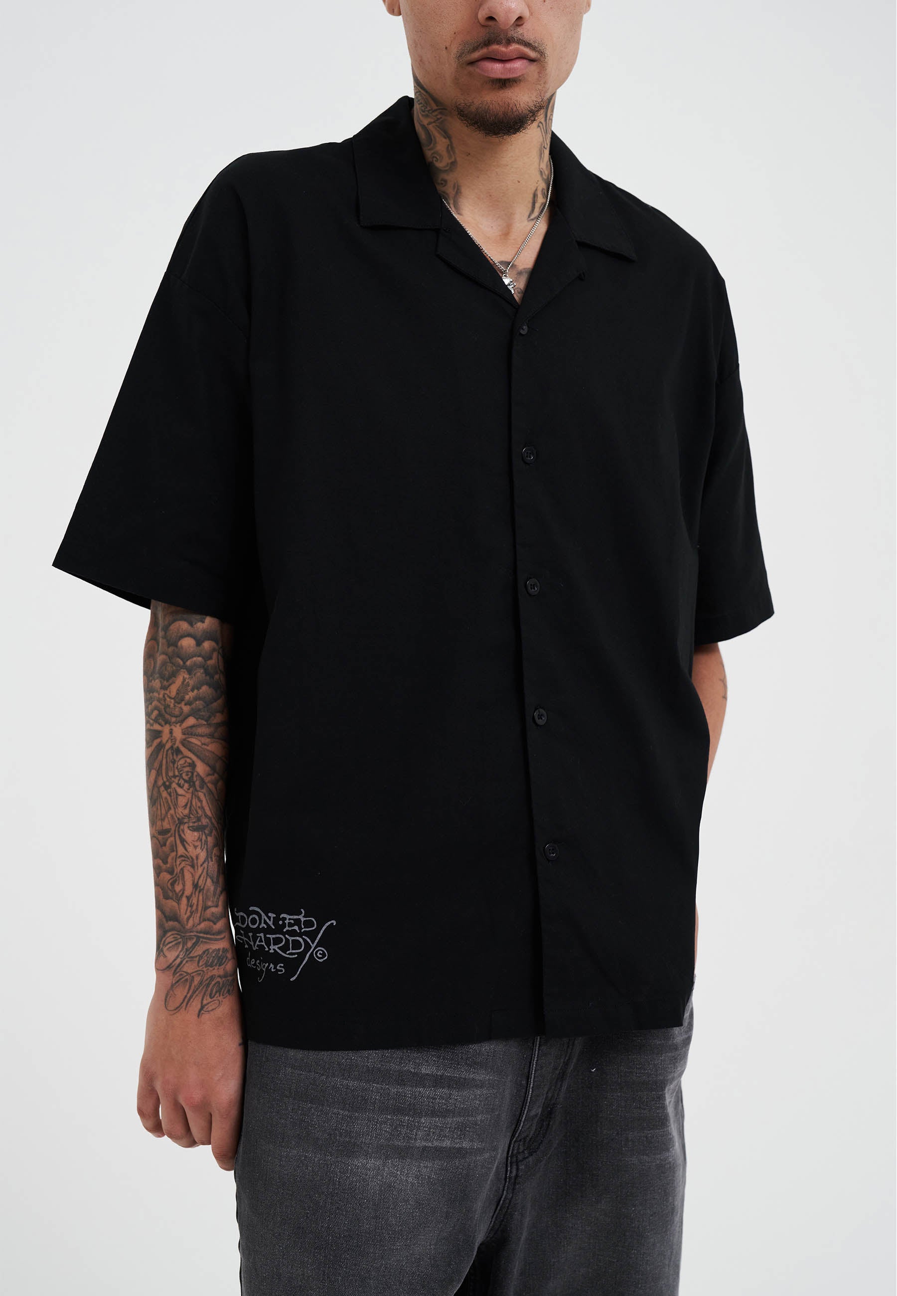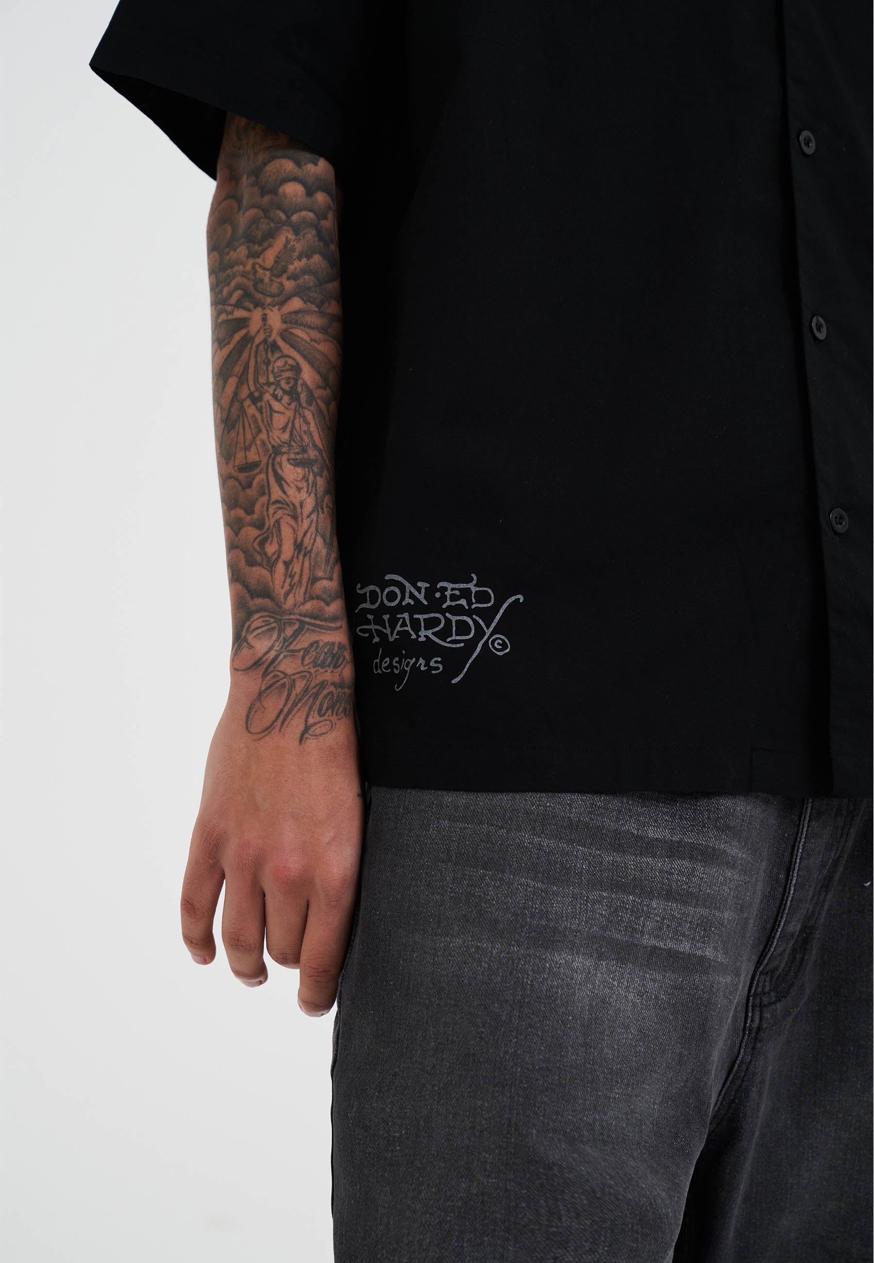 - Ed Hardy Designs logo print at the front hem