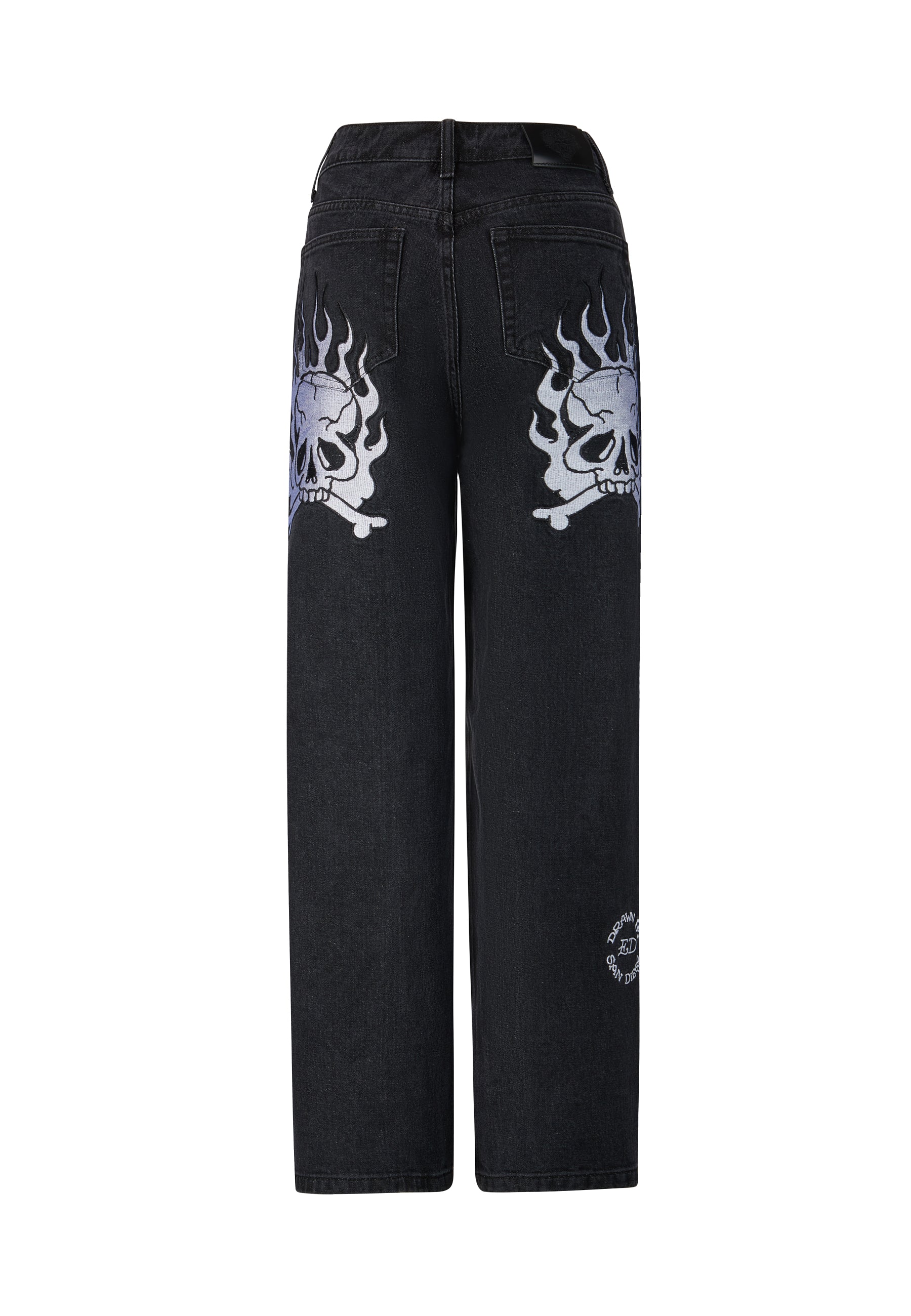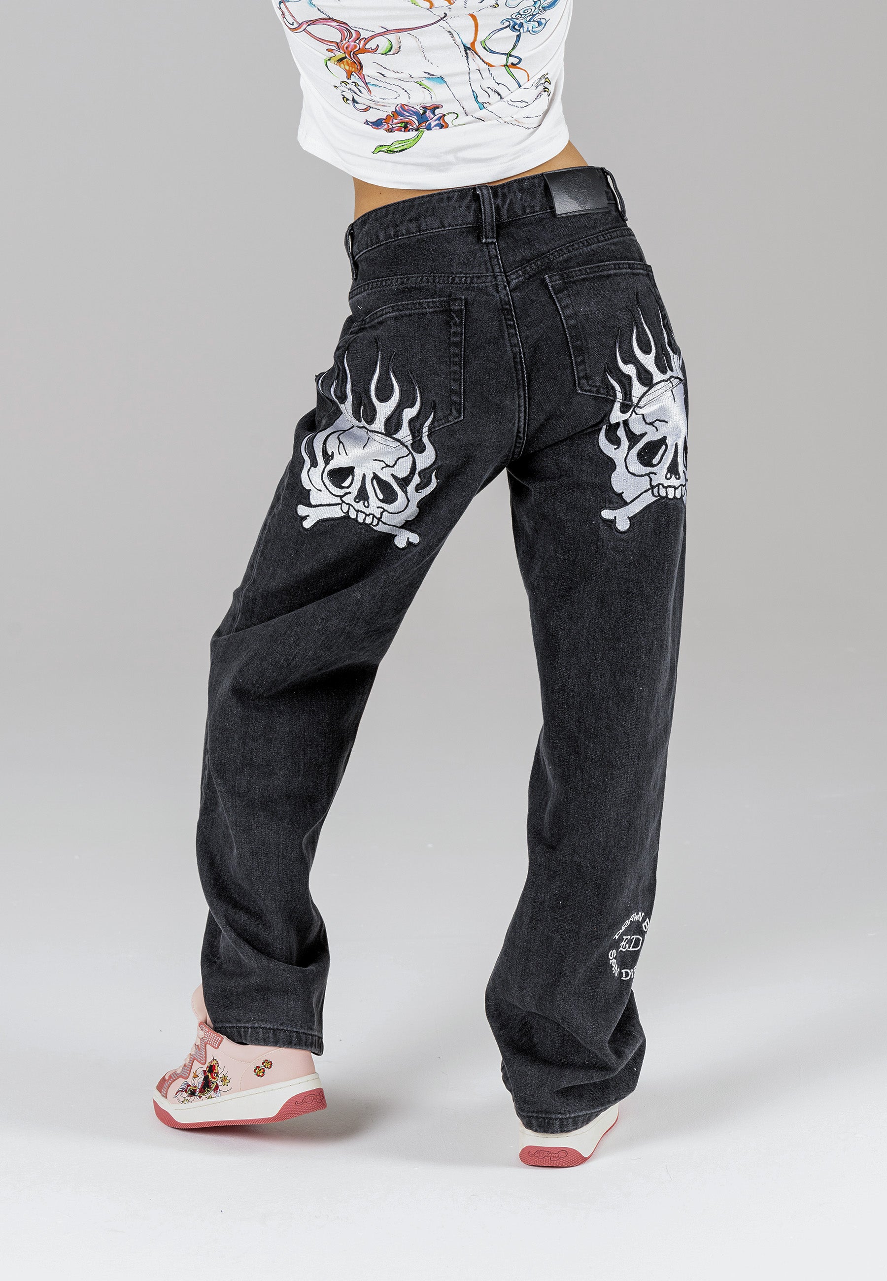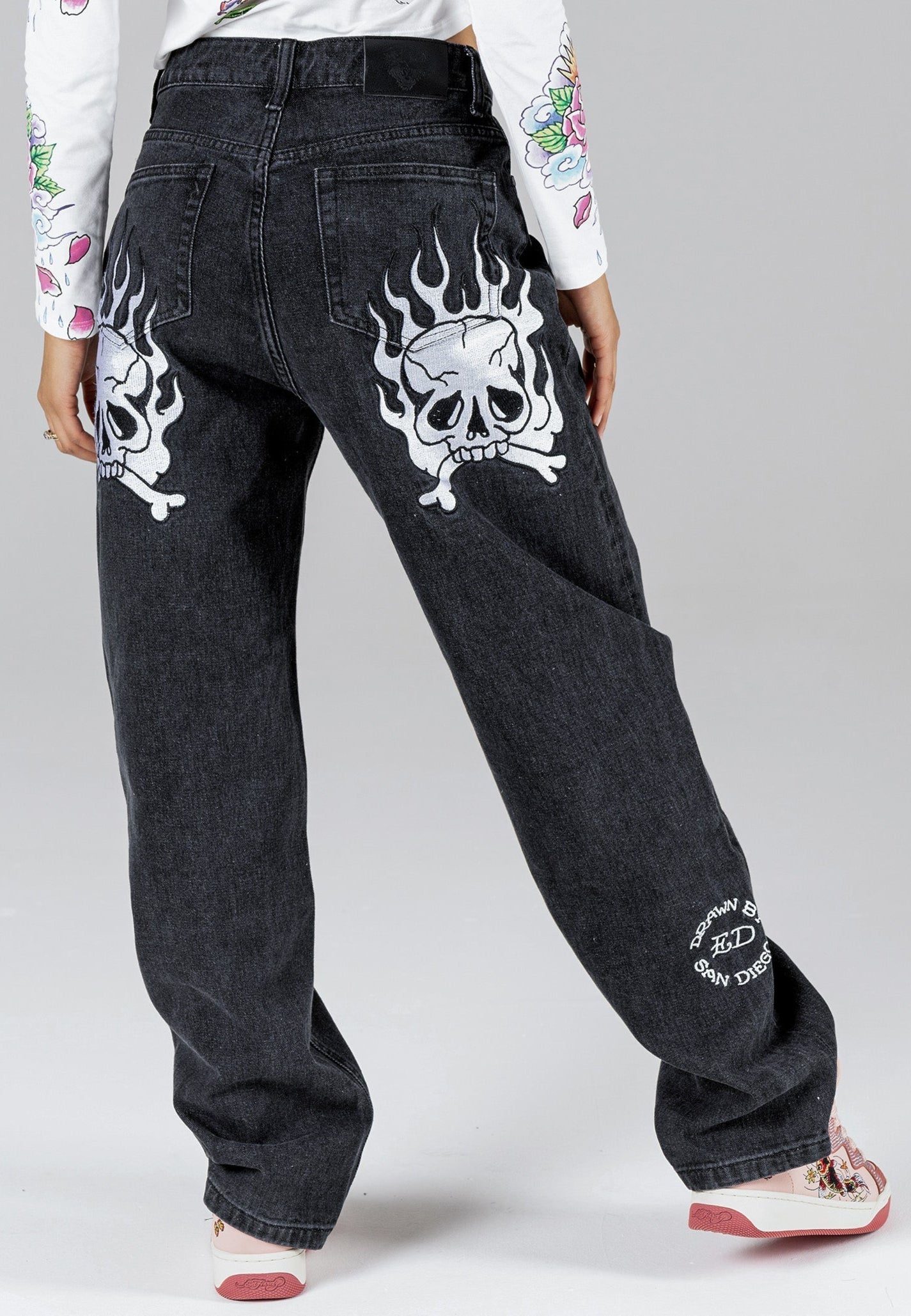 Womens Flaming Skull Relaxed Fit Denim Trousers Jeans - Black