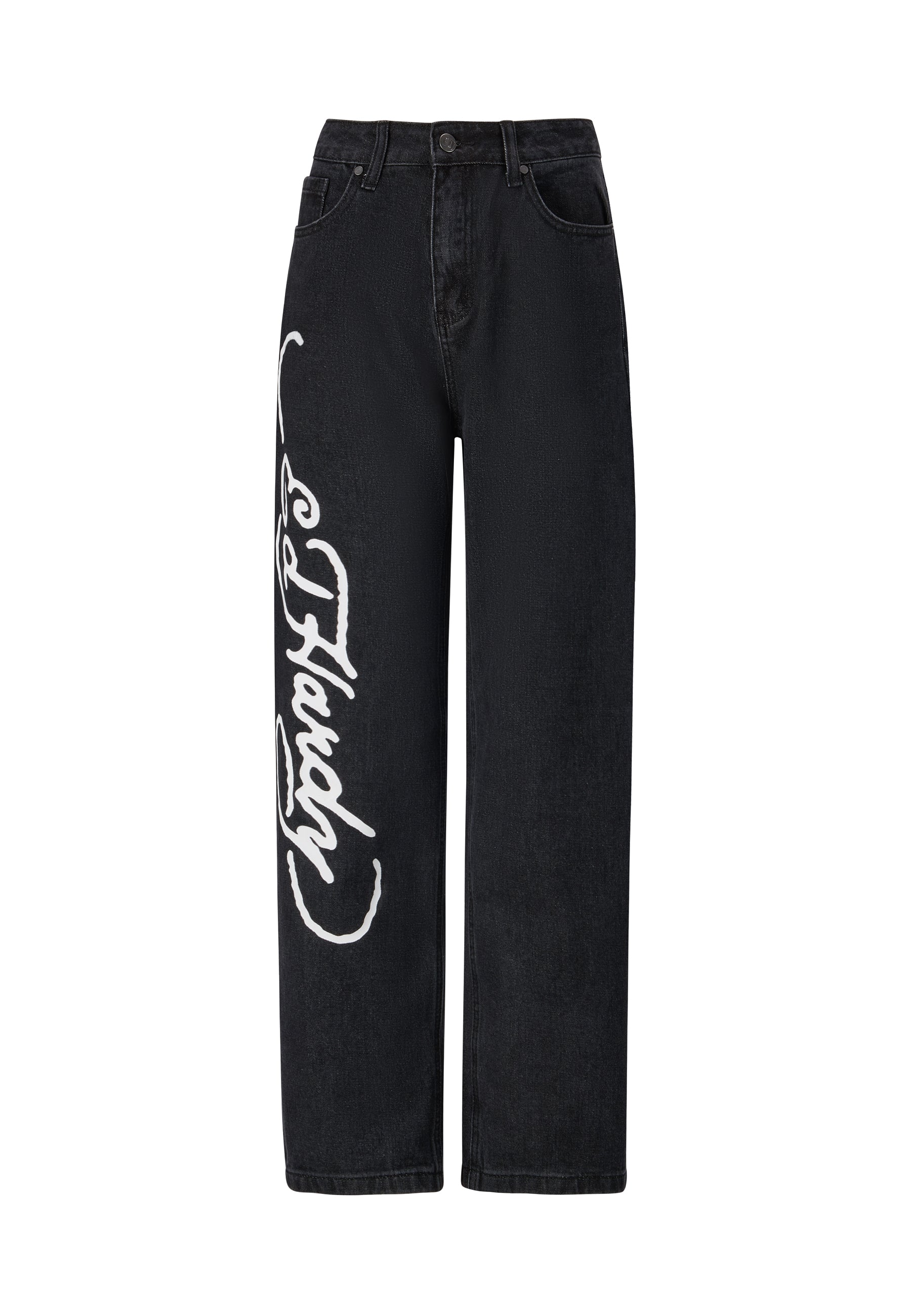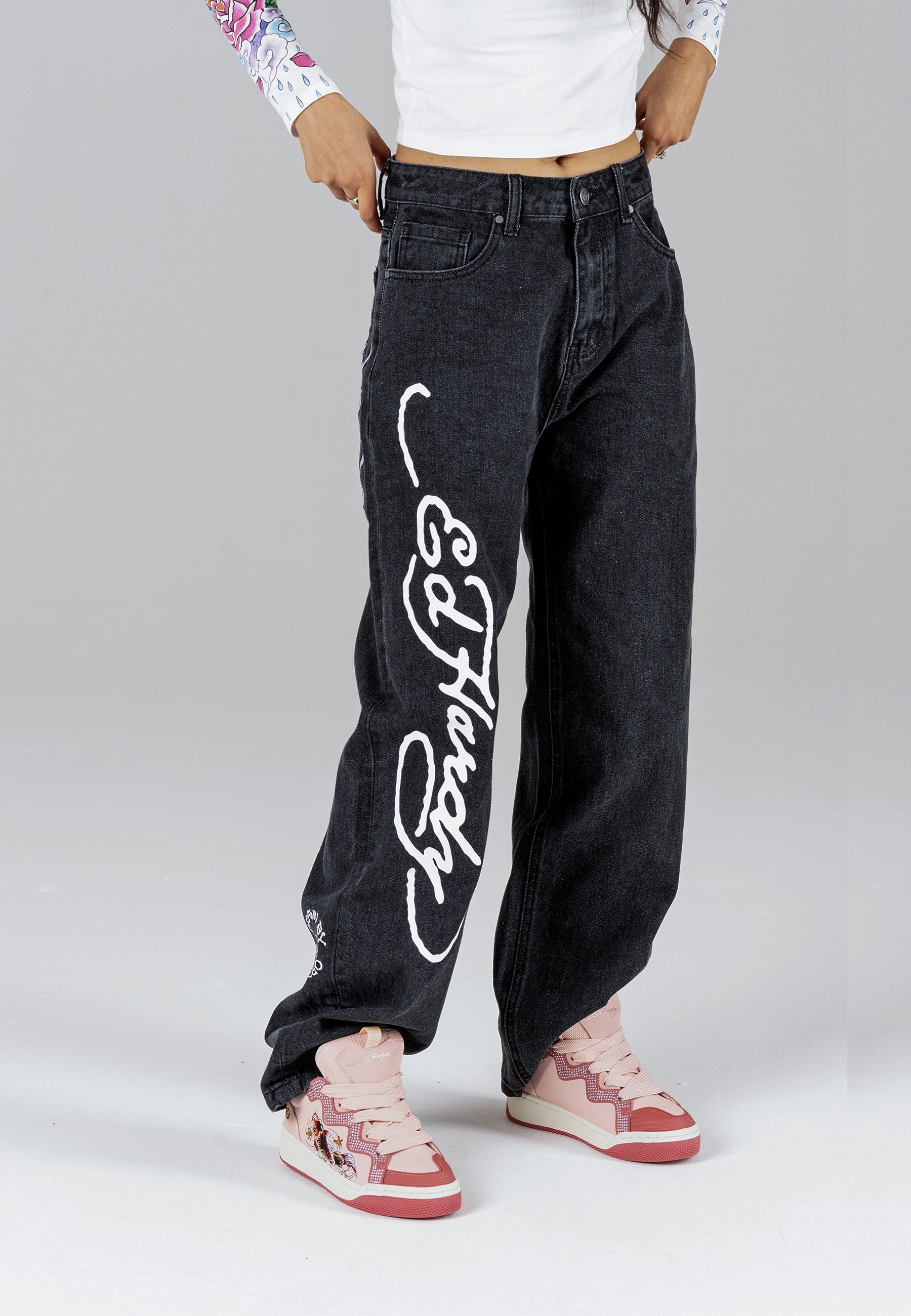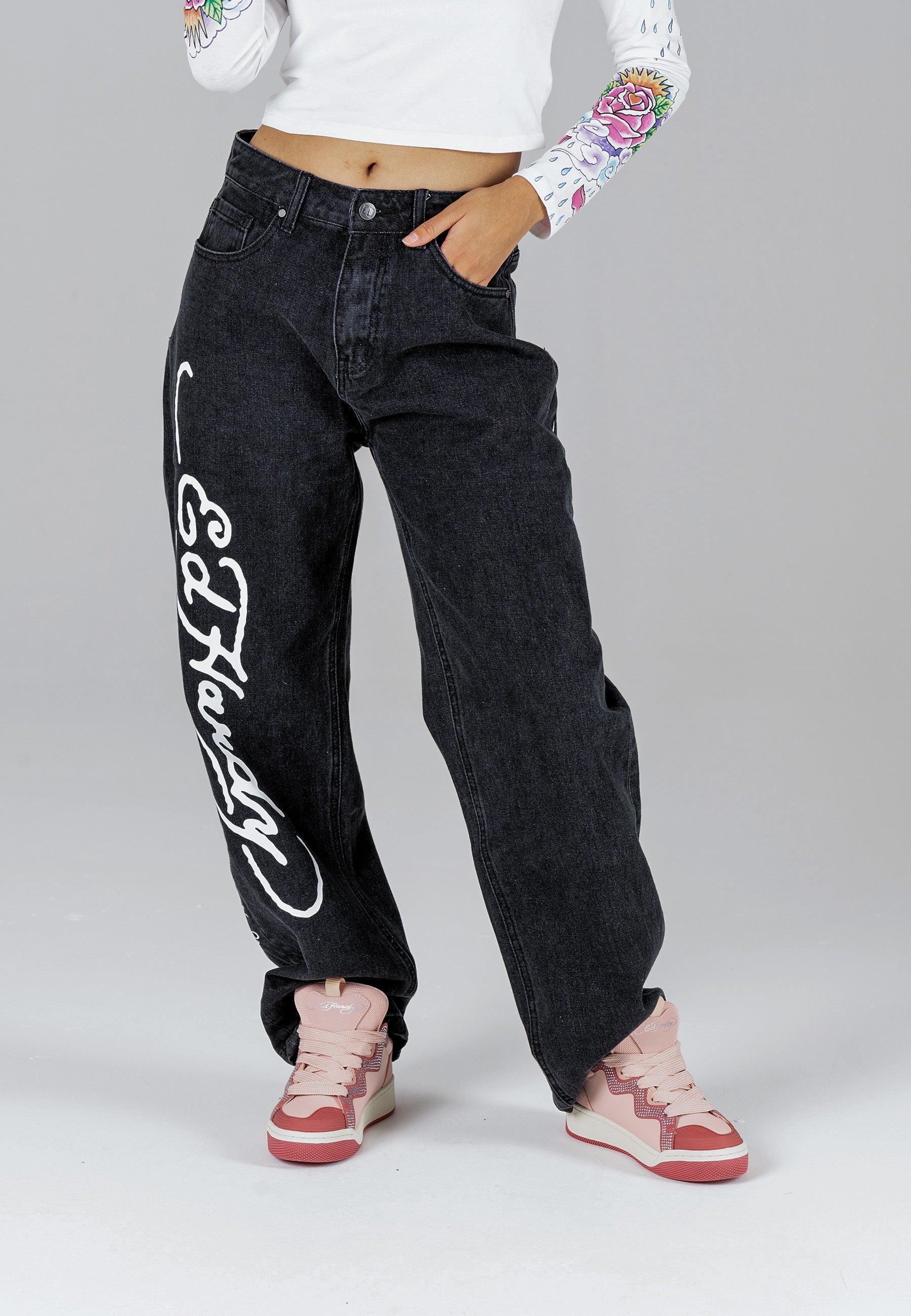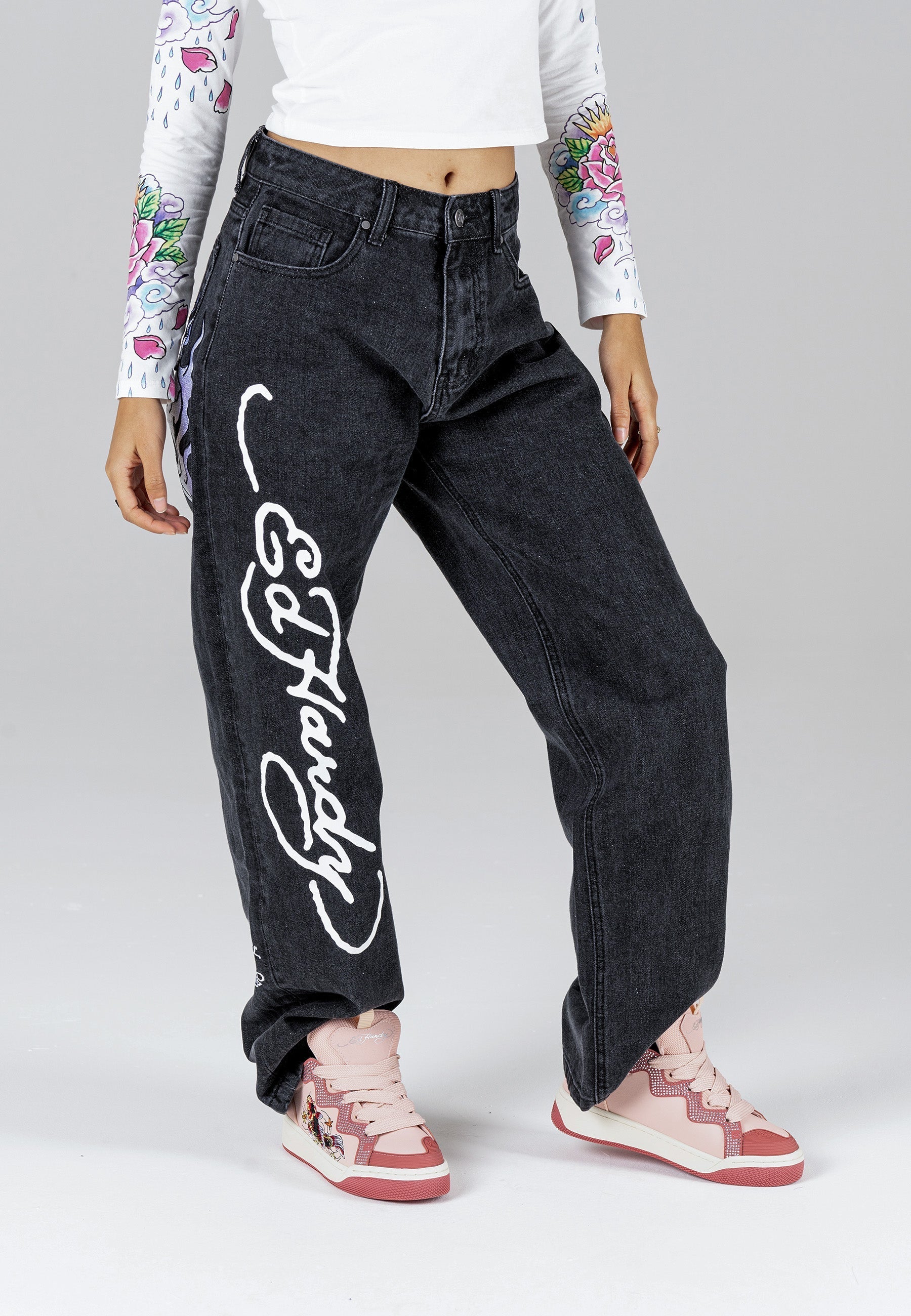 Womens Flaming Skull Relaxed Fit Denim Trousers Jeans - Black