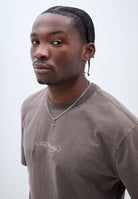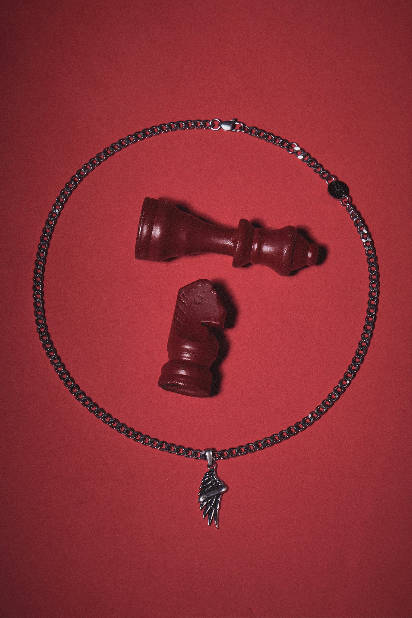 Stainless steel curb chain necklace with custom cast ED HARDY angel wing pendant with Ed Hardy scroll logo, finished in an antiqued silver finish.